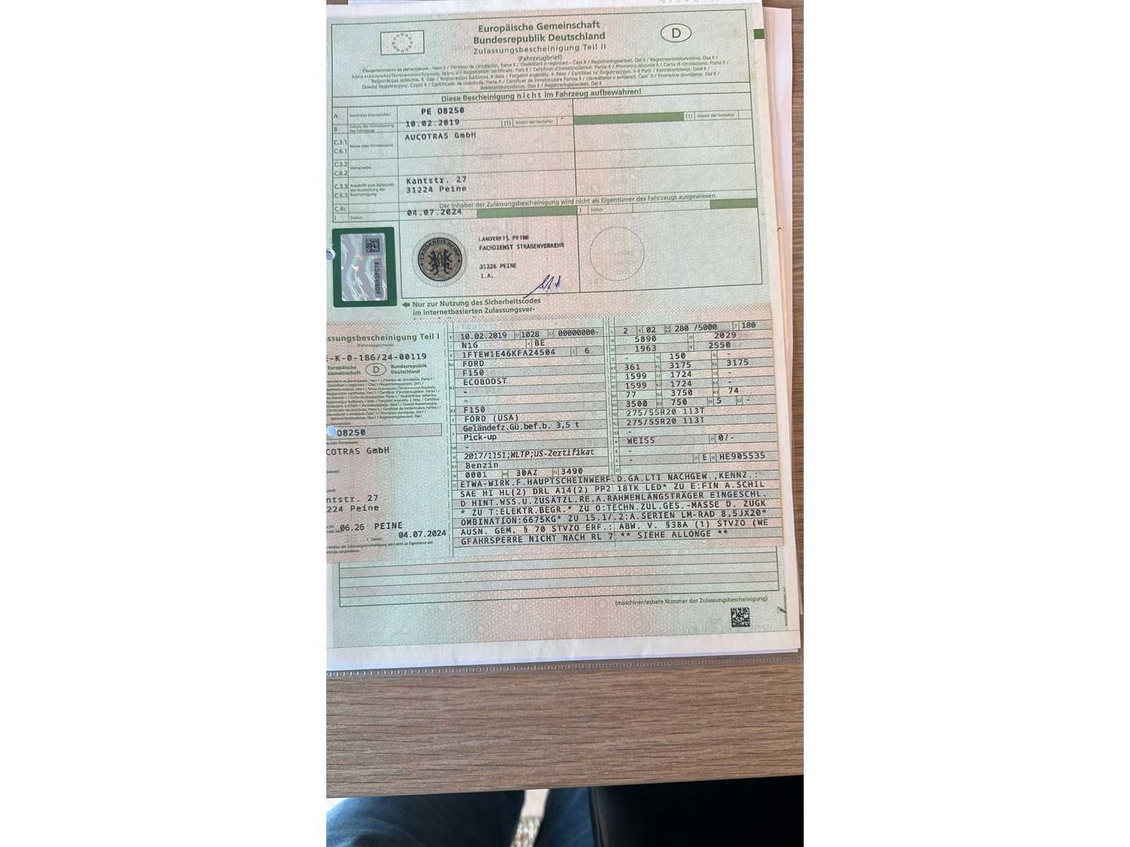 Duitse documentatie; Merk: Ford Type: F-150 Bouwjaar: 2019 Chassisnummer: 1FTE1E46KFA24504 Afgelezen kilometerstand: 51855km Brandstof: benzine Aantal zitplaatsen: 5 Aantal deuren: 4