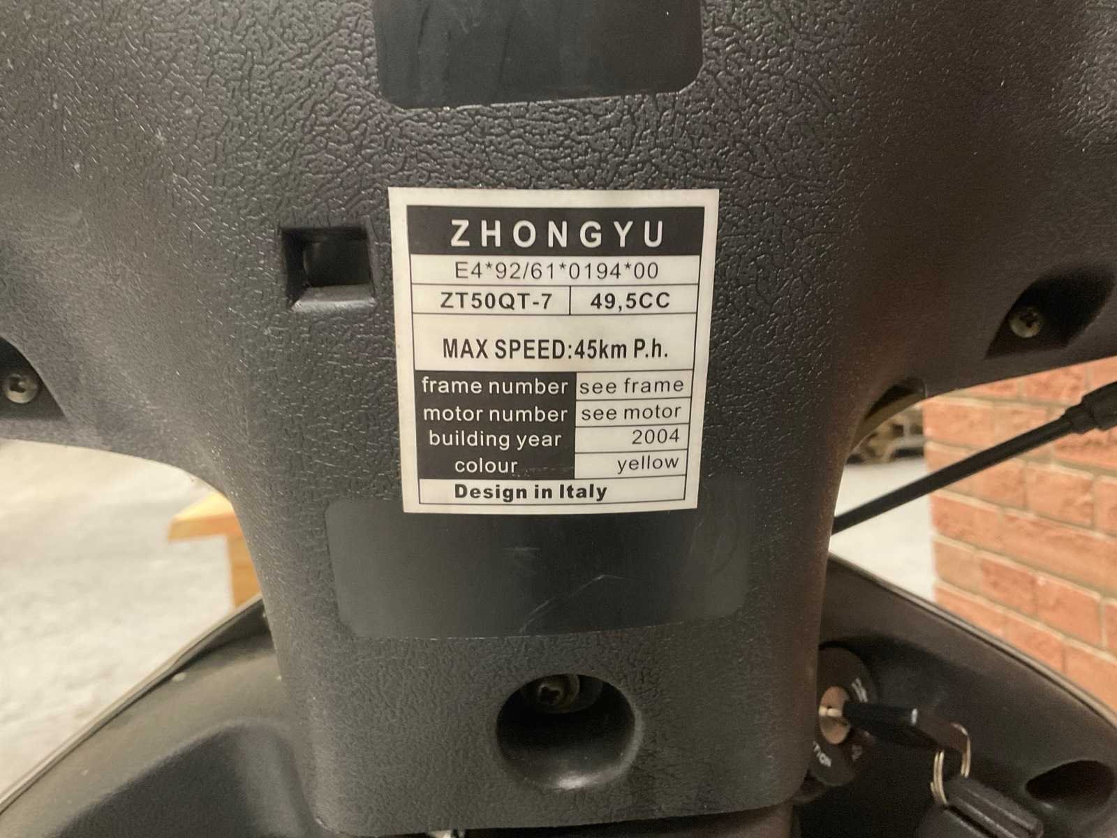 Niet getest; chassisnummer: LB5TB8S1542003348 Merk: ZHONGYU Model: ZT50QT-7 Kenteken: Geen Bouwjaar: 2004 Transmissie: Automaat Afgelezen kilometerstand: 45km