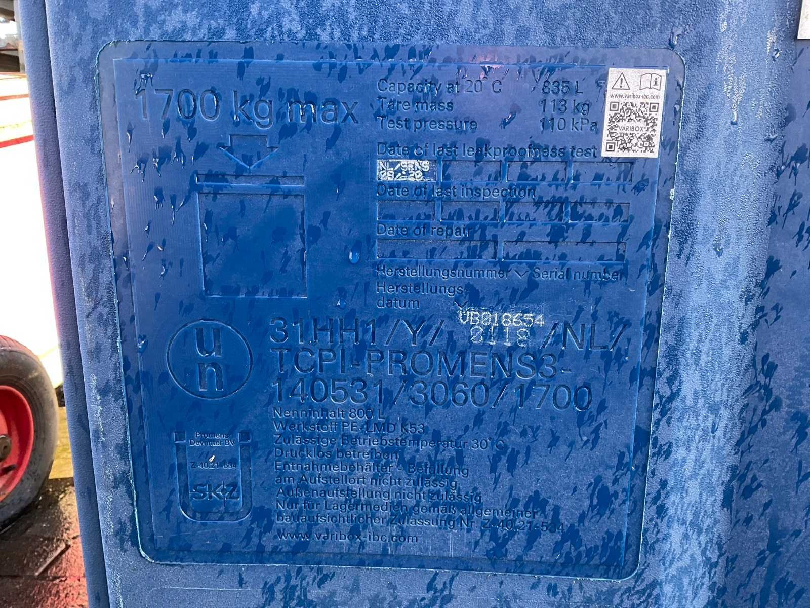 Nominale inhoud: 800 liter. Zwavelzuur opslagtank Merk: Varibox Type: TCPI-PROMENS3 Kunststof: true Afmeting l: 1200mm Afmeting b: 1000mm Afmeting h: 1160mm Eigen gewicht: 113kg