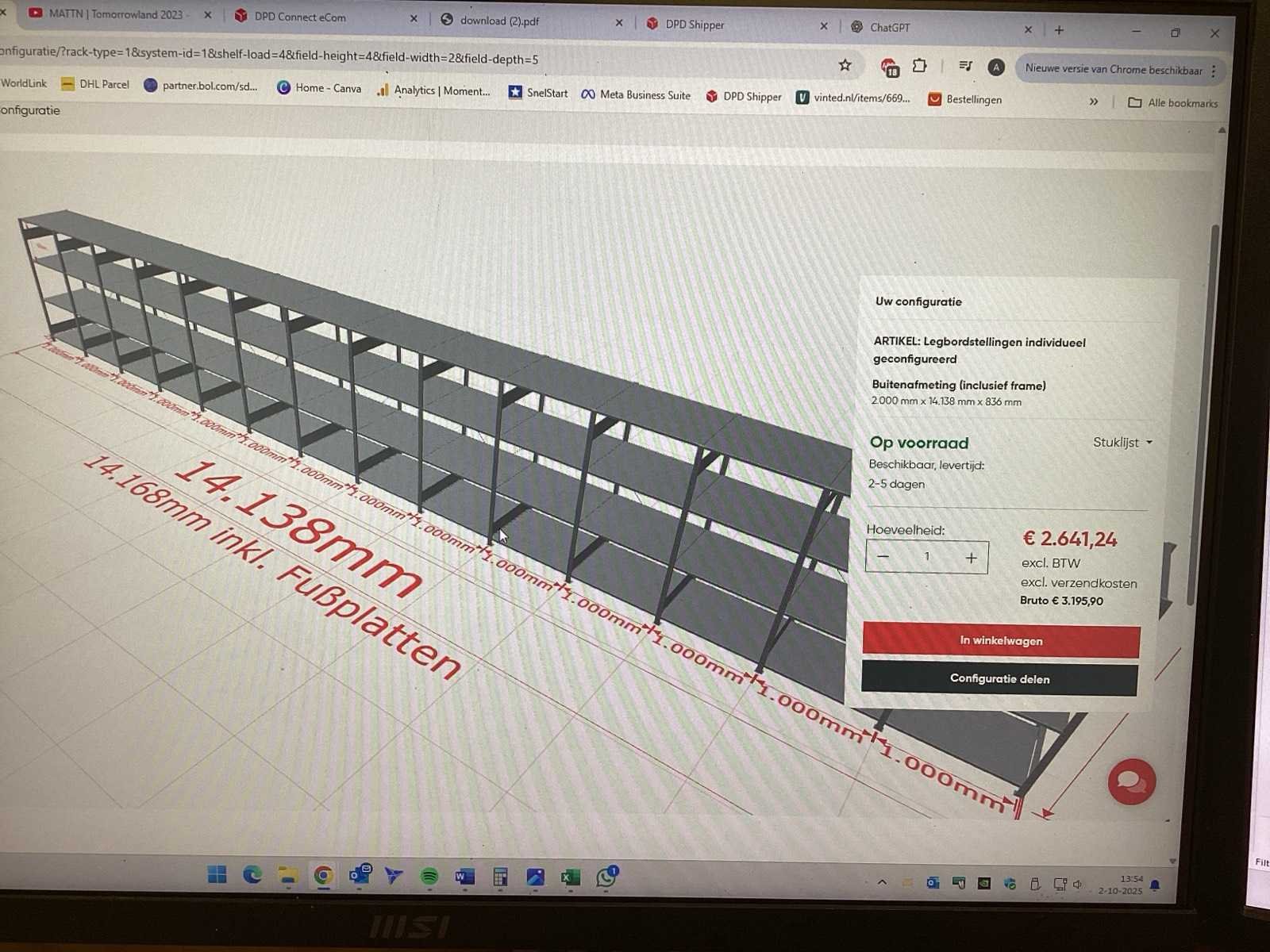 Merk: Schulte Aantal secties: 42 Sectie afm. b: 1000mm Sectie diepte: 800mm Sectie afm. h: 600mm Aantal staanders: 30 Aantal legborden: 56 Demontabel: true Totale afmeting L: 836cm Totale afmeting Breedte: 1413cm Totale afmeting Hoogte: 200cm