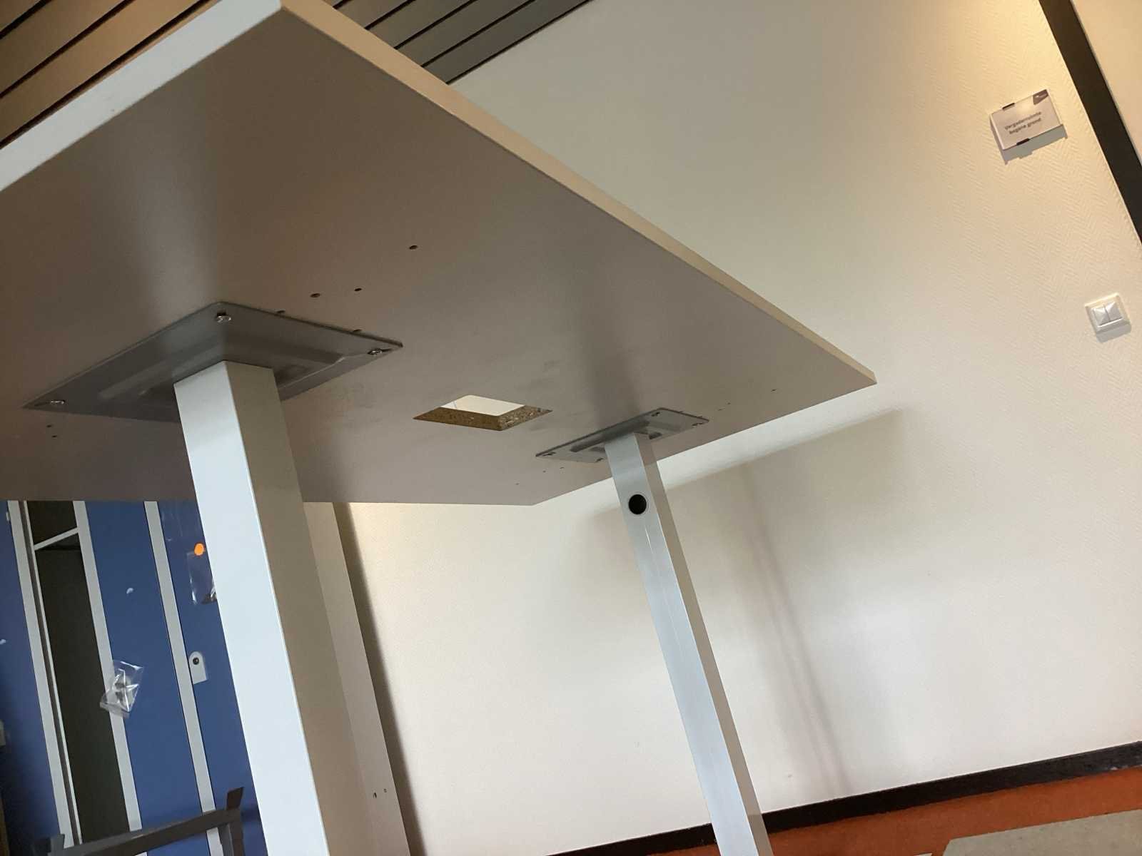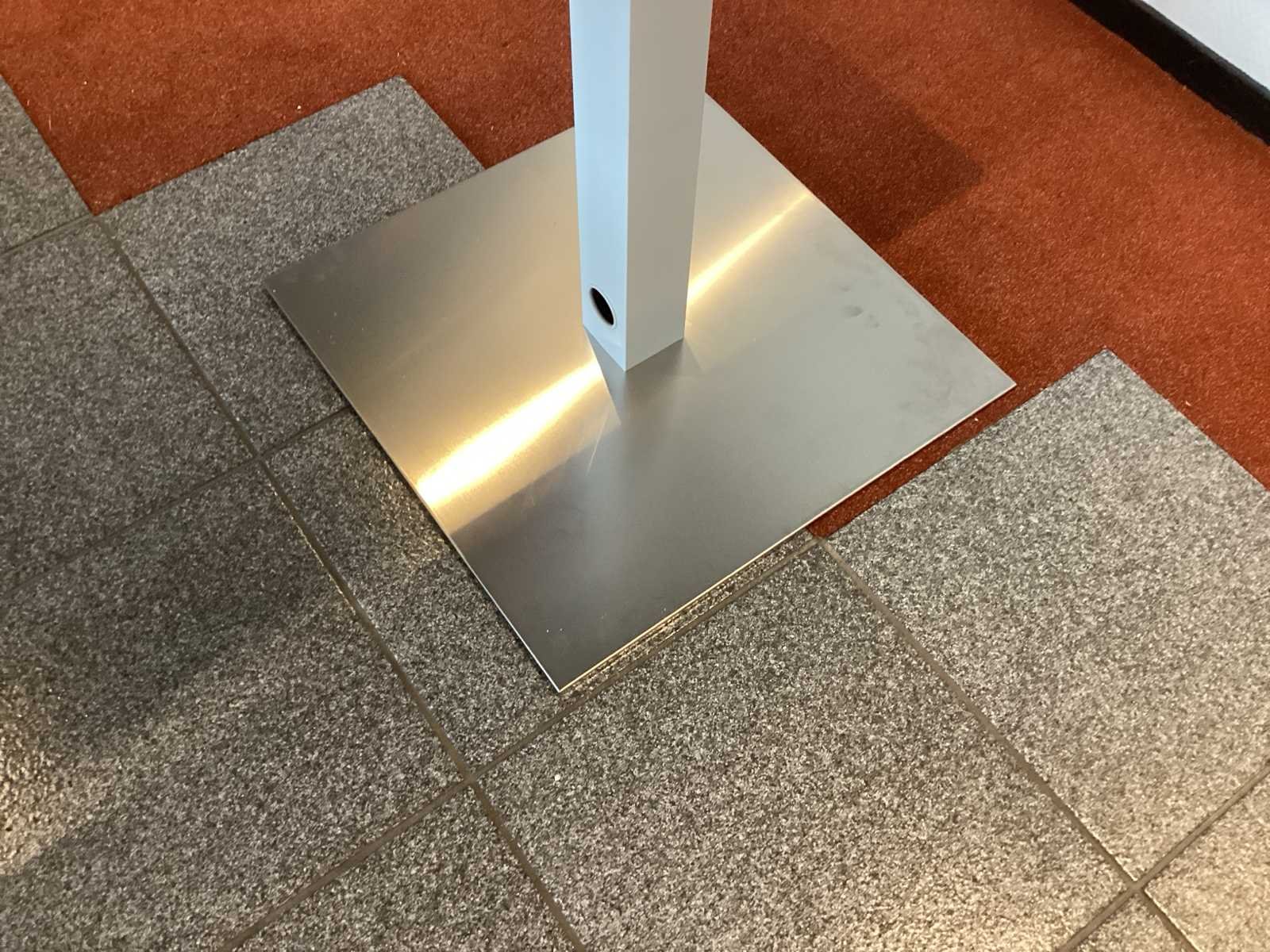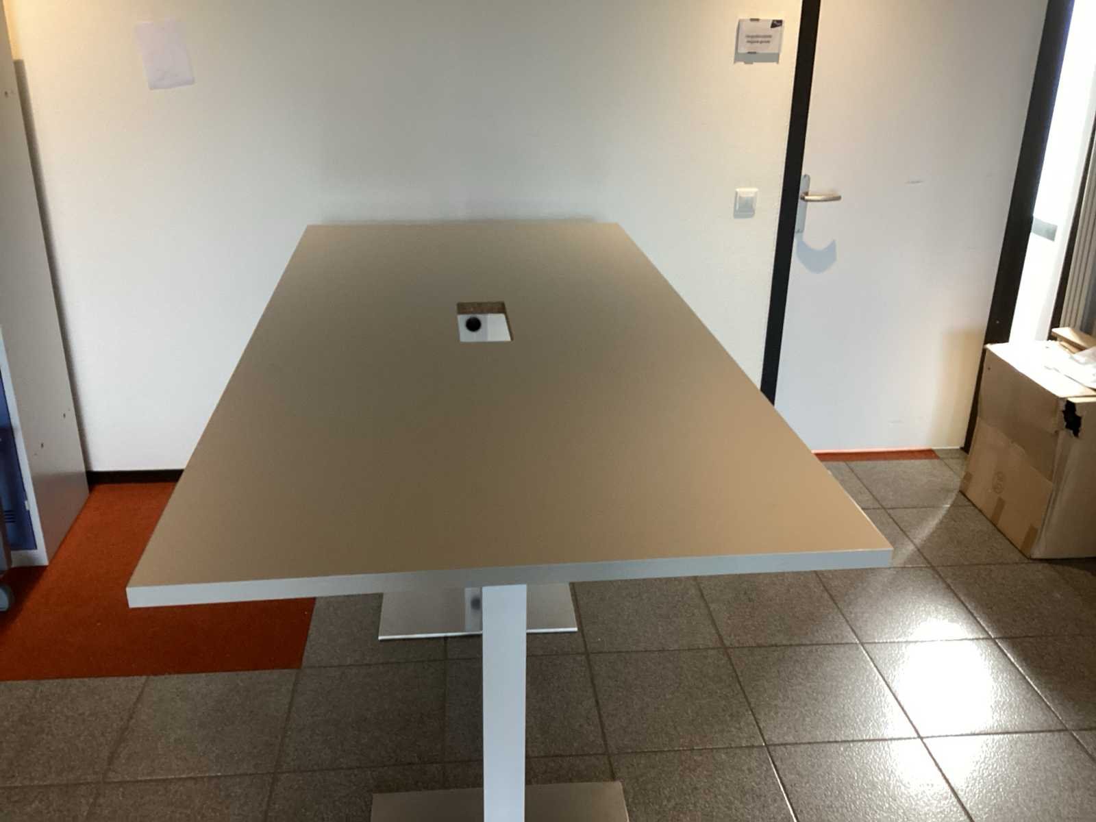 Grijs blad; witte poten; rvs voet; zware tafel; gat in de midden; zonder passende deksel; Merk: Manutan Model: Verkoop sta tafel Kleur: Grijs Lengte: 210cm Breedte: 100cm Hoogte: 107cm