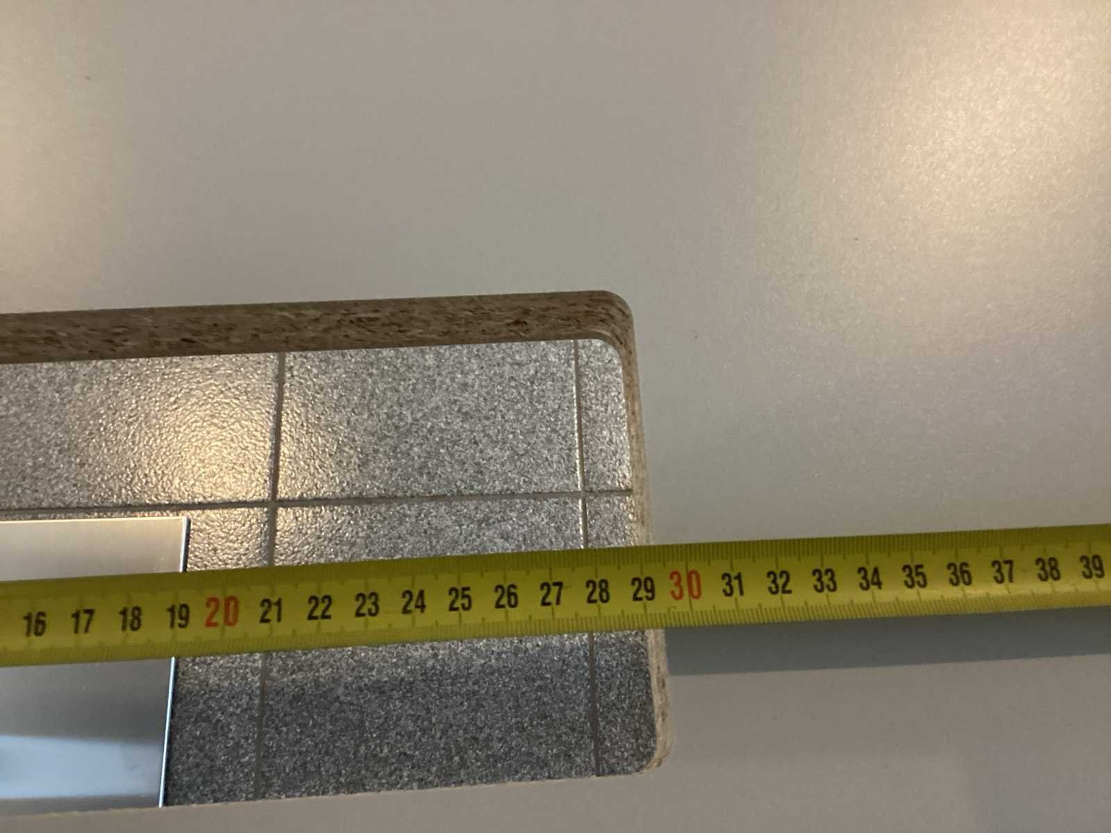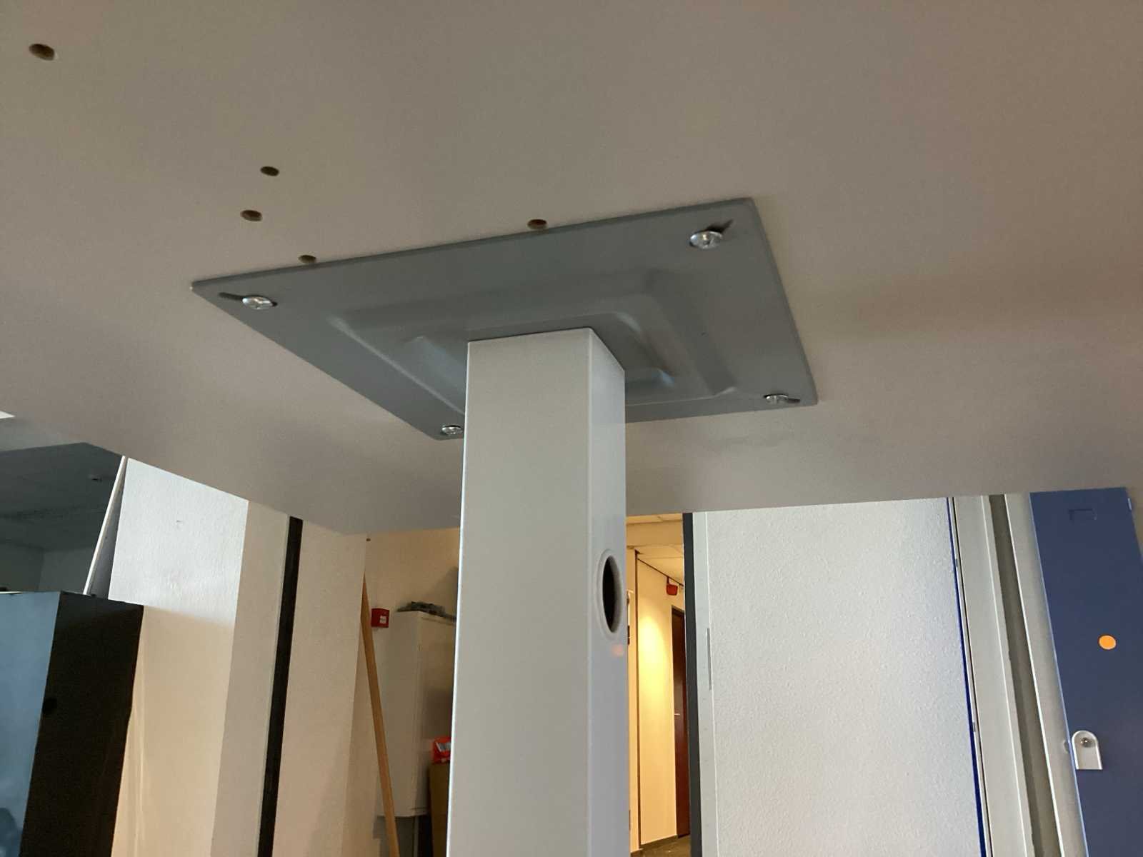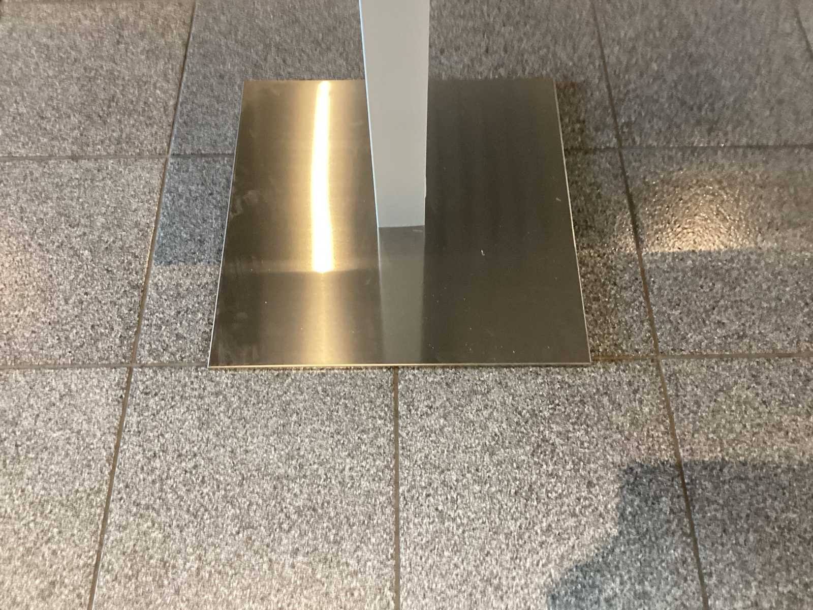 Grijs blad; witte poten; rvs voet; zware tafel; gat in de midden; zonder passende deksel; Merk: Manutan Model: Verkoop sta tafel Kleur: Grijs Lengte: 210cm Breedte: 100cm Hoogte: 107cm