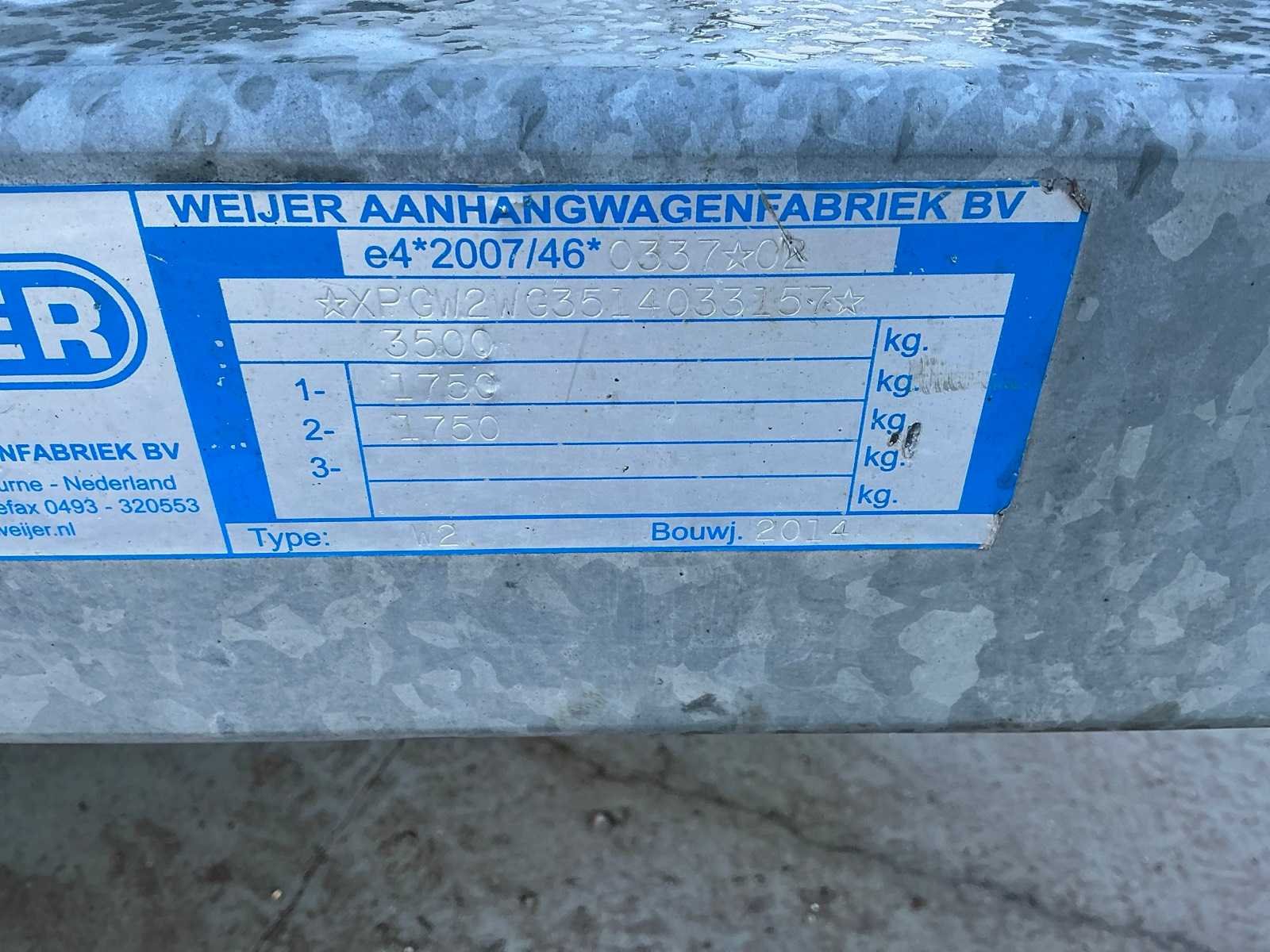 Voorzien van steunpoten voor en achter Merk: Weijer Bouwjaar: 2014 Chassisnummer: XPGW2WG3514033157 Aantal assen: 2 Laadbak afmeting l: 300cm Laadbak afmeting b: 150cm Ledig gewicht: 705kg Laadvermogen: 2795kg Gesloten opbouw: true Datum eerste toelating: 2014-10-27 Datum eerste toelating (NL): 2014-10-27 Kenteken: 96-WL-KN Lengte: 435cm Nationaliteit documenten: Nederlands Zelf rijdend exporteren: Mogelijk