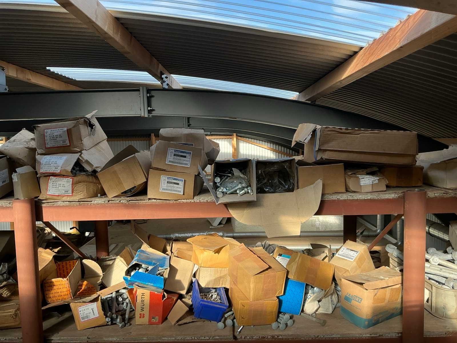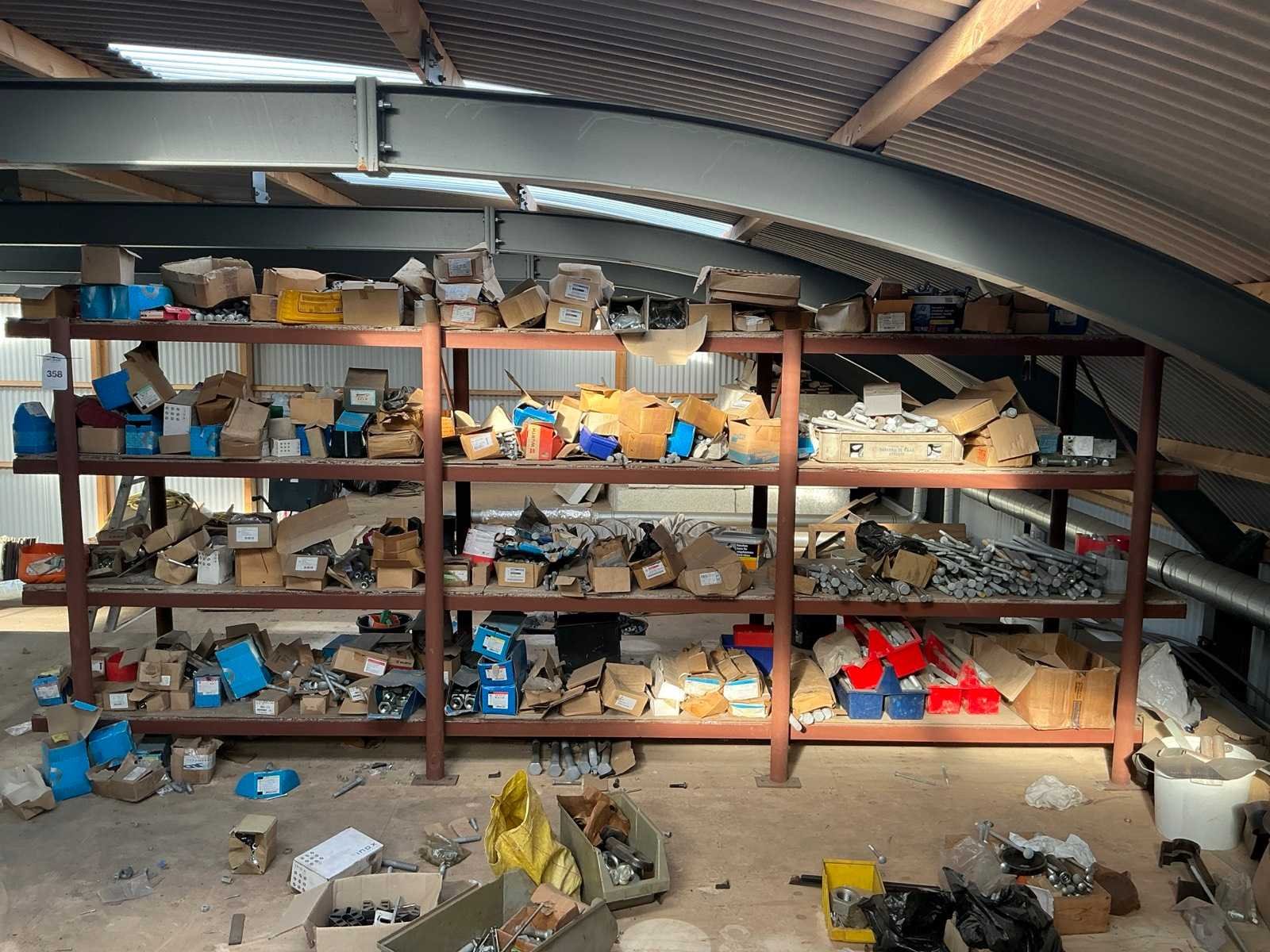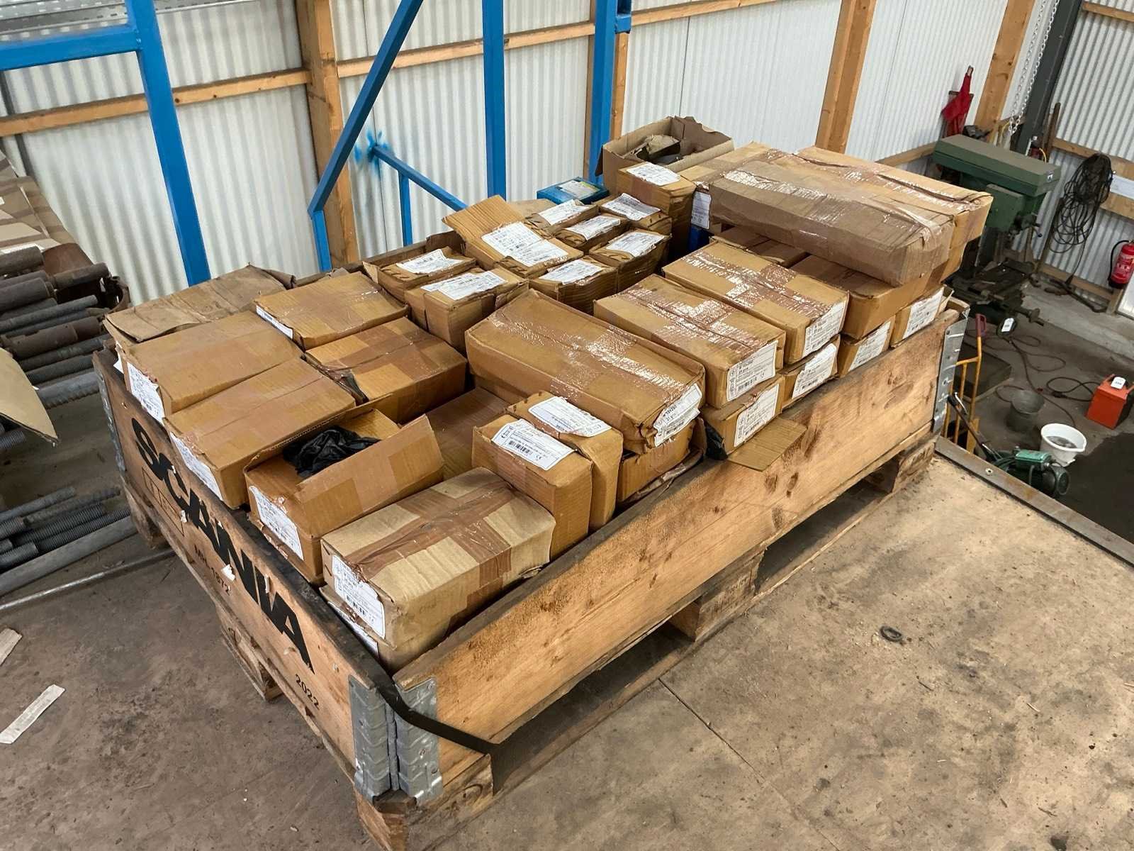 In en op 2 pallets en stellingkast. Bevindt zich op een entresol, bereikbaar middels een trap