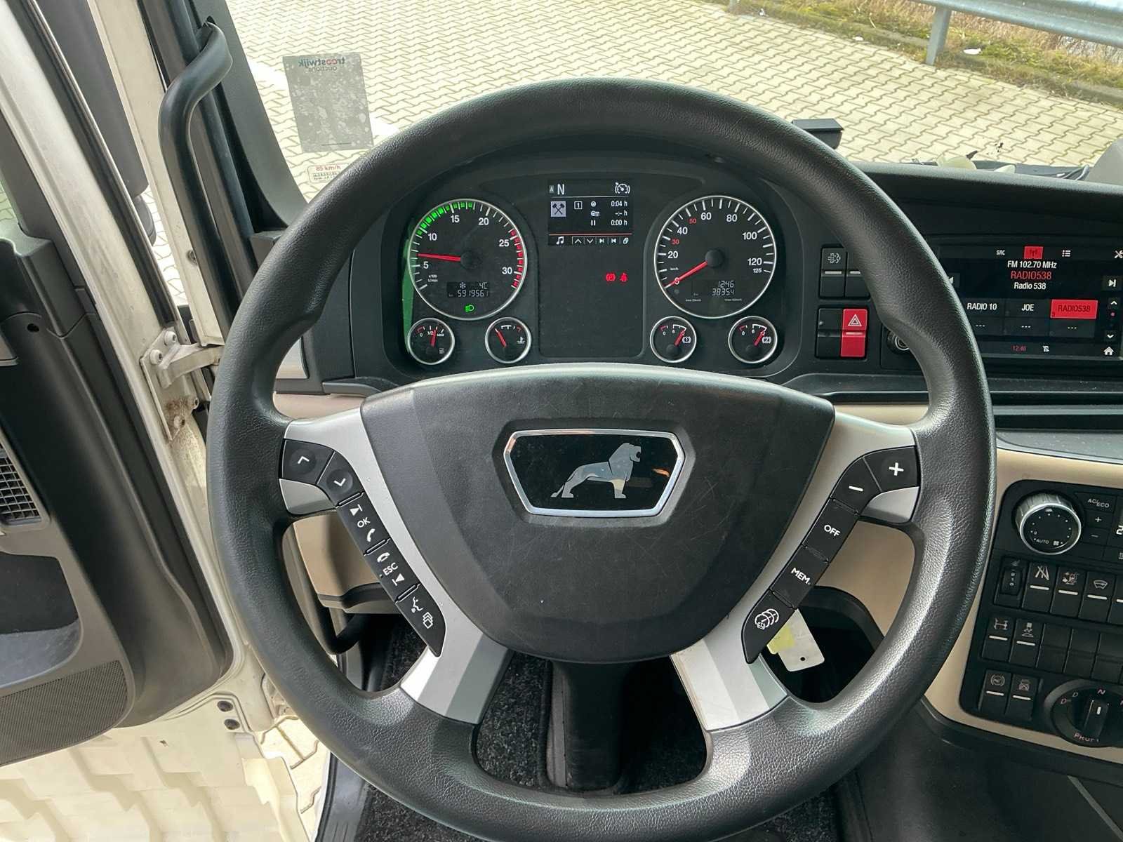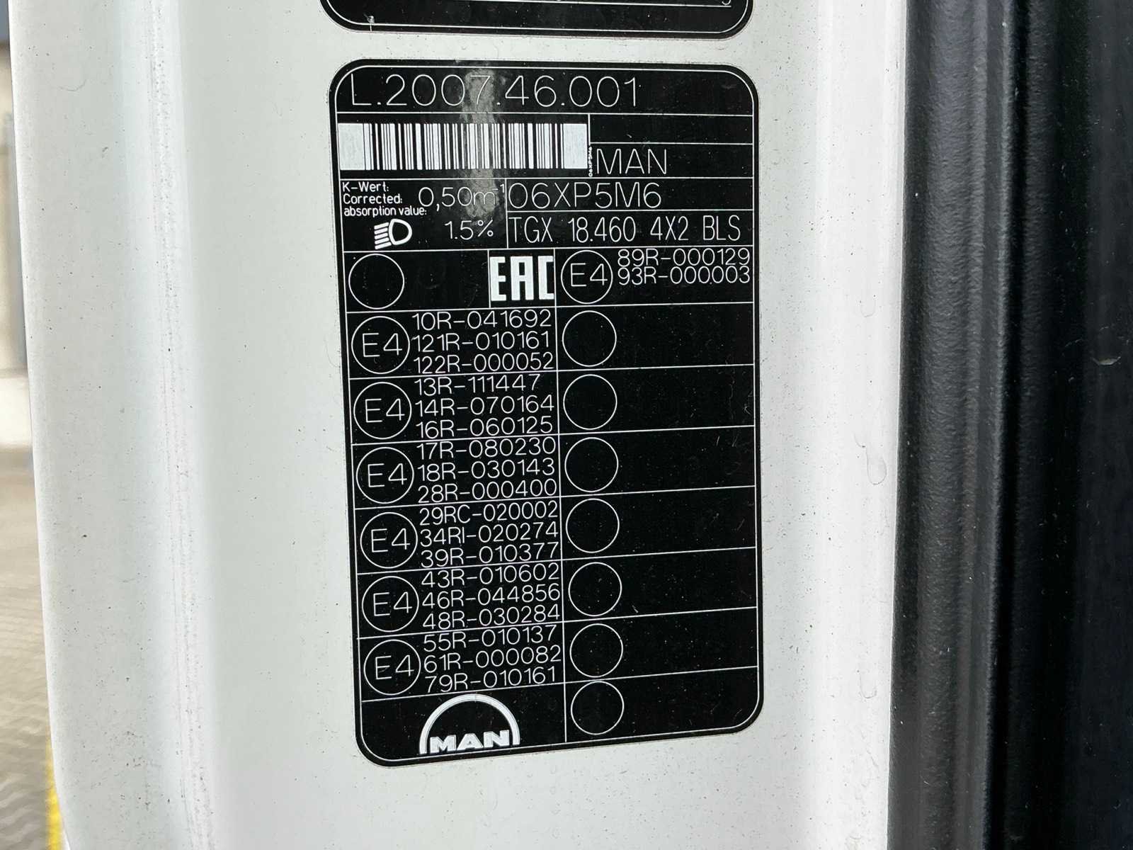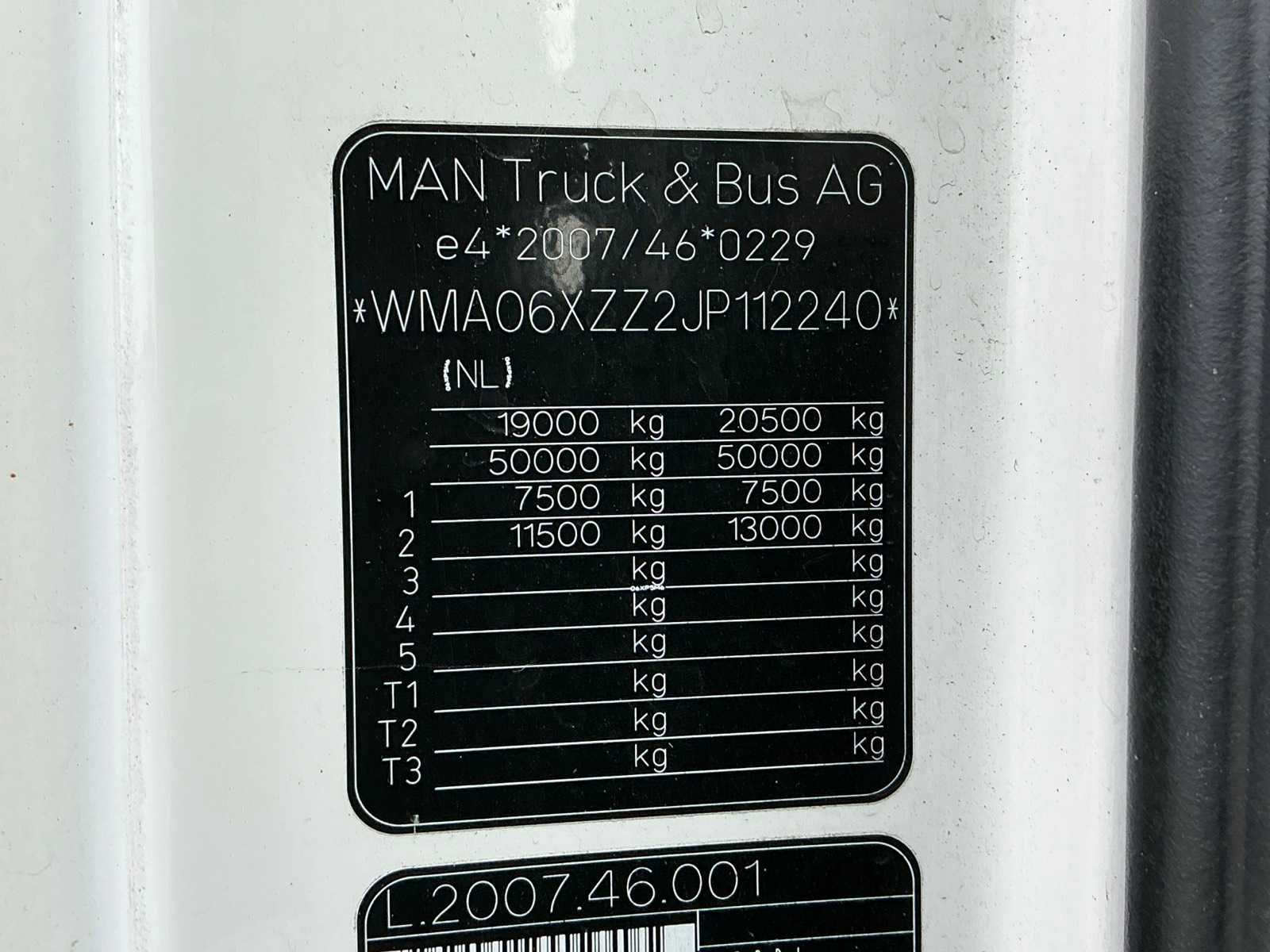 Technische max. massa voertuig 20500 kg, Toegestane max. massa voertuig 19000 kg, Maximum massa samenstel 50000 kg, Oplegger geremd 42079 kg, Emmissie klasse 6, Wielbasis 360 cm, Afstand voorzijde voertuig tot hart koppeling 449 cm, Laadvermogen 11179 kg, EURO 6, Standairco, Dubbelbed, Koelkast, 2000W DC-AC Inverter, Kenteken: 08-BLP-8 Merk: MAN Type: TGX-18.460 Bouwjaar: 2018 Chassisnummer VIN: WMA06XZZ2JP112240 Cilinderinhoud: 12419cc Kilometerstand bij opname: 591955km APK vervaldatum: 2026-10-08 Datum eerste toelating: 2018-12-20 Datum eerste toelating (NL): 2018-12-20 Type transmissie: Automatisch Aantal assen: 2 Asconfiguratie: 4x2 Fuel Type: Diesel Laadvermogen: 11184kg Aantal sleutels: 2 Emissieklasse: 6 Slaapcabine: true Eigen gewicht: 20500kg Totale afmeting Breedte: 2500mm Totale afmeting Hoogte: 4000mm Startinformatie: Ja Nationaliteit documenten: Nederland Aantal zitplaatsen: 2 Zelf rijdend exporteren: Mogelijk Automaat: true Diesel: true
