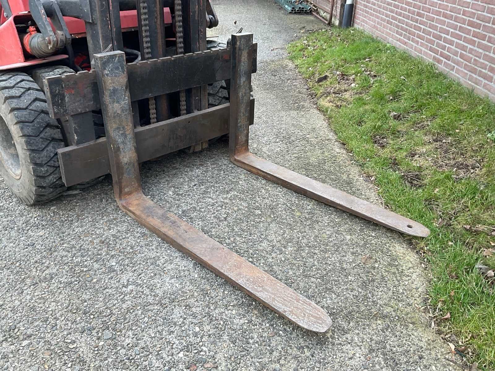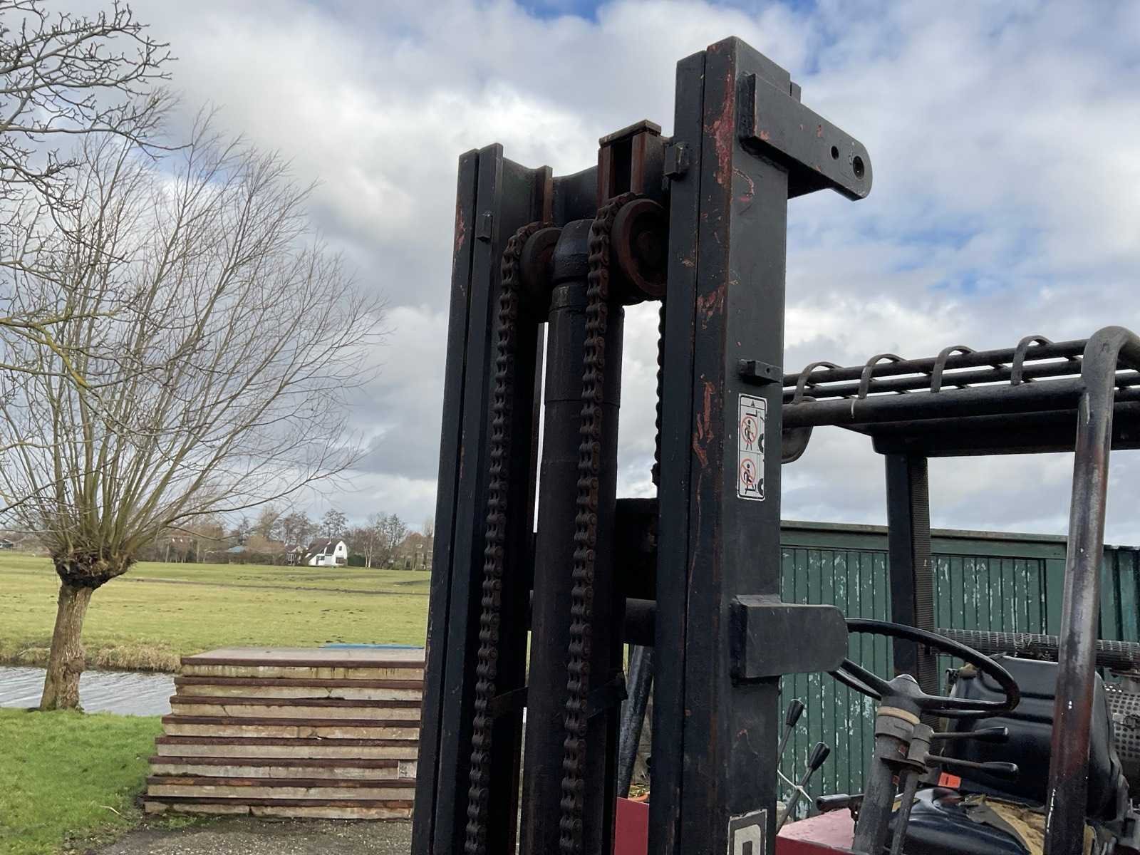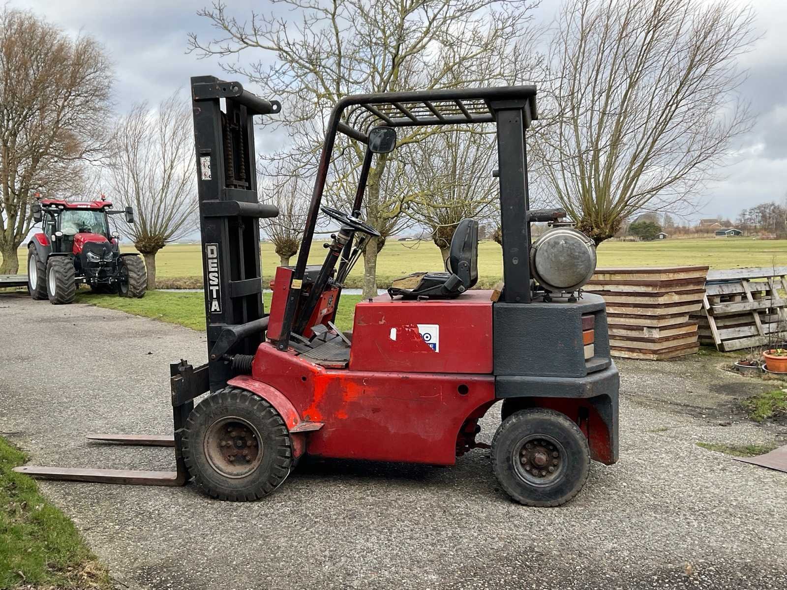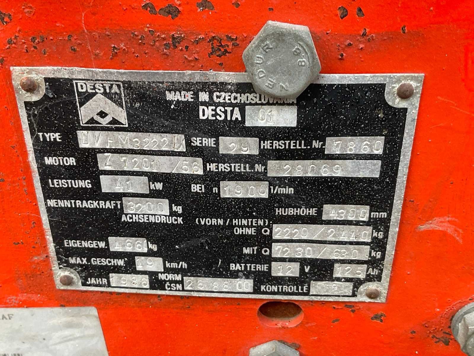 4cyl. Zetor motor Merk: Desta Type: DVHM3222L Bouwjaar: 1986 Brandstof: Diesel Mast: Duplex Soort band: Luchtbanden Aantal wielen: 4 Ruw terrein: true Free-lift: true Side-shift: true Duplex mast: true Eigen gewicht: 4660kg Hefvermogen: 3200kg Lepellengte: 1200mm Hefhoogte: 4300mm Luchtbanden: true Minimale doorrijhoogte: 2550mm Totale afmeting L: 4000mm Totale afmeting Breedte: 1450mm Totale afmeting Hoogte: 2550mm Diesel: true