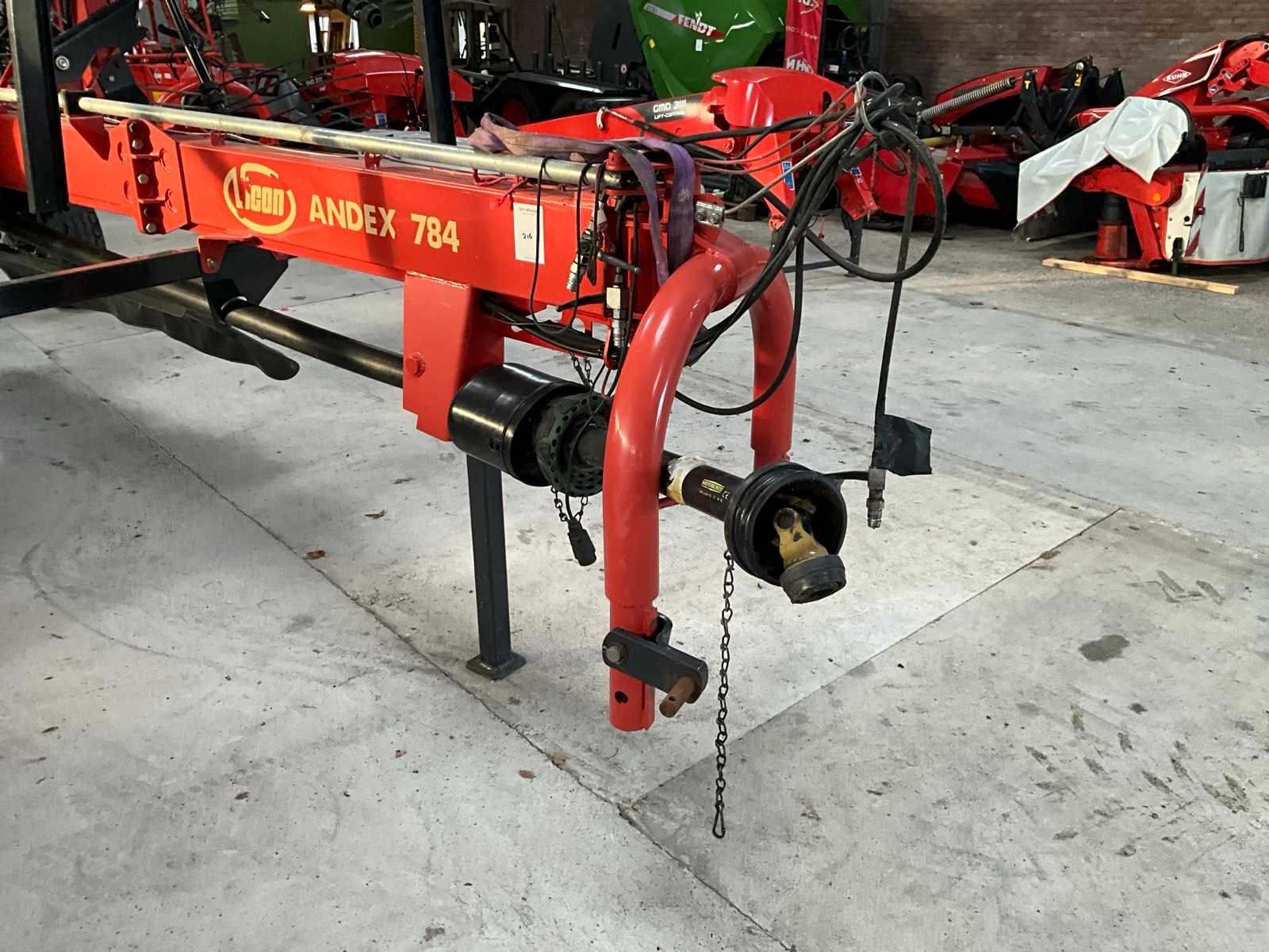 Voorzien van 2 cirkelrotoren, hydraulisch opklapbare transportpositie, LED-verlichting en beschermkappen; transport afmeting circa. 620x275x360 cm Merk: Vicon Type: ANDEX 784 Bouwjaar: 2012 Serienummer: VF69612385 Kenteken: LJX-85-K Werkbreedte: 7000mm Hydraulisch opklapbaar: true Eigen gewicht: 1695kg
