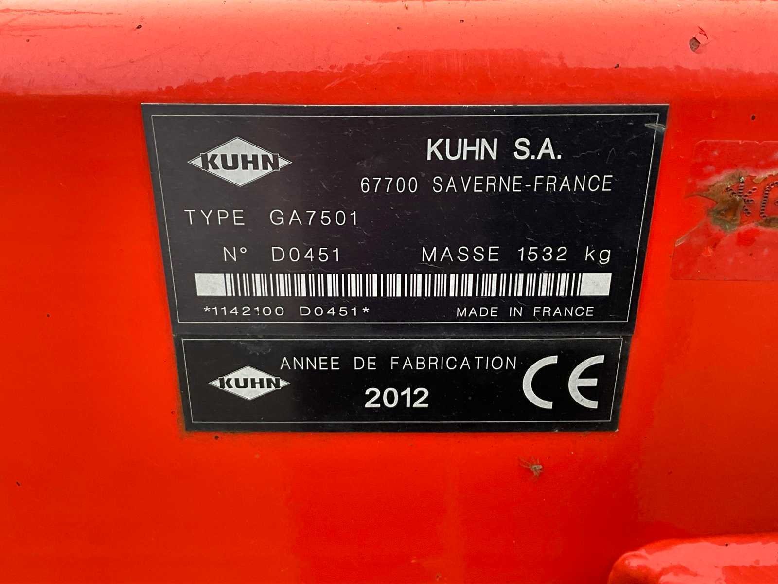 Voorzien van 2 cirkelrotoren, hydraulisch opklapbare transportpositie, LED-verlichting en beschermkappen; transport afmeting circa. 585x250x350 cm; voorzien van kenteken Merk: Kuhn Type: GA 7501 Bouwjaar: 2012 Serienummer: 1142100 D0451 Kenteken: LRV-46-S Werkbreedte: 7000mm Hydraulisch opklapbaar: true Eigen gewicht: 1532kg