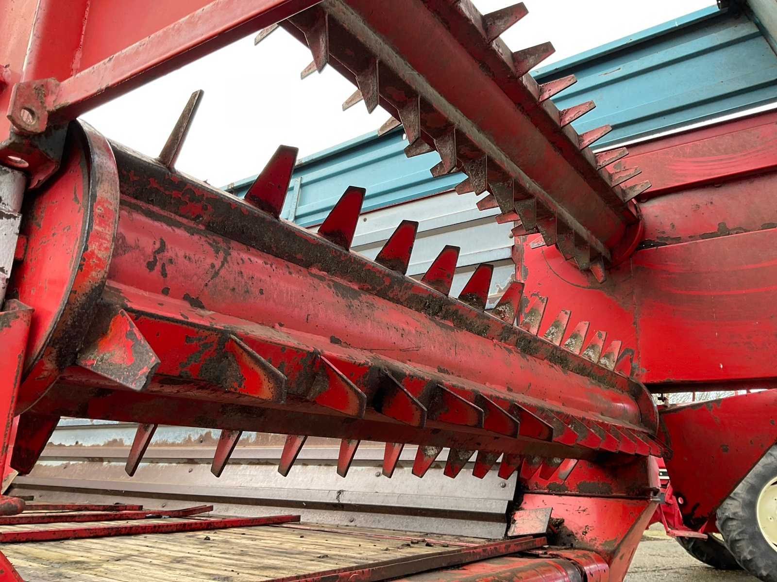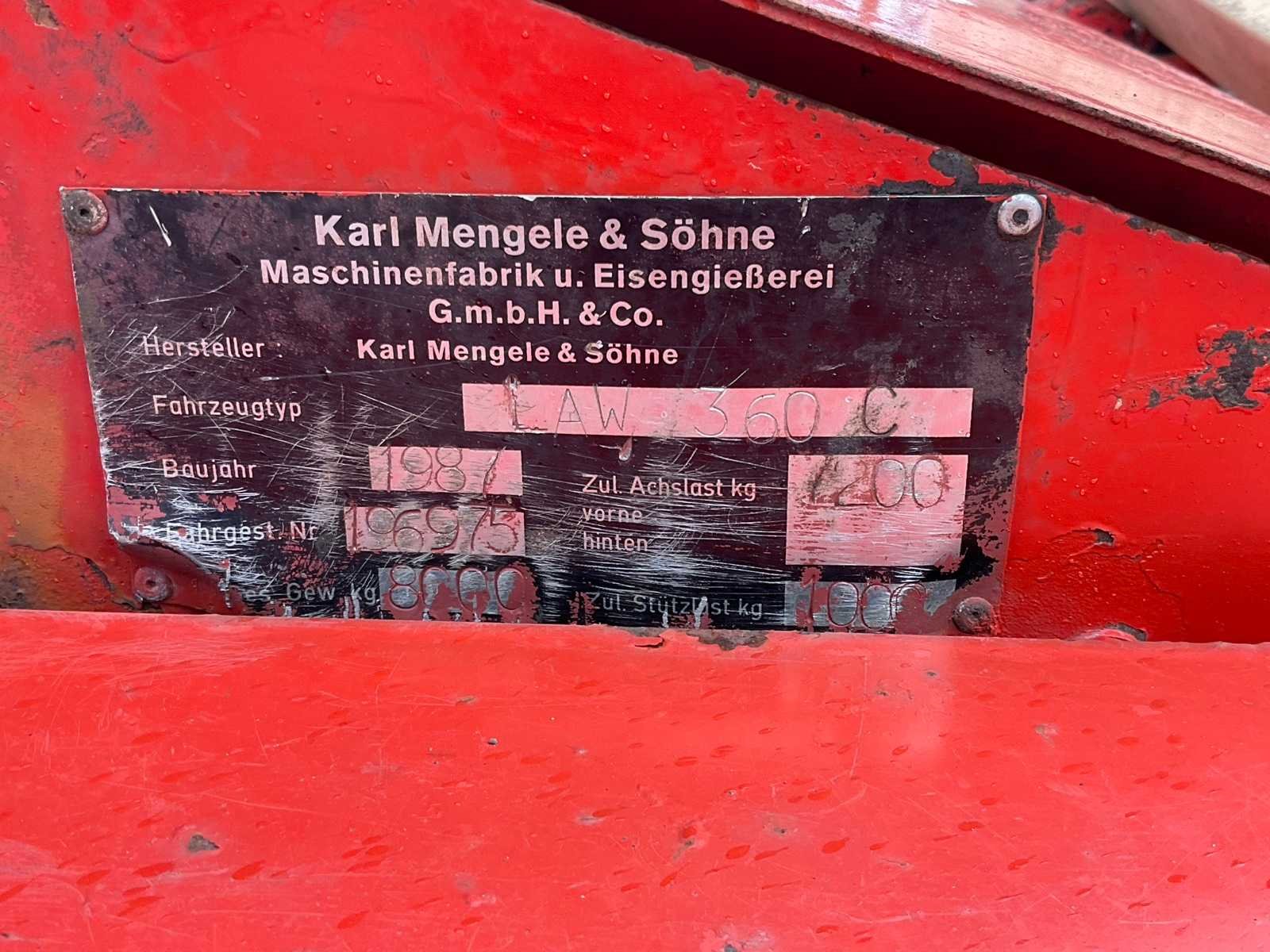 V.v. aftakas aandrijving, 2 verdeelwalsen, 2 zijdige afleg met transportband, steunwiel. Merk: Mengele Type: LAW 360 Super Quadro Bouwjaar: 1987 Serienummer: 196975 Kenteken: LKX-06-D Bandenmaat: 19.0/47-17