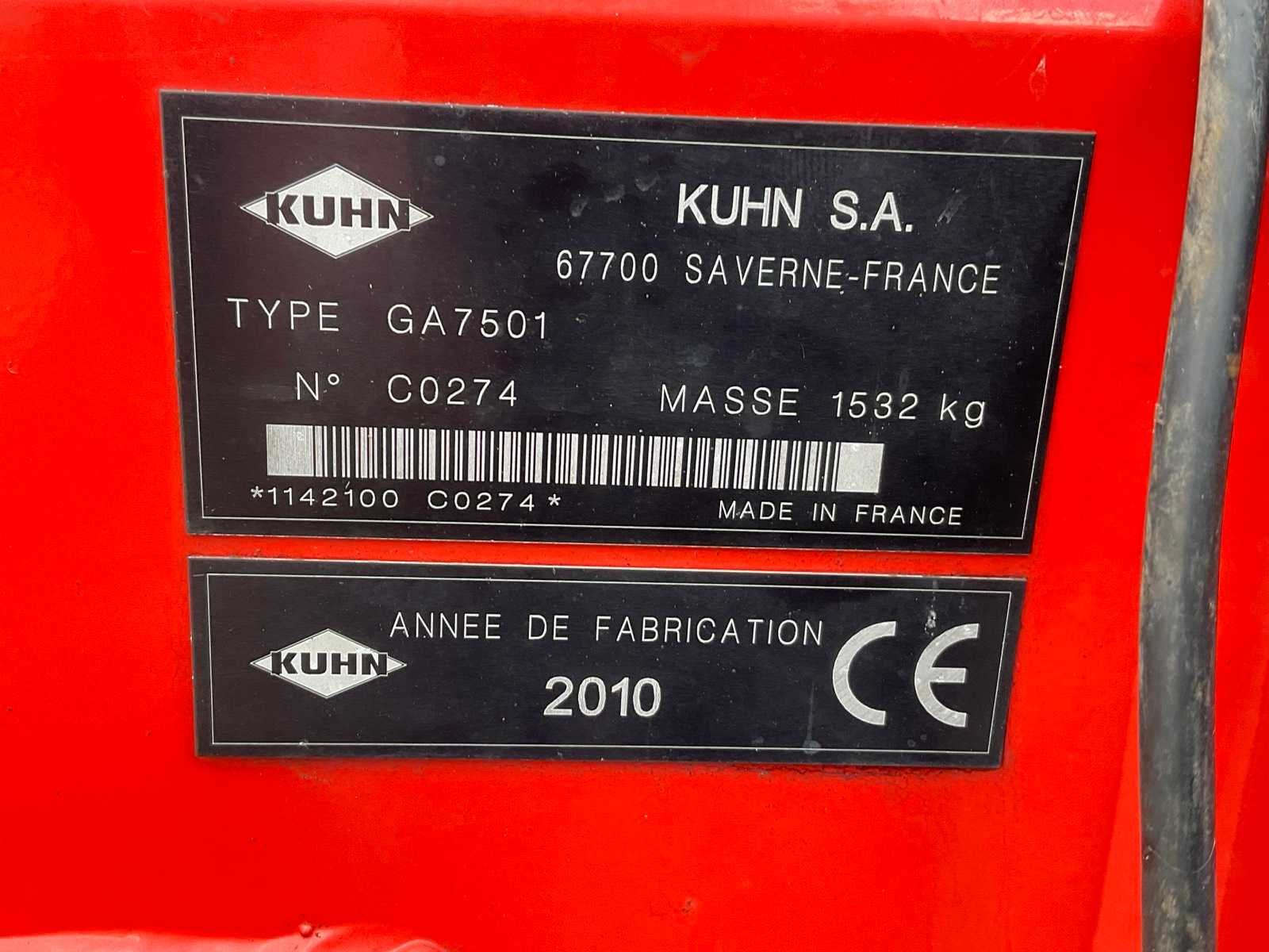 Voorzien van 2 cirkelrotoren, hydraulisch opklapbare transportpositie, LED-verlichting en beschermkappen; transport afmeting circa. 585x250x350 cm Merk: Kuhn Type: GA 7501 Bouwjaar: 2010 Kenteken: LFR-38-K Werkbreedte: 7000mm Hydraulisch opklapbaar: true Eigen gewicht: 1532kg