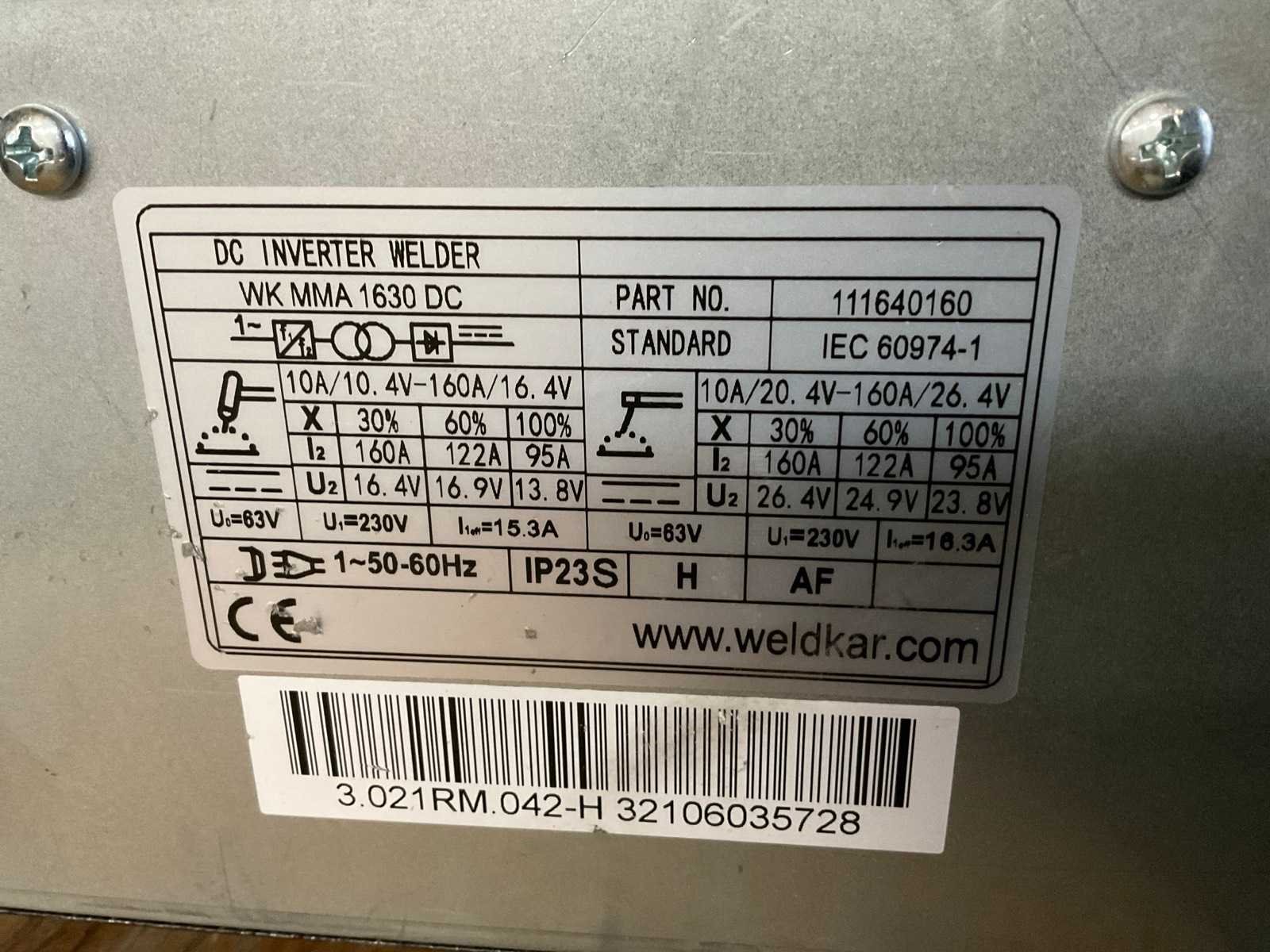 Zonder verdere toebehoren. Merk: Weldkar Type: WK MMA 1630 Inschakelduur: 30% Max. lasvermogen: 160A Aansluiting: 230V Digitale uitlezing: true