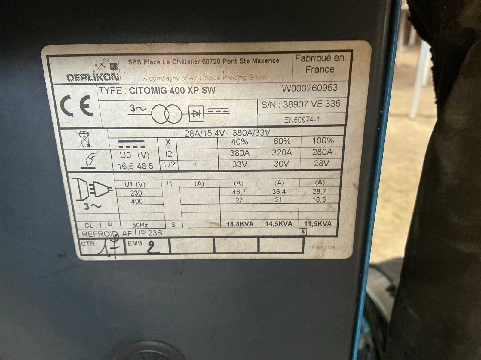 Zonder Toorts/massakabel Merk: Oelikon Type: CitoMIG 400XP SW Aansluiting: 400V Draadaanvoerunit: true Afmeting l: 1200mm Afmeting b: 600mm Afmeting h: 1050mm