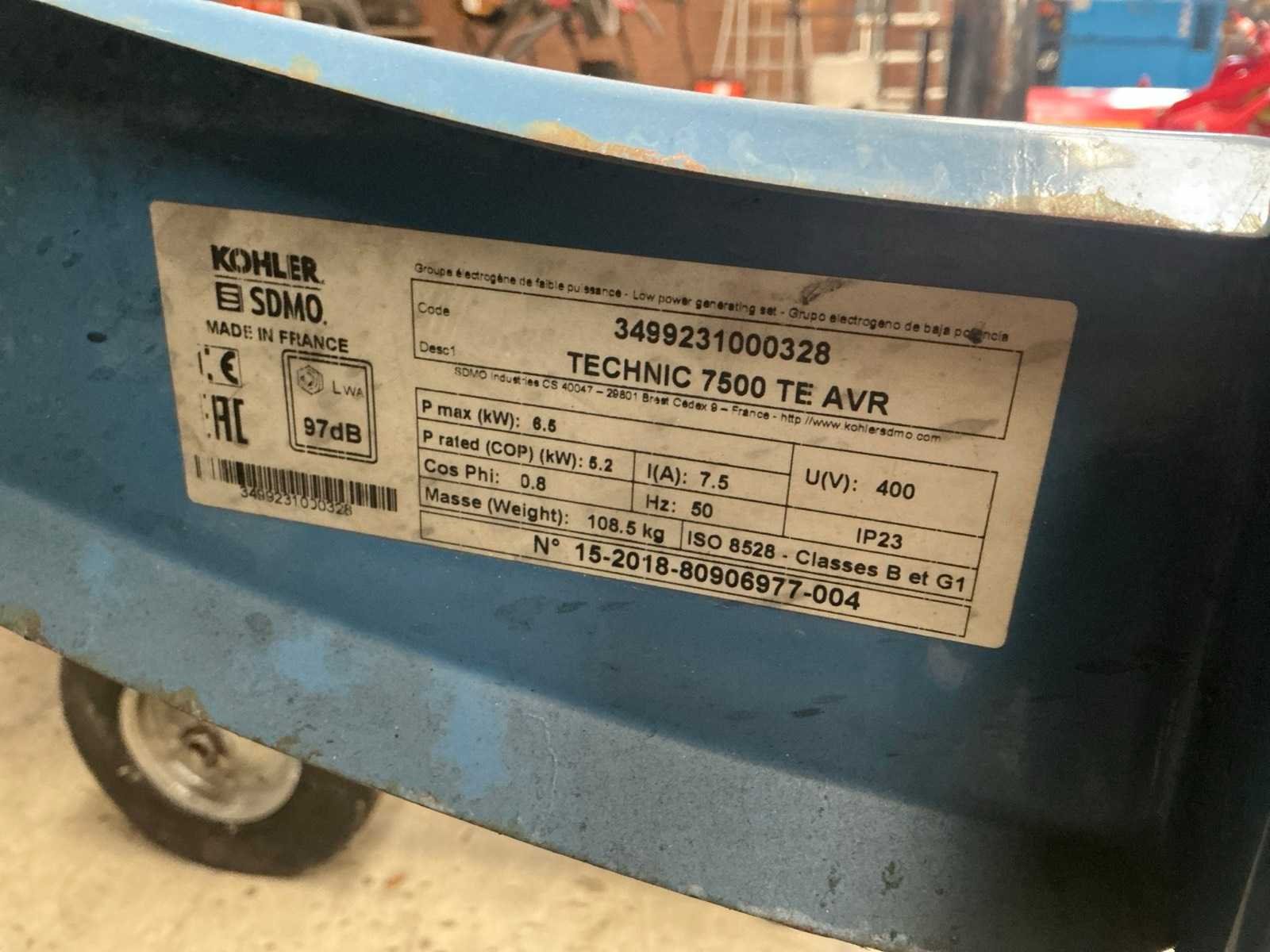 Accu leeg/defect Merk: SDMO Type: Technic 7500AVR Bouwjaar: 2018 Capaciteit.: 6.5kVA Aansluiting: 400V Motor merk: Kohler Generator merk: Kohler Totale afmeting L: 859mm Totale afmeting Breedte: 580mm Totale afmeting Hoogte: 770mm