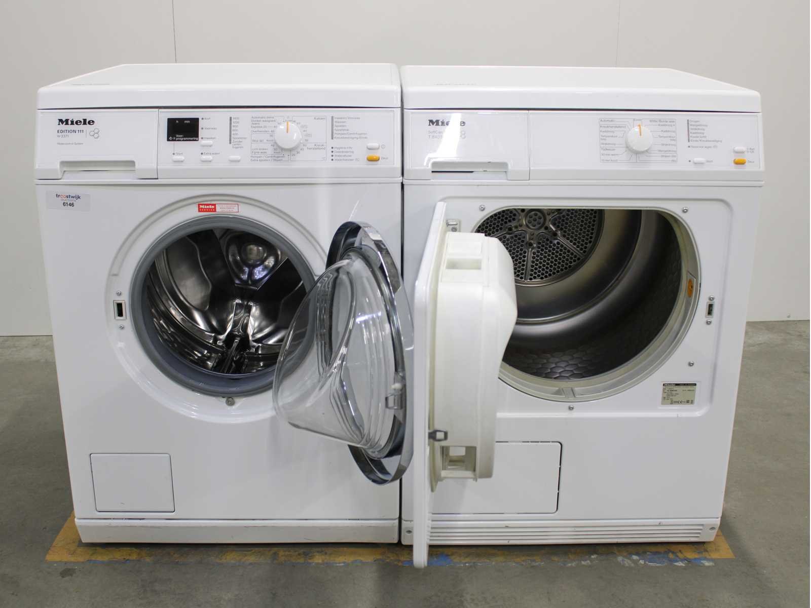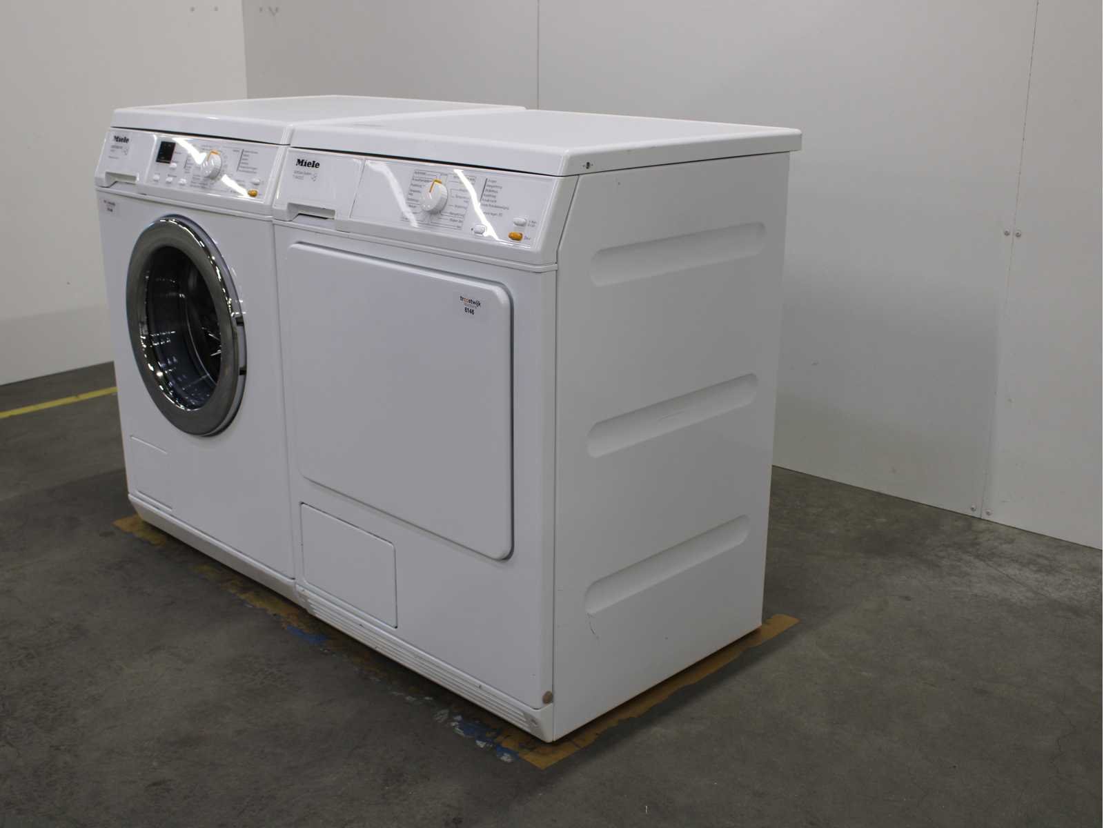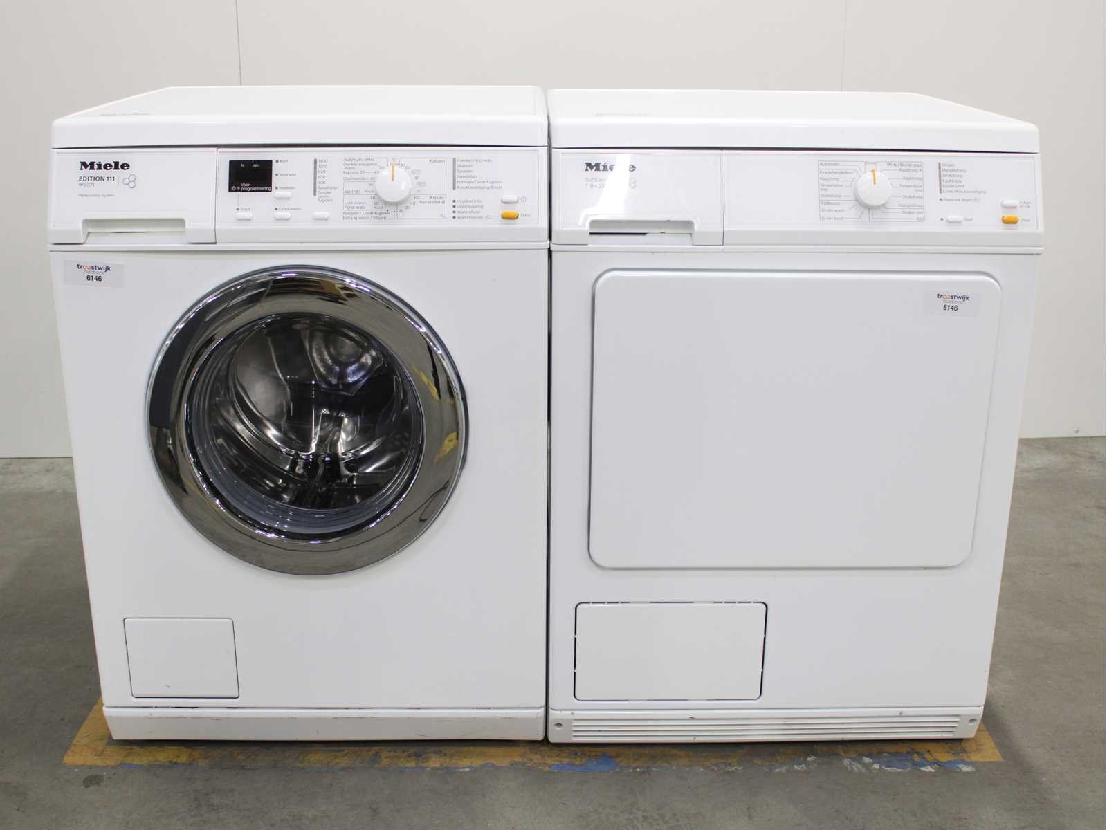Deze wasmachine en wasdroger komen uit een partij jong gebruikt A-Merk witgoed. De machines zijn volledig getest, gereinigd en indien nodig gerepareerd. Houdt er rekening mee dat de machines lichte gebruikssporen kunnen hebben. Wasmachines en wasdrogers hebben vaak standaard afmetingen. Hoogte 85cm, Breedte 60cm en Diepte 60 tot 70cm, incl. uitstekende slangen e.d. aan de achterzijde. Als de machine vrij komt te staan is de afmeting minder relevant. Wil je de machine in een nis plaatsen of inbouwen? Controleer dan de exacte afmetingen op basis van het aangeboden merk en model/type. Within 7 days Merk: Miele Serienummer: W3371 en T8403C