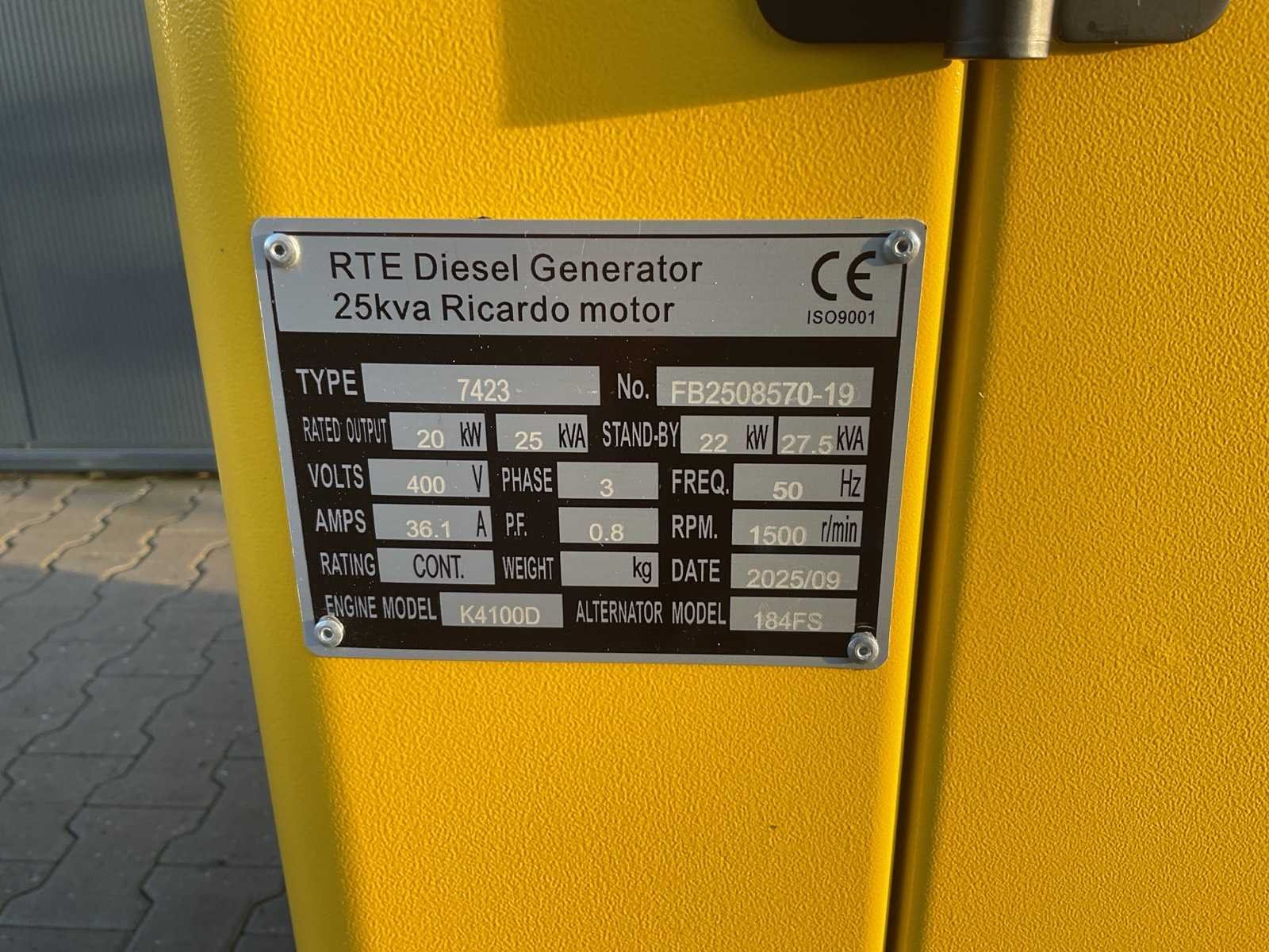Model/Type RTE 7423 ; Brandstofsoort Diesel; Motormerk Ricardo K4100D; Voedingsspanning 380 V; Generatorcapaciteit 35 kVA; Elektronisch display; Handleiding; Ongebruikt Merk: RTE Type: 25kva 7423 Ricardo motor