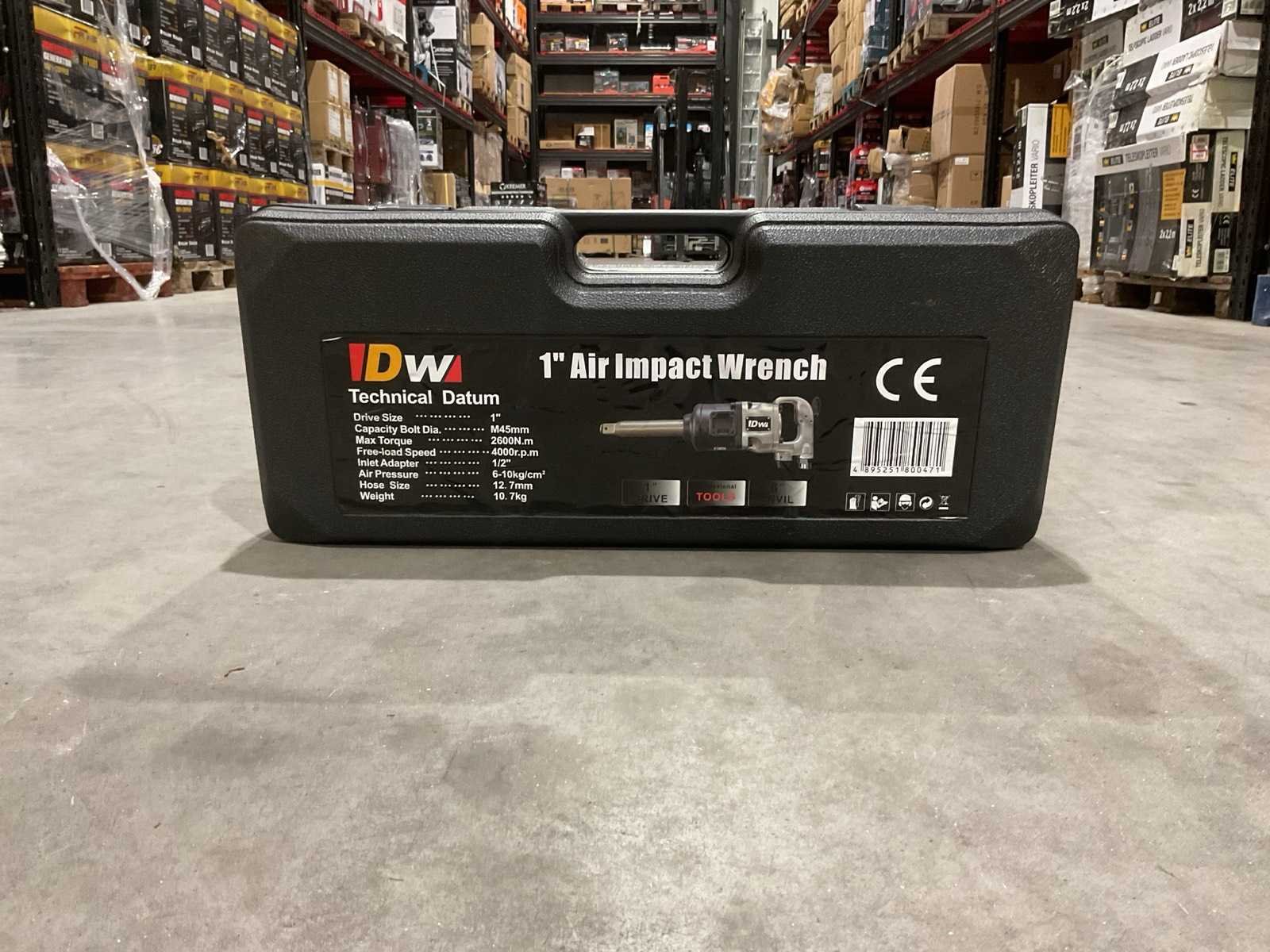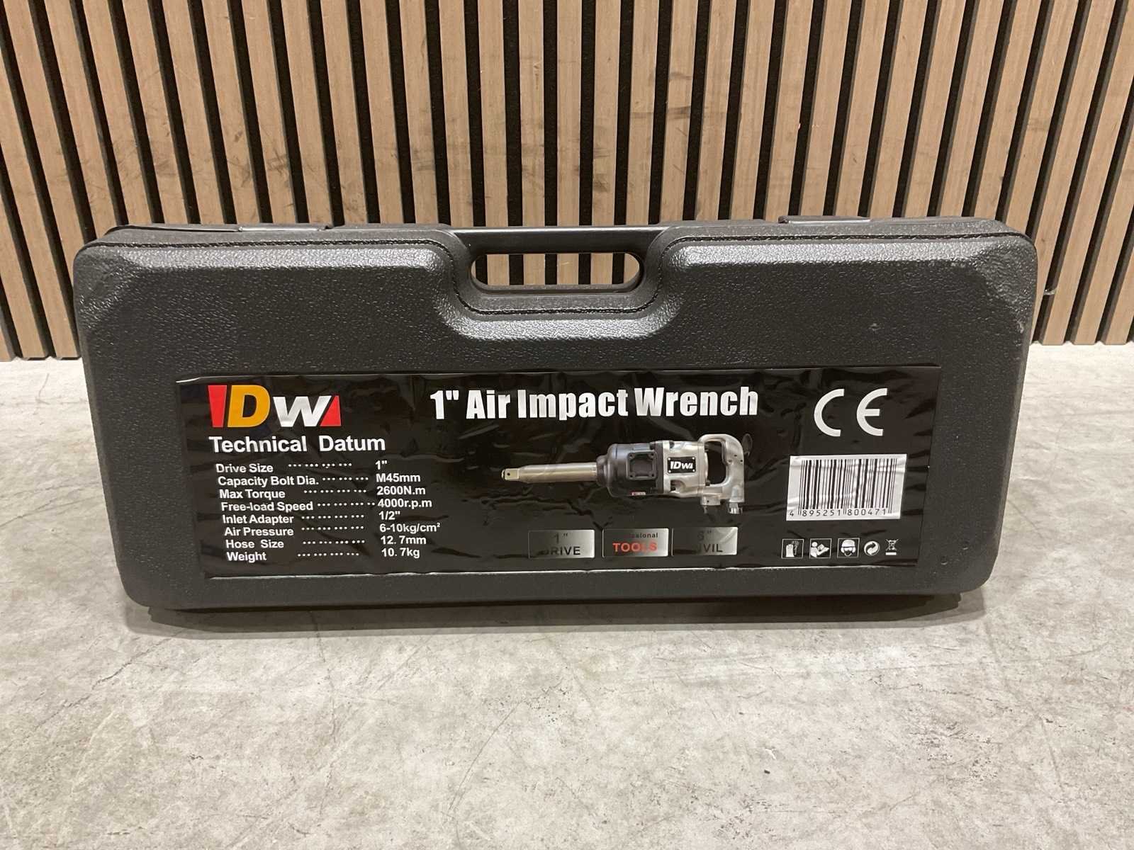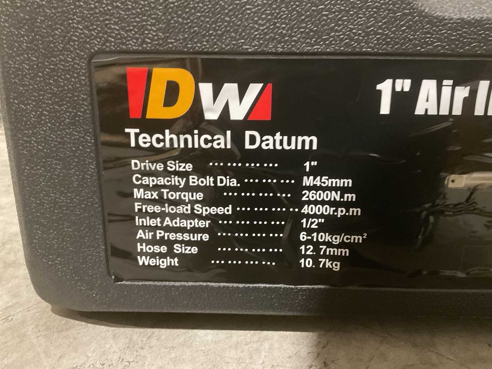 Voorzien van aandrijving: lucht; Opname: 1 inch (1”) vierkant; kunststof draagkoffer; Max. boutdiameter: M45 mm; Max. koppel: 2600Nm; Luchtaansluiting: 1/2”; Werkdruk: 6-10 bar; Min. slangdiameter: 12,7 mm; gewicht: 10,7 kg; ongebruikt in doos Merk: DW Type: 1” air impact wrench