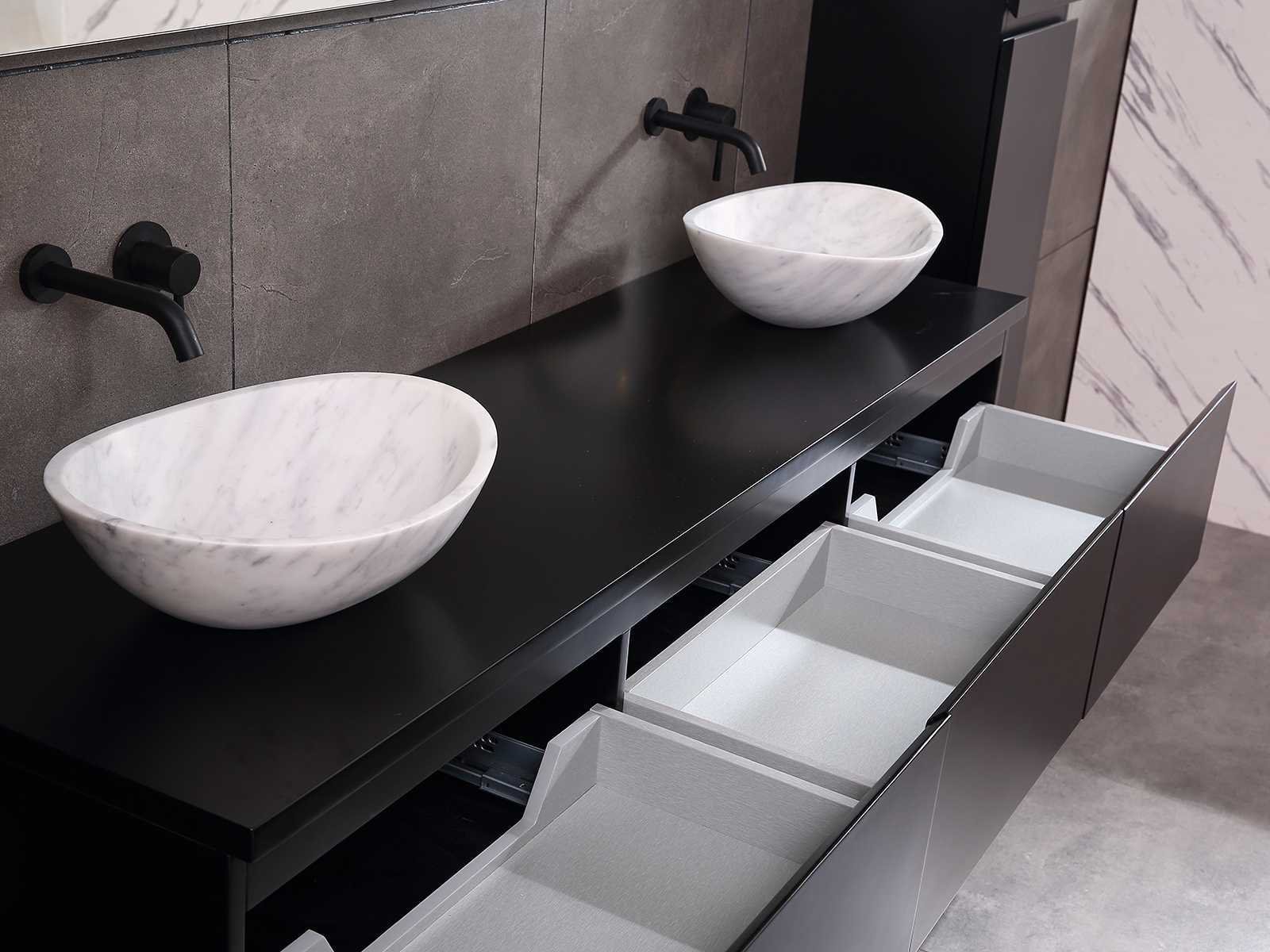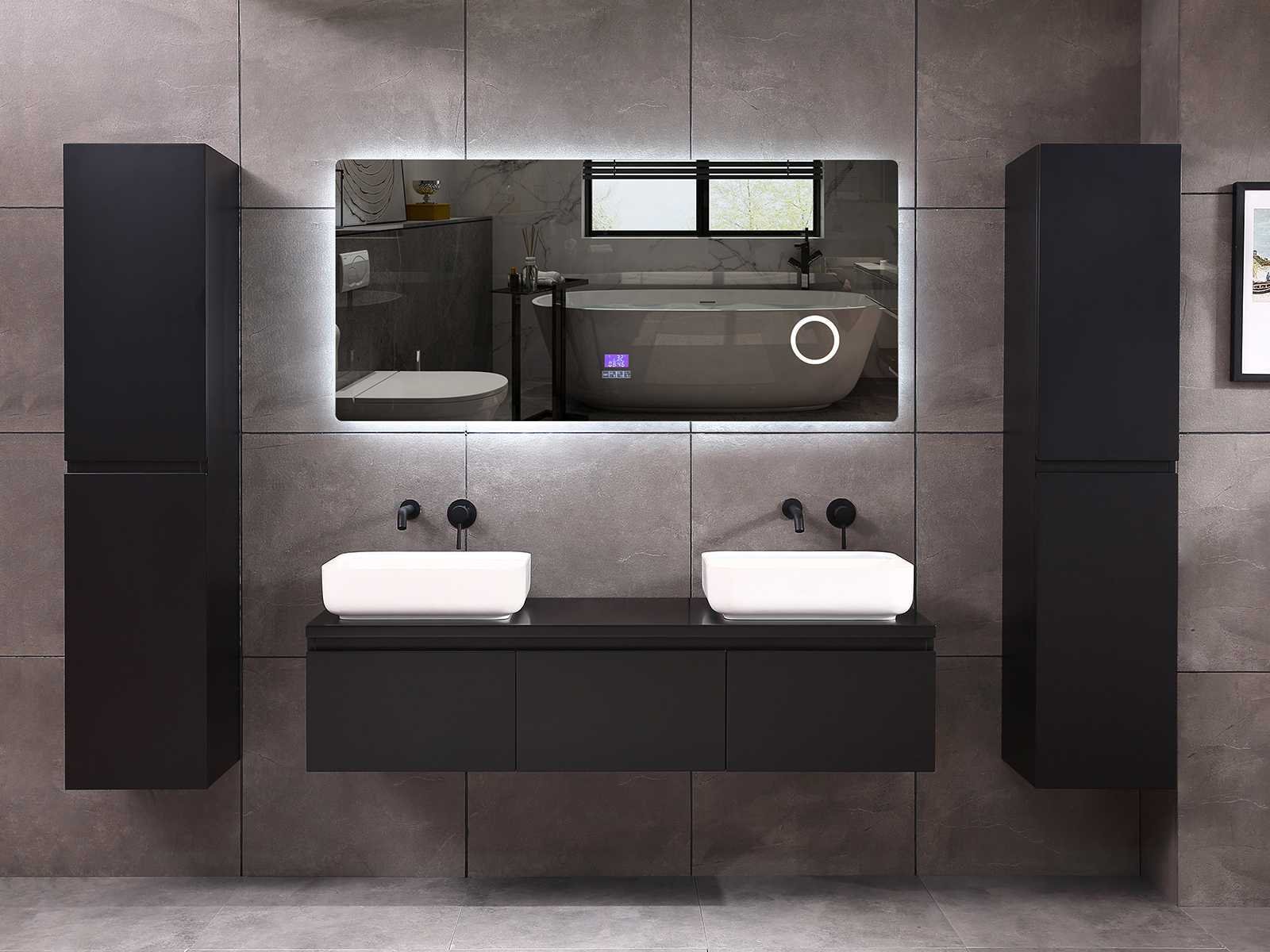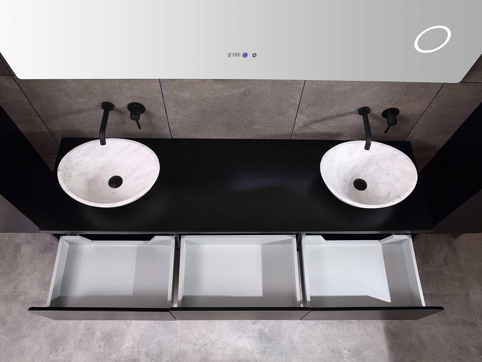 Afmeting meubel bxdxh 150/180x50x35cm (keuze breedte 150 of 180cm graag doorgeven op de afhaaldag - hangkast 35x35x160cm (wordt met 1 hangkast geleverd), kleur mat zwart, materiaal 5-laags multiplex met 3cm eiken top(zeer sterk en vochtbestendig), Hangkast softclose deuren en extra planchets (hangkast kan zowel links als rechts van het meubel worden gehangen), kranen exclusief , Lades 3 stuks met softclose, Wasbakken solid surface, natuursteen of italiaans marmer (keuze uit diverse modellen van de laatste 3 foto's, graag keuze doormailen op info@mawialux.nl), spiegel met verwarming/bluetooth/radio/klok en vergrootglas met ledverlichting rondom aan de achterkant met 3 verstelbare kleuren led 3000/4500/6000k led-dioden (geel/blauw/wit licht) met de volgende opties: digitaal display, geïntegreerde vergrotingsspiegel van 10cm doorsnede met ledverlichting(vergroot 3x), bluetooth met speaker, digitale klok, digitale temperatuur aanduiding, 220volt stekker(plug and play), verwarming ter voorkoming van condens, 1.5mm kopervrij met explosion-proof laag met dezelfde functie als gehard glas , afvoeren exclusief, Conditie: Nieuw in doos, Bijzonderheden 2 jaar garantie, gaten zijn niet in het topblad voorgeboord zodat u zowel muurkranen als kranen vanaf het blad kunt gebruiken of zelf 1 wastafel in plaats van 2 stuks(gaten boren door een installateur is zelf gemakkelijk uit te voeren), compleet met installatie materiaal, zeer hoge kwaliteit, let op! de hangkast mag geruild worden voor een set kranen en popup afvoeren naar keus of als u een extra hangkast nodig graag op de afhaaldag aangeven voor een passende aanbieding Merk: Mawialux Model: Jeremy Hoogte: 35cm Lengte: 50cm Breedte: 150-180cm Materiaal: 5-laags multiplex met 3cm massief top(zeer sterk en vochtbestendig) Kleur: mat zwart Kraan: exclusief Waskom: Diverse keuzes Spiegel met verlichting: ja Verlichting: ja Onderkast: ja Lades: 3 Softclose: true Bevestigingsmateriaal: true Zijkast: ja 1x