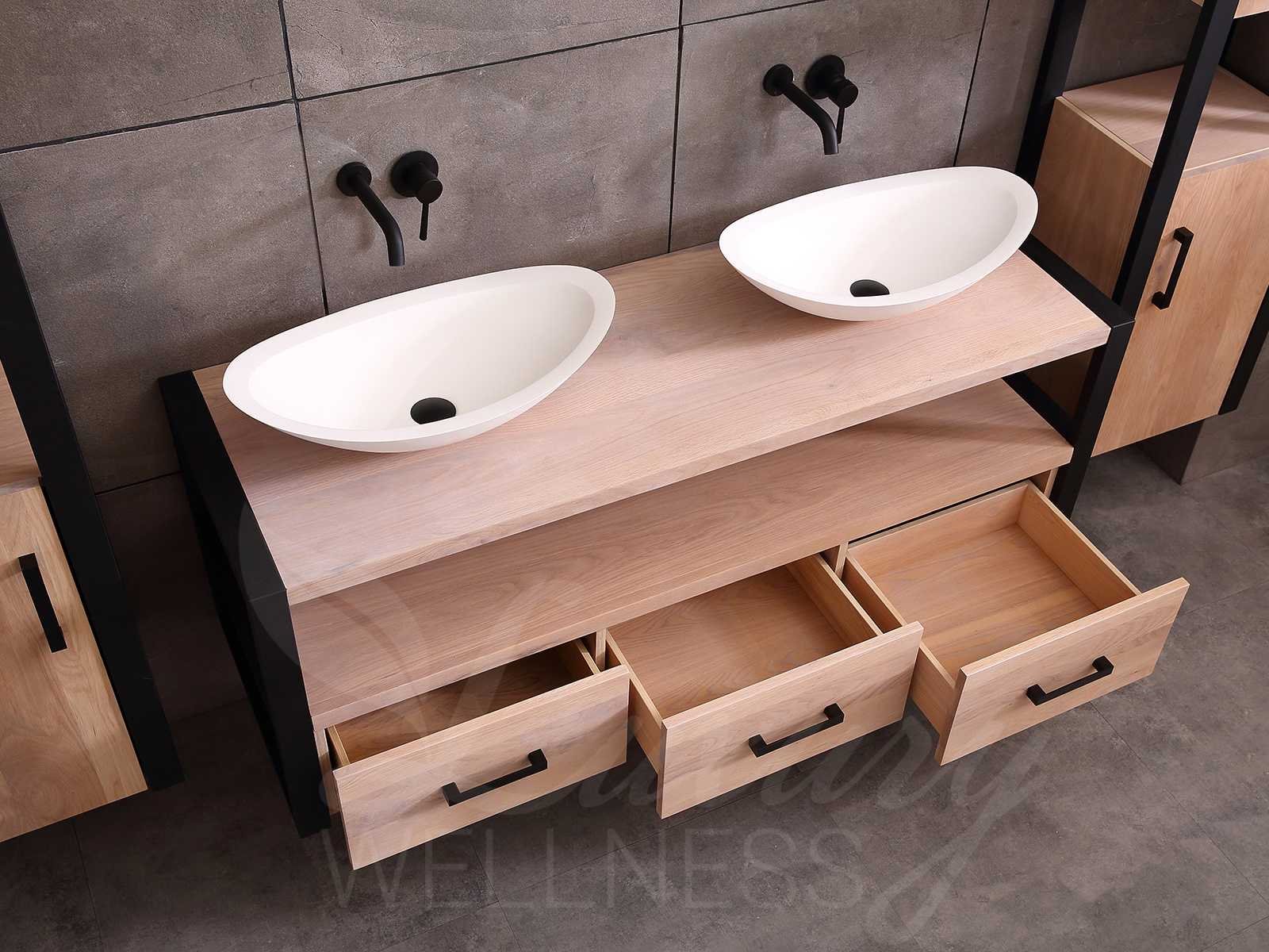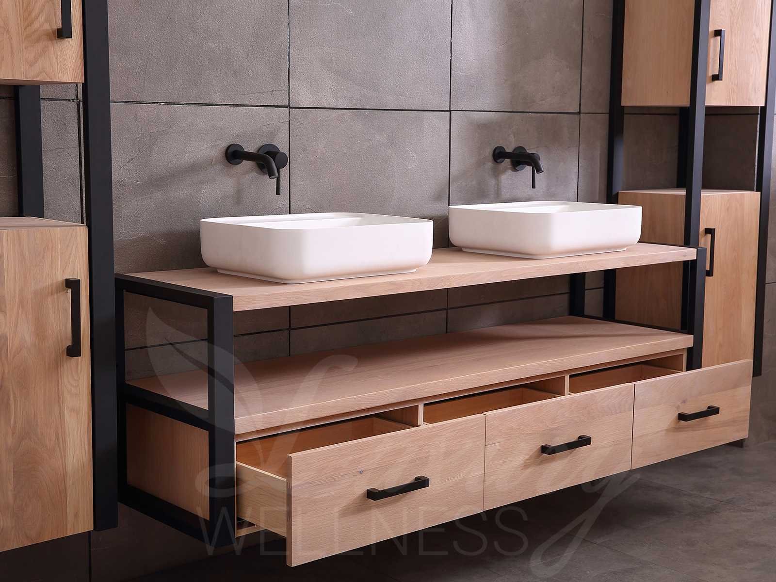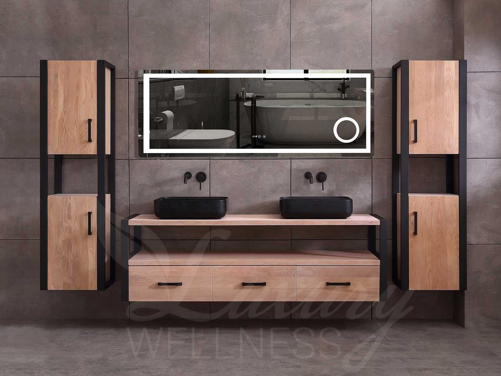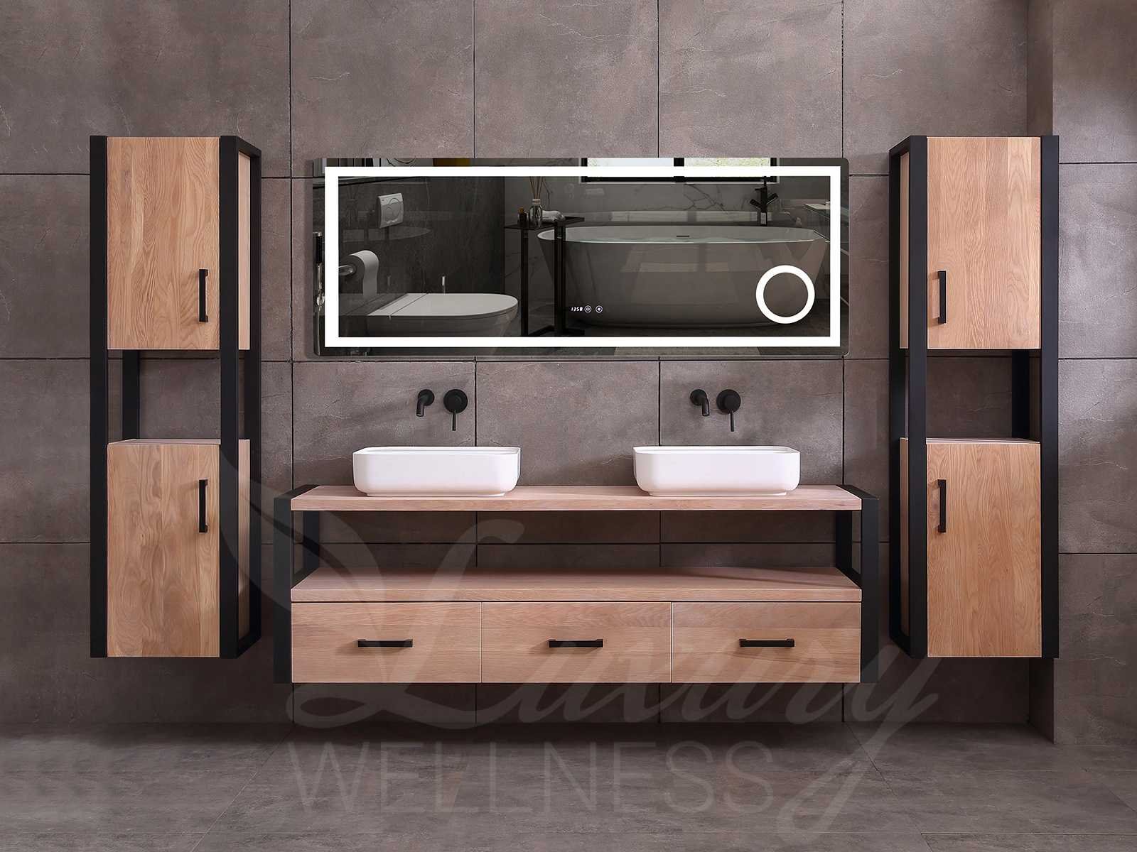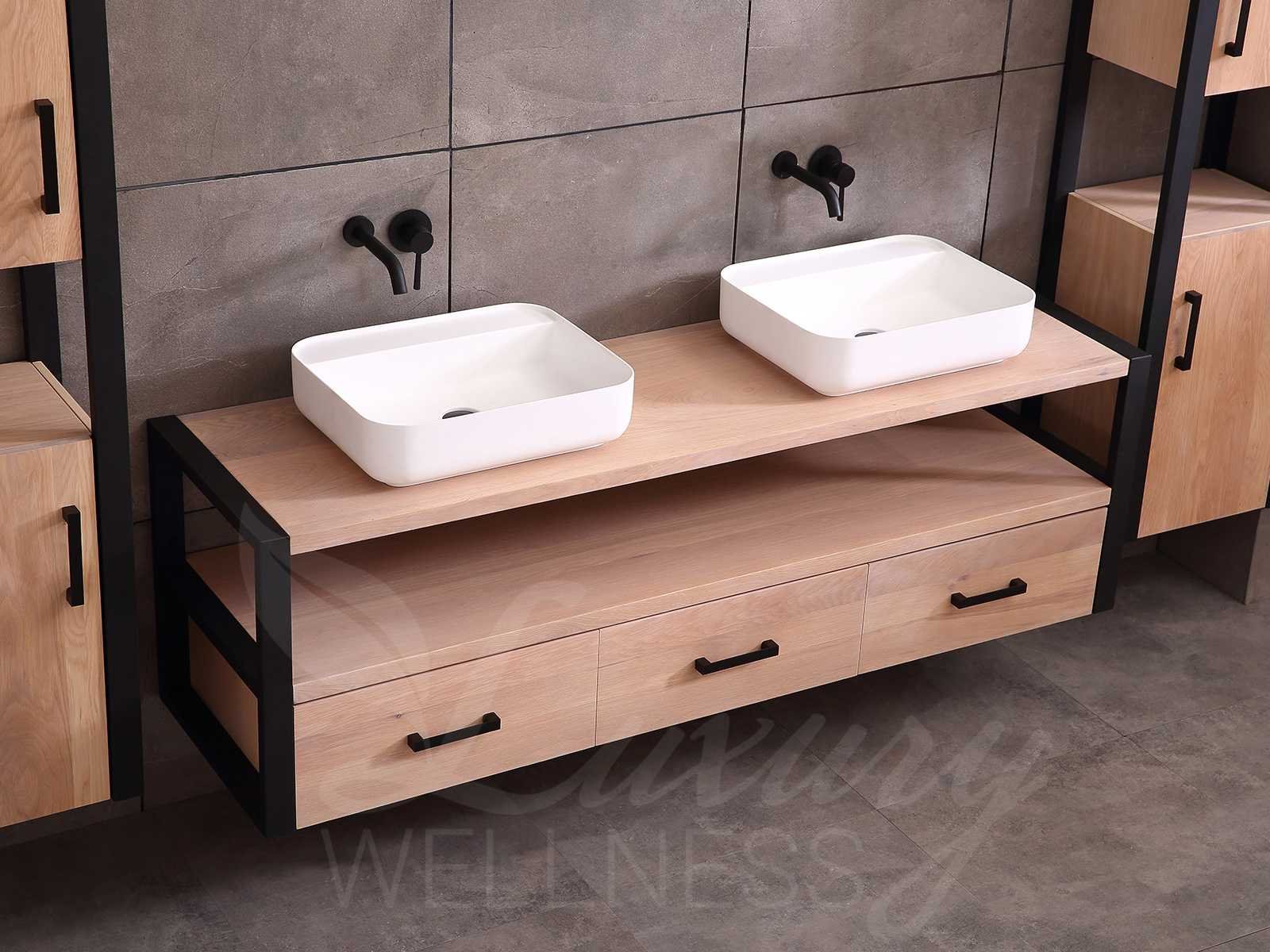 Afmeting meubel bxdxh 150x50x55cm - hangkasten 45x35x160cm(5cm rvs frame per kant), kleur eiken natural, materiaal 2cm massief eiken (front) met 3cm massief top overige en 5-laags multiplex(zeer sterk en vochtbestendig), Hangkast softclose deuren en extra planchets (hangkast is universeel en kan zowel links als rechts naast het meubel gehangen worden), kranen exclusief , Lades 2 stuks met softclose, Wastafel natuursteen of solid surface (keuze uit diverse modellen van de laatste foto's, kraangaten zijn nog niet in het top voorgeboord zodat u muurkranen of kranen uit het blad kan gebruiken, led spiegel met verwarming/klok en vergrootglas met ledverlichting, geïntegreerde vergrotingsspiegel van 10cm doorsnede met ledverlichting(vergroot 3x), digitale klok, digitale temperatuur aanduiding, 220volt stekker(plug and play), verwarming ter voorkoming van condens, 1.5mm kopervrij met explosion-proof laag met dezelfde functie als gehard glas(de spiegel mag geruild worden voor een ander model/type), afvoeren exclusief, Conditie: Nieuw in doos, Bijzonderheden 2 jaar garantie, compleet met installatie materiaal, zeer hoge kwaliteit, let op! 1 hangkast mag geruild worden voor een set kranen en popup afvoeren naar keus (graag op de afhaaldag aangeven) Merk: Mawialux Model: Philip Hoogte: 55cm Lengte: 50cm Breedte: 150cm Materiaal: Eiken Kleur: Eiken white wash Kraan: exclusief Wastafel: diverse keuzes Waskom: diverse keuzes Spiegel met verlichting: ja Verlichting: ja Lades: 3 Softclose: true Bevestigingsmateriaal: true Zijkast: ja 2x Afmeting hangkast: LxBxH 35x45x160