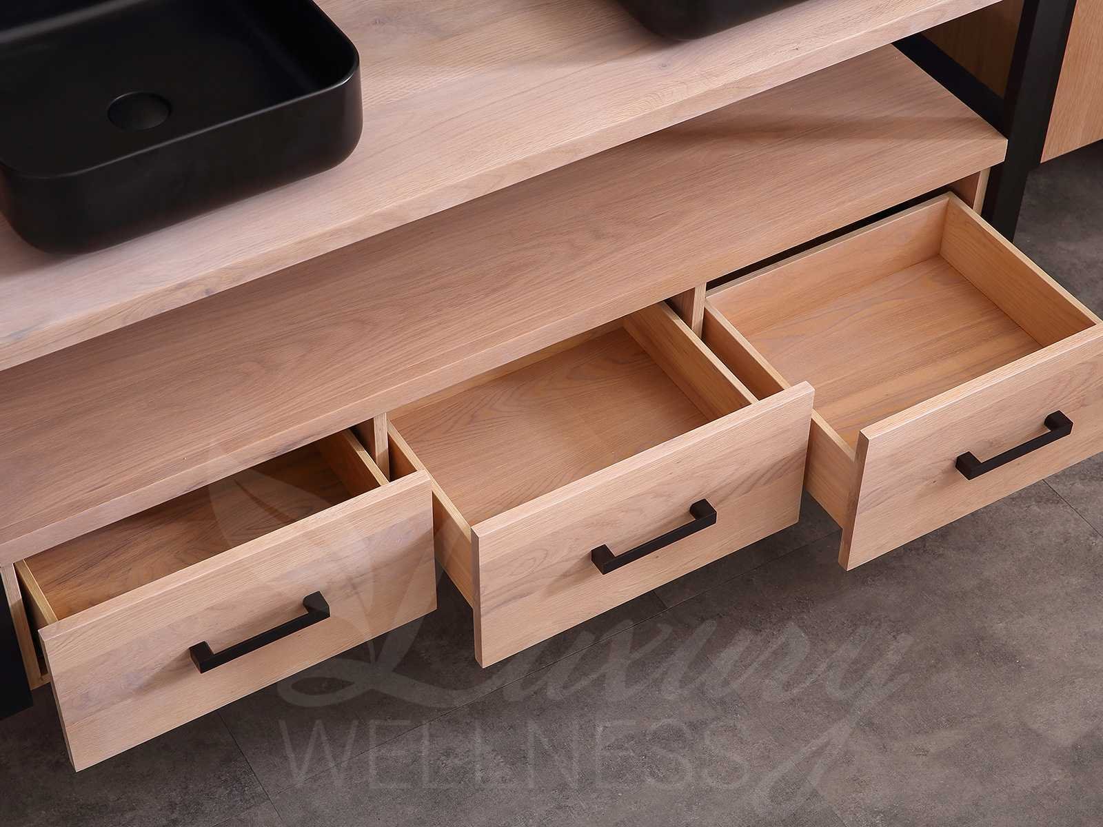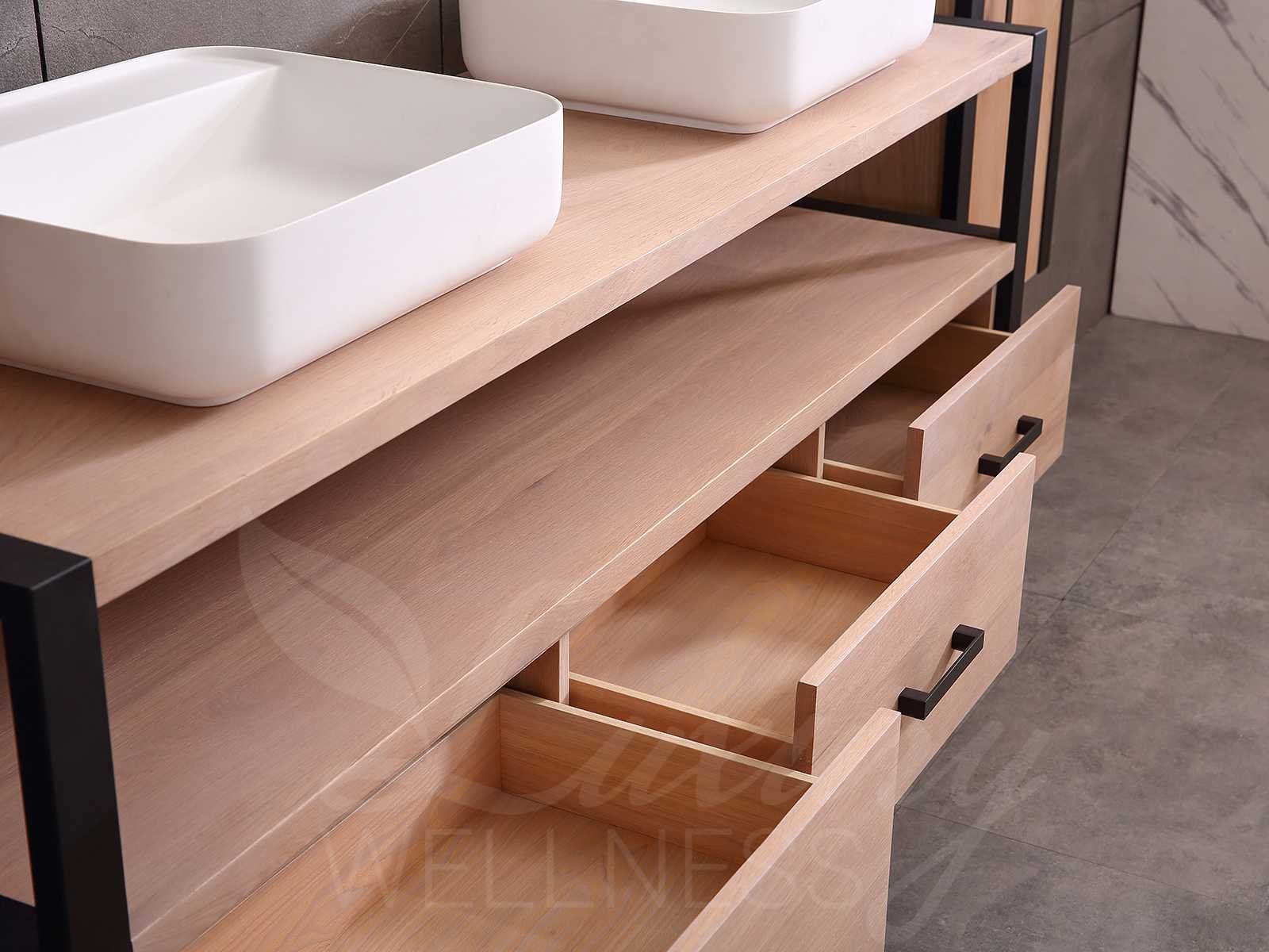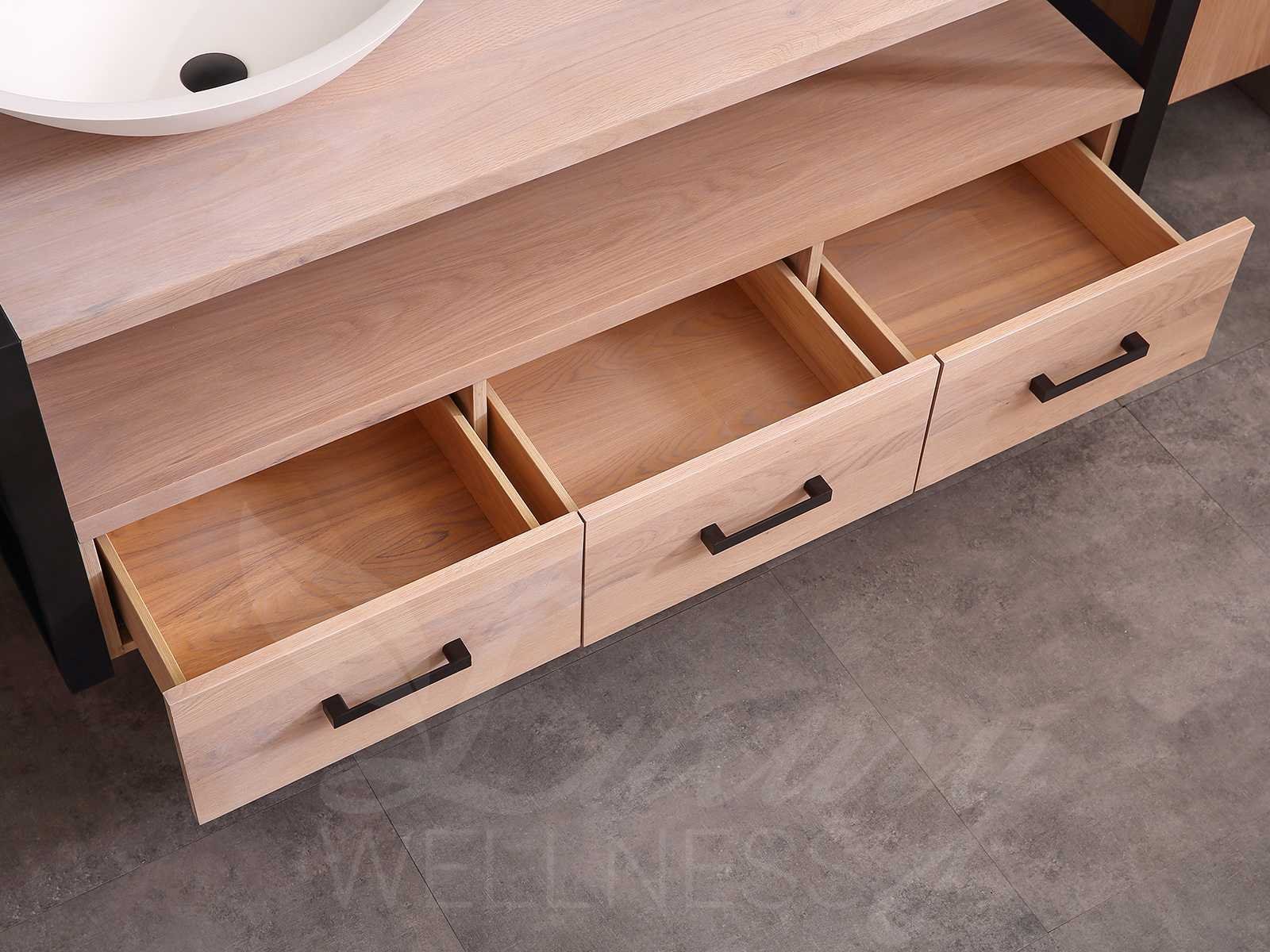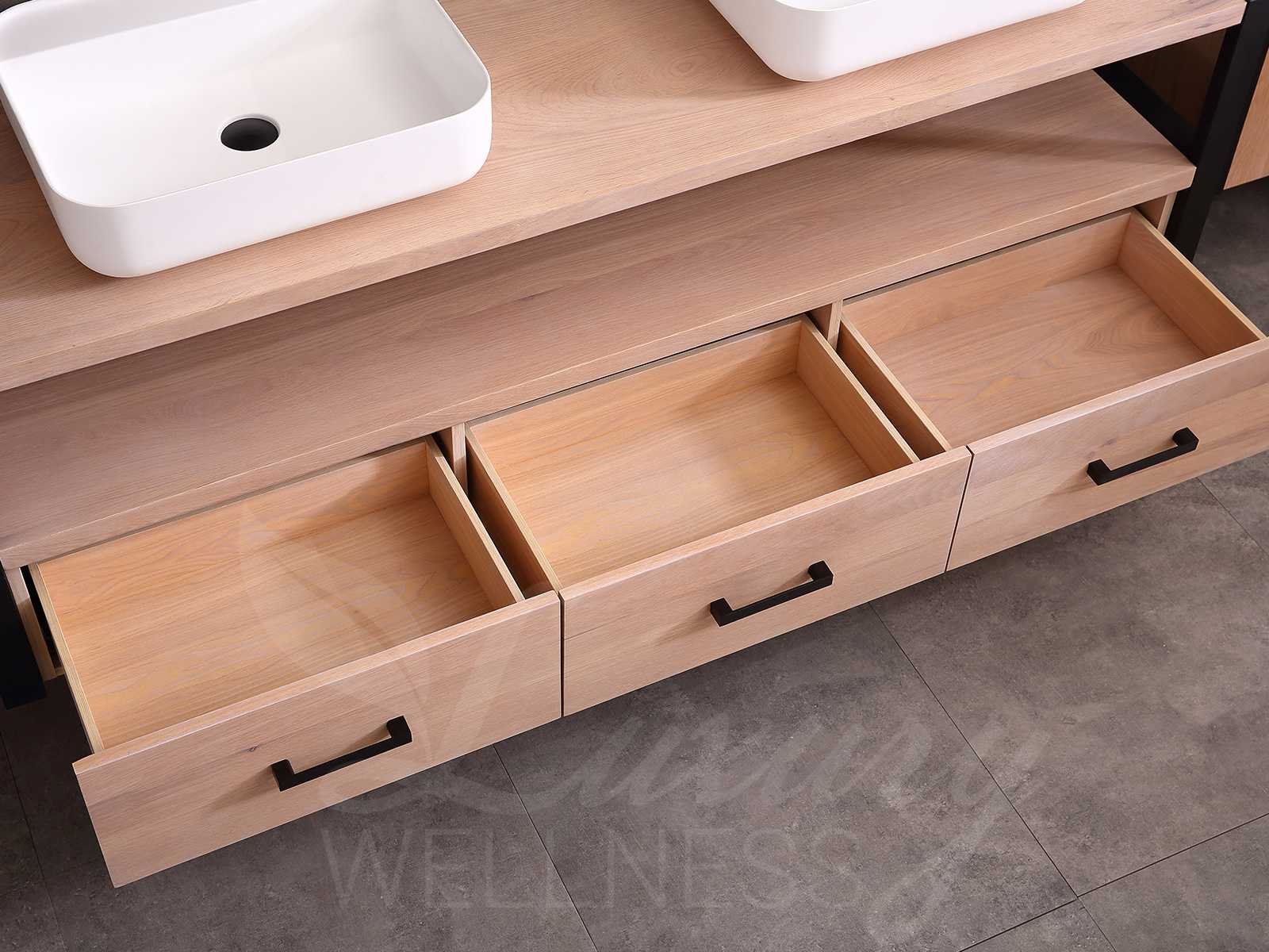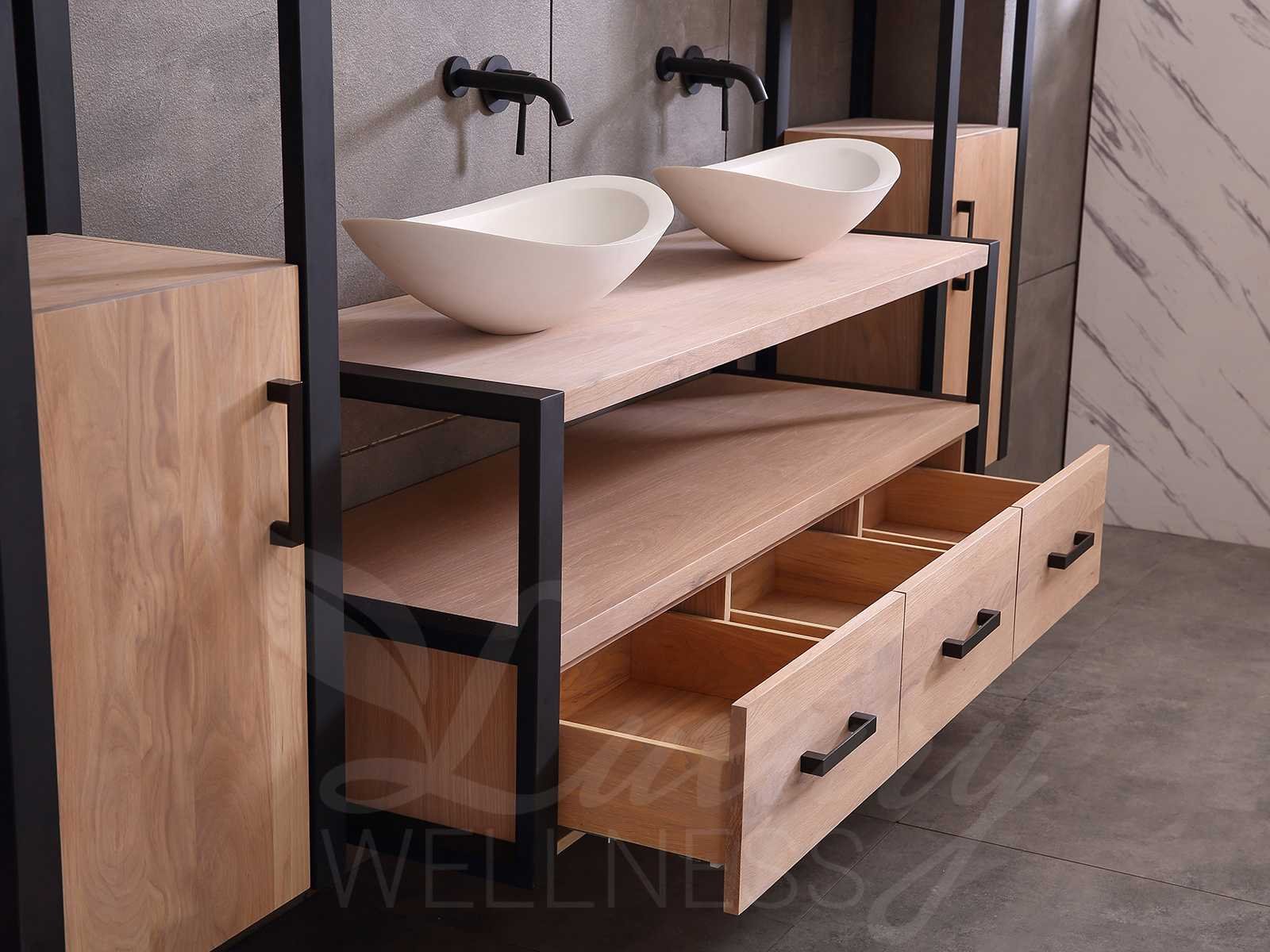 Afmeting meubel bxdxh 150x50x55cm - hangkasten 45x35x160cm(5cm rvs frame per kant), kleur eiken natural, materiaal 2cm massief eiken (front) met 3cm massief top overige en 5-laags multiplex(zeer sterk en vochtbestendig), Hangkast softclose deuren en extra planchets (hangkast is universeel en kan zowel links als rechts naast het meubel gehangen worden), kranen exclusief , Lades 2 stuks met softclose, Wastafel natuursteen of solid surface (keuze uit diverse modellen van de laatste foto's, kraangaten zijn nog niet in het top voorgeboord zodat u muurkranen of kranen uit het blad kan gebruiken, led spiegel met verwarming/klok en vergrootglas met ledverlichting, geïntegreerde vergrotingsspiegel van 10cm doorsnede met ledverlichting(vergroot 3x), digitale klok, digitale temperatuur aanduiding, 220volt stekker(plug and play), verwarming ter voorkoming van condens, 1.5mm kopervrij met explosion-proof laag met dezelfde functie als gehard glas(de spiegel mag geruild worden voor een ander model/type), afvoeren exclusief, Conditie: Nieuw in doos, Bijzonderheden 2 jaar garantie, compleet met installatie materiaal, zeer hoge kwaliteit, let op! 1 hangkast mag geruild worden voor een set kranen en popup afvoeren naar keus (graag op de afhaaldag aangeven) Merk: Mawialux Model: Philip Hoogte: 55cm Lengte: 50cm Breedte: 150cm Materiaal: Eiken Kleur: Eiken white wash Kraan: exclusief Wastafel: diverse keuzes Waskom: diverse keuzes Spiegel met verlichting: ja Verlichting: ja Lades: 3 Softclose: true Bevestigingsmateriaal: true Zijkast: ja 2x Afmeting hangkast: LxBxH 35x45x160