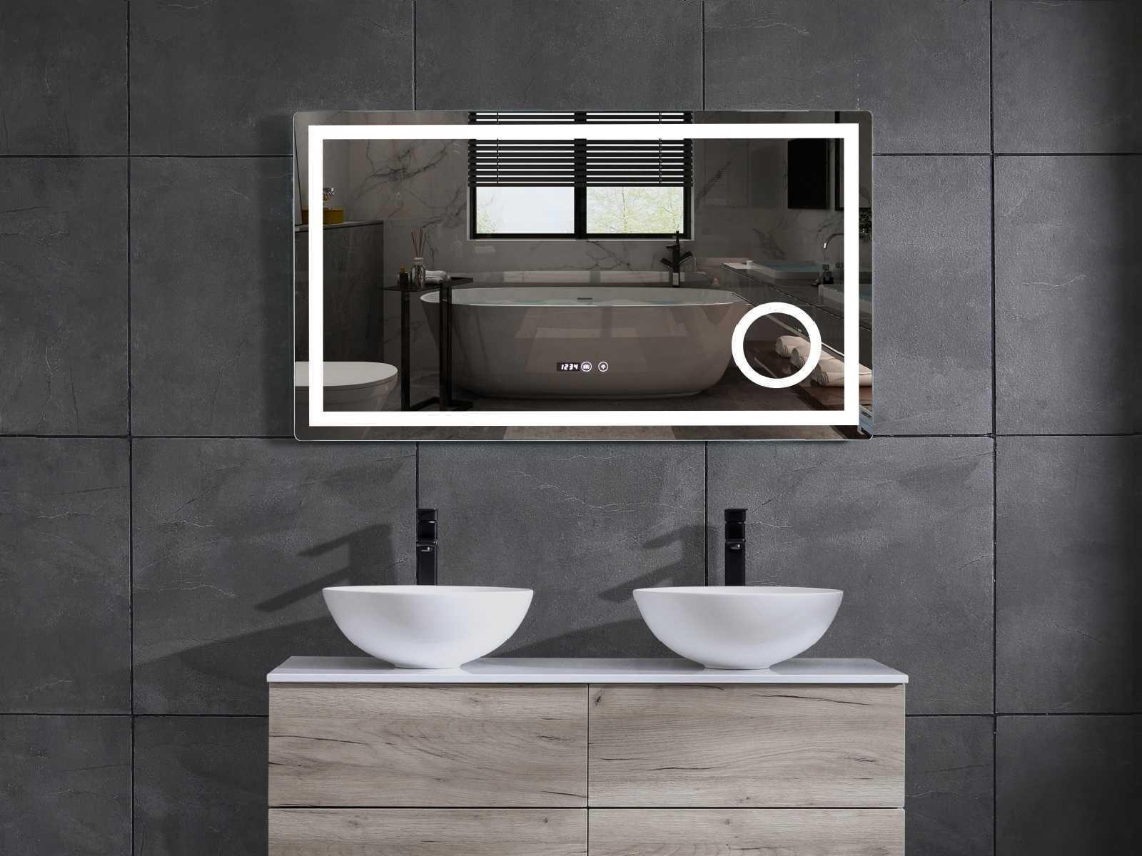 Keuze uit 3 afmetingen: 80 of 100 of 120cm (breedte keuze aangeven op de afhaaldag), met verwarming, bediening one-touch (voor heater en verlichting), verlichting 3 kleuren led 3000/4500/6000k led-dioden(dimbaar), materiaal aluminium frame, voorzien van digitale klok, digitale temperatuur aanduiding, geïntegreerde vergrotingsspiegel met ledverlichting(vergroot 3x), 220volt stekker(plug and play) Merk: Mawialux Model: Iris Hoogte: 70cm Touchscreen: true