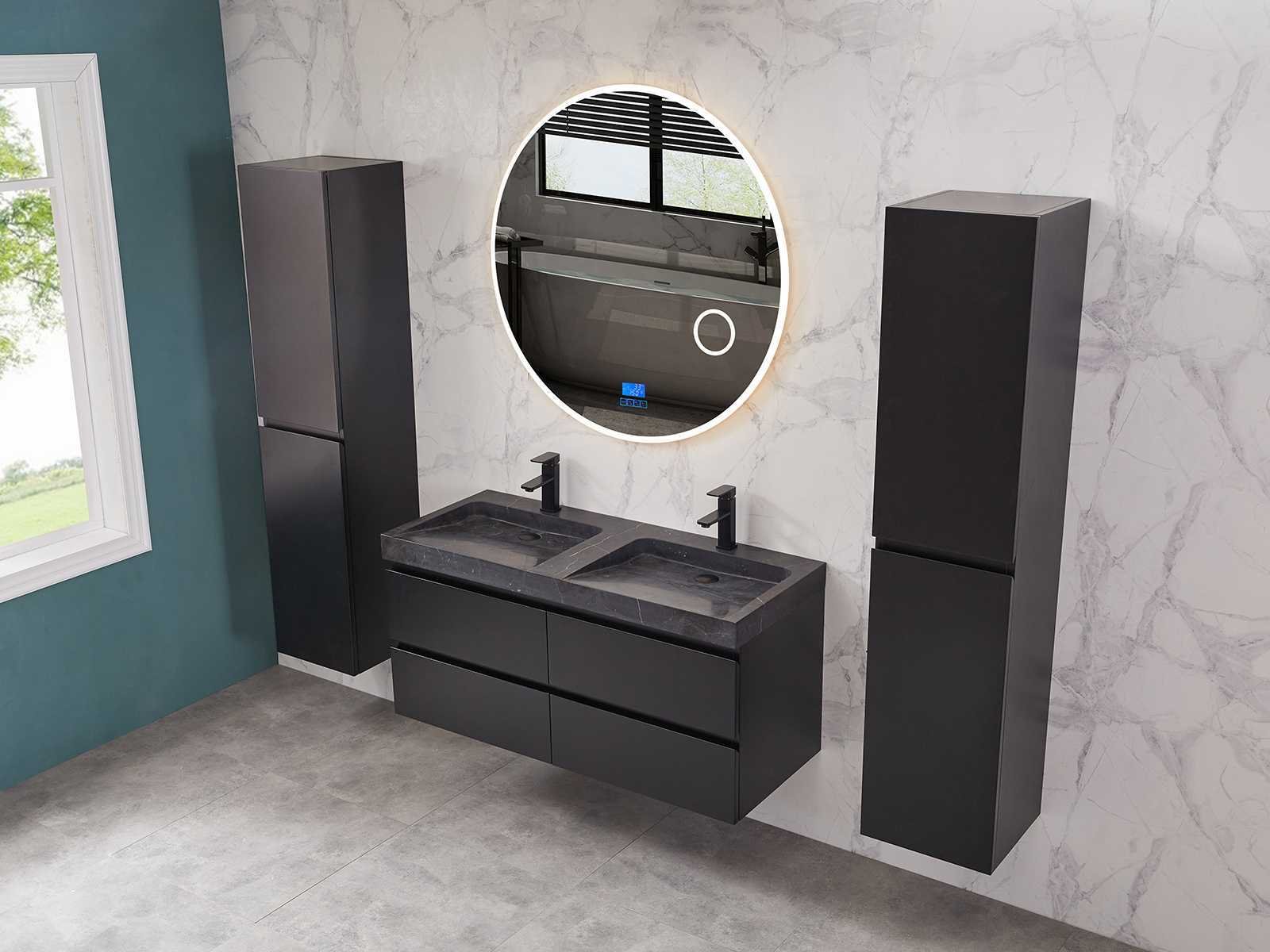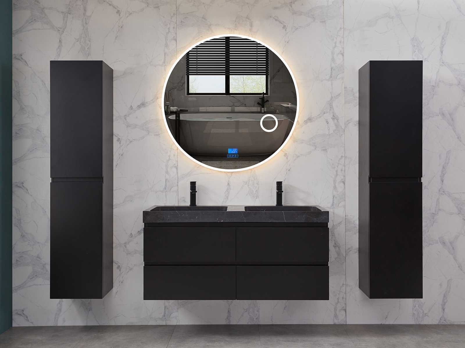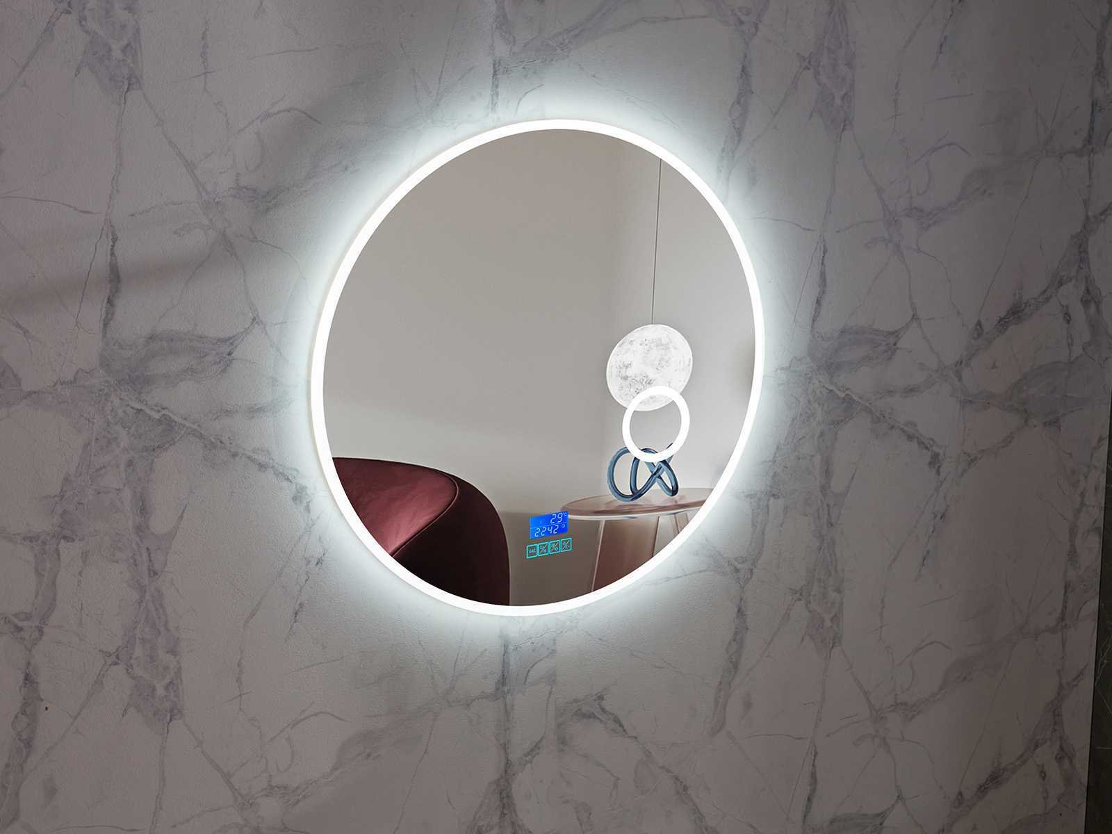 Keuze uit 4 diameters: 70, 80, 90 of 100cm (keuze graag doorgeven op de afhaaldag),verwarming, bediening one-touch (voor heater, verlichting, bluetooth en instellingen), verlichting aan de voorkant met een lichtband en rondom aan de achterkant met een lichtdoorlatende acrylrand met 3 verstelbare en dimbare kleuren led 3000/4500/6000k led-dioden (geel/blauw/wit licht), voorzien van digitaal display, bluetooth met 2 speakers, digitale klok, temperatuur aanduiding, 220volt stekker(plug and play), geïntegreerde vergrotingsspiegel van 10cm doorsnede met ledverlichting (vergroot 3x), 1.5mm kopervrij glas met explosion-proof laag, de spiegel is rondom voorzien van een acrylrand waardoor de led verlichting niet zichtbaar is vanaf de zijkant Merk: Mawialux Model: Laine Breedte: 70-100cm Hoogte: 90cm Touchscreen: true Bluetooth: true