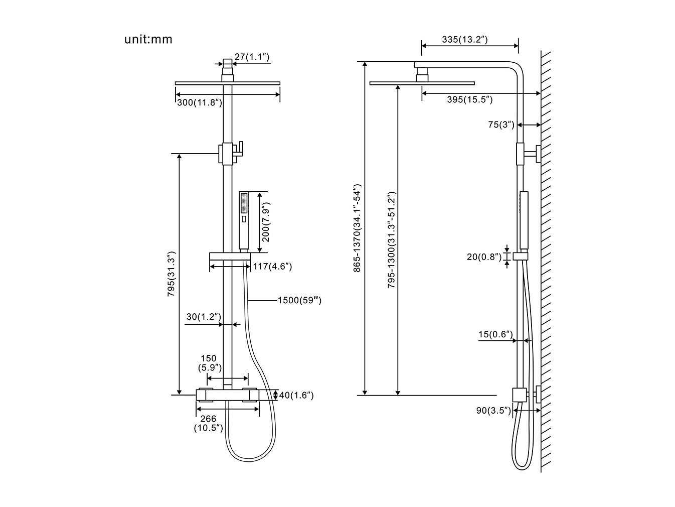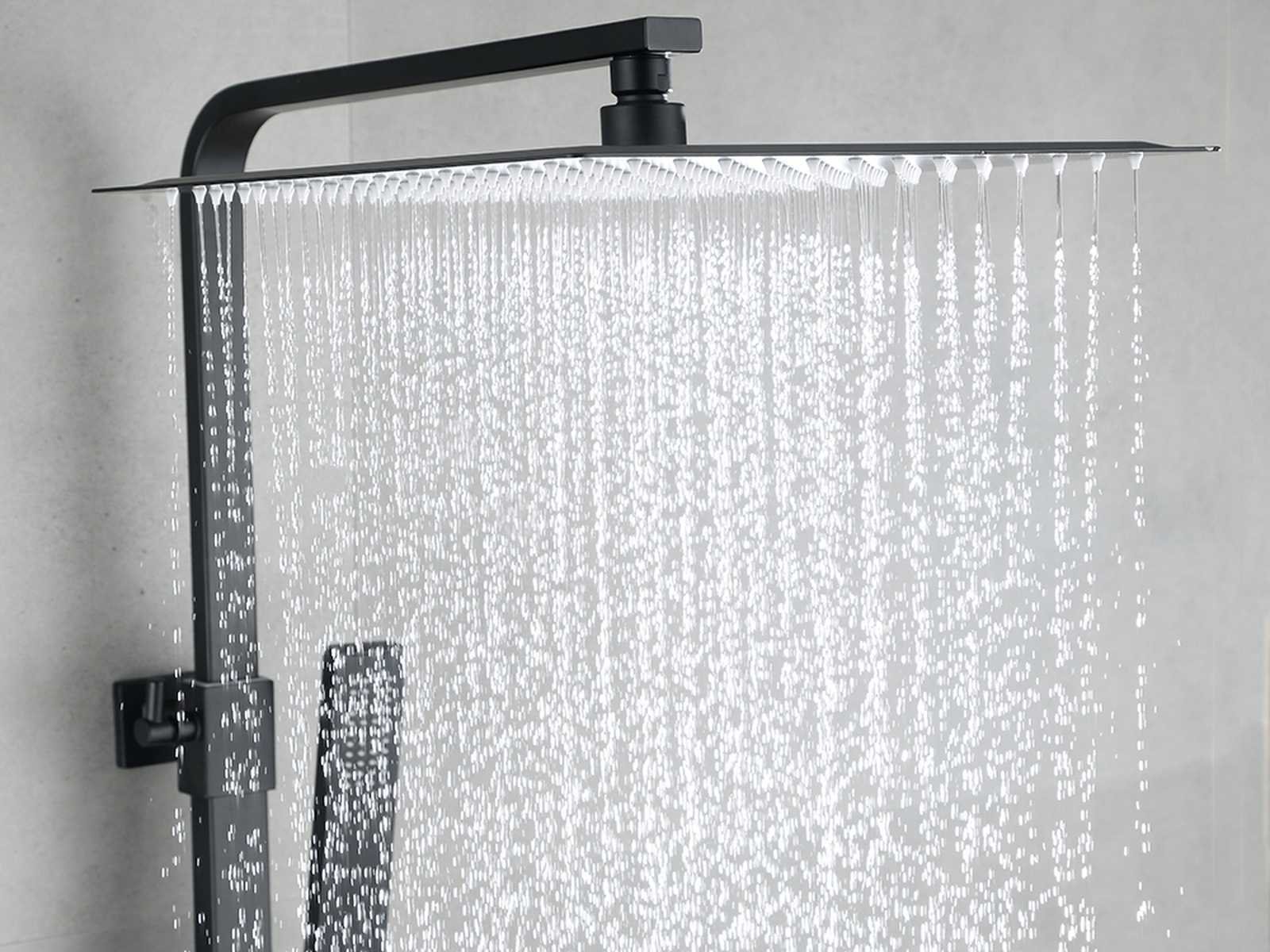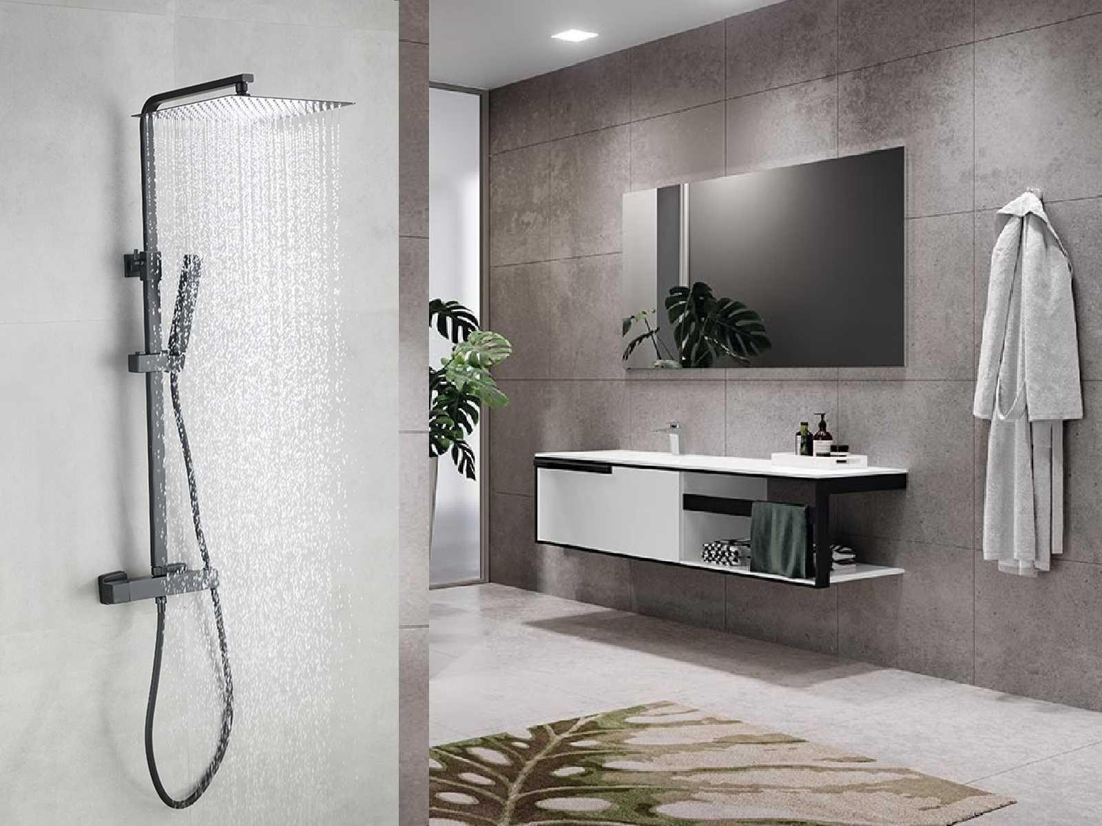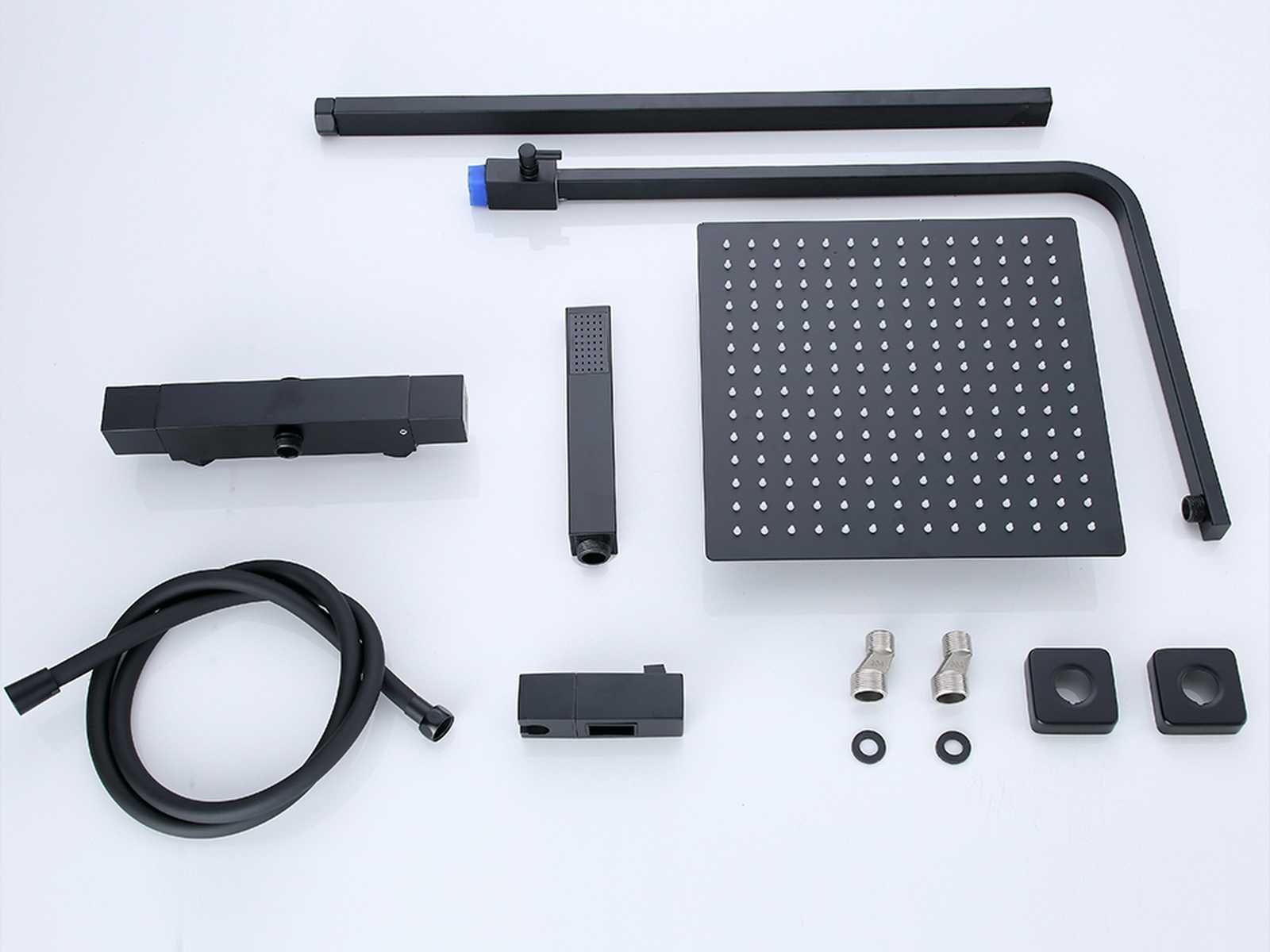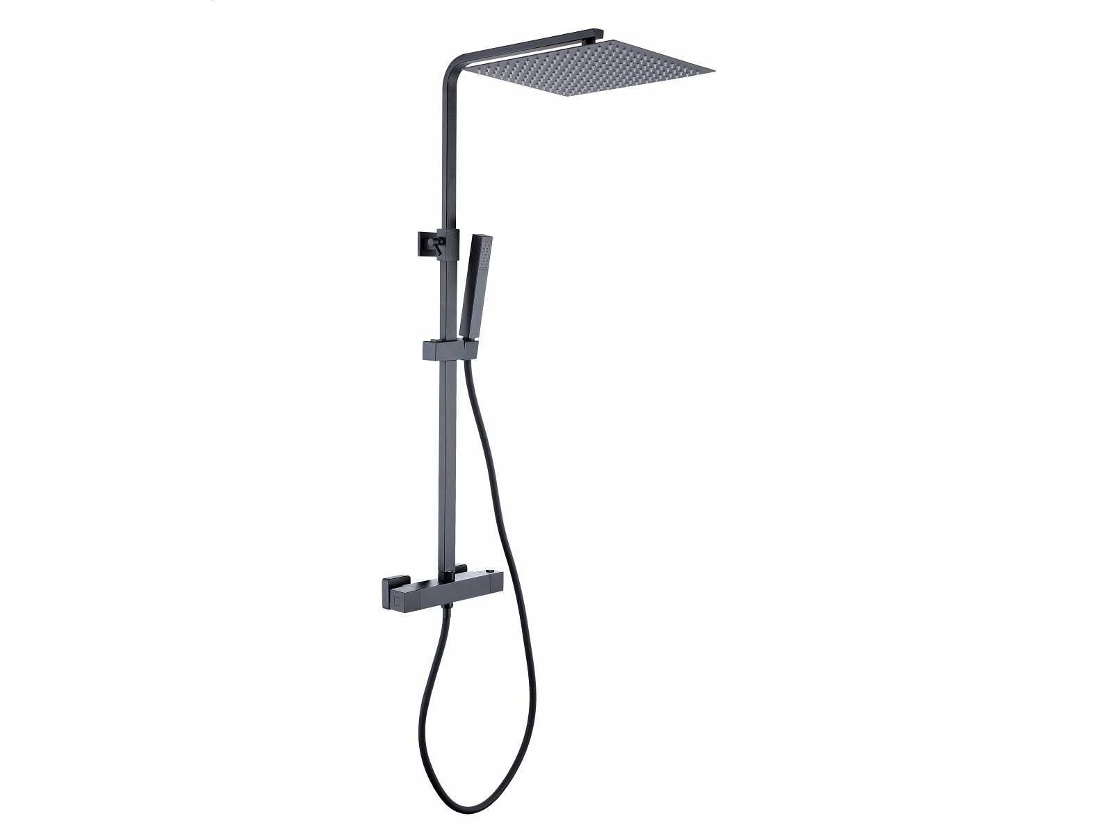 Materiaal: messing en RVS. Kraan: thermostaatkraan. Binnenwerk: keramisch. Douchekop: plat design 30 x 30 cm van RVS. Handdouche: verstelbaar met doucheslang. Hoogte: verstelbaar. Voorzien van: douchekop met kunststof wateruitlopen om gemakkelijk kalkaanslag te verwijderen. RVS douchekop en keramisch binnenwerk. Bijzonderheden: h.o.h. afstand van 150 mm (incl. s-koppelingen). Merk: Mawialux Model: Cynthia Kleur: mat zwart