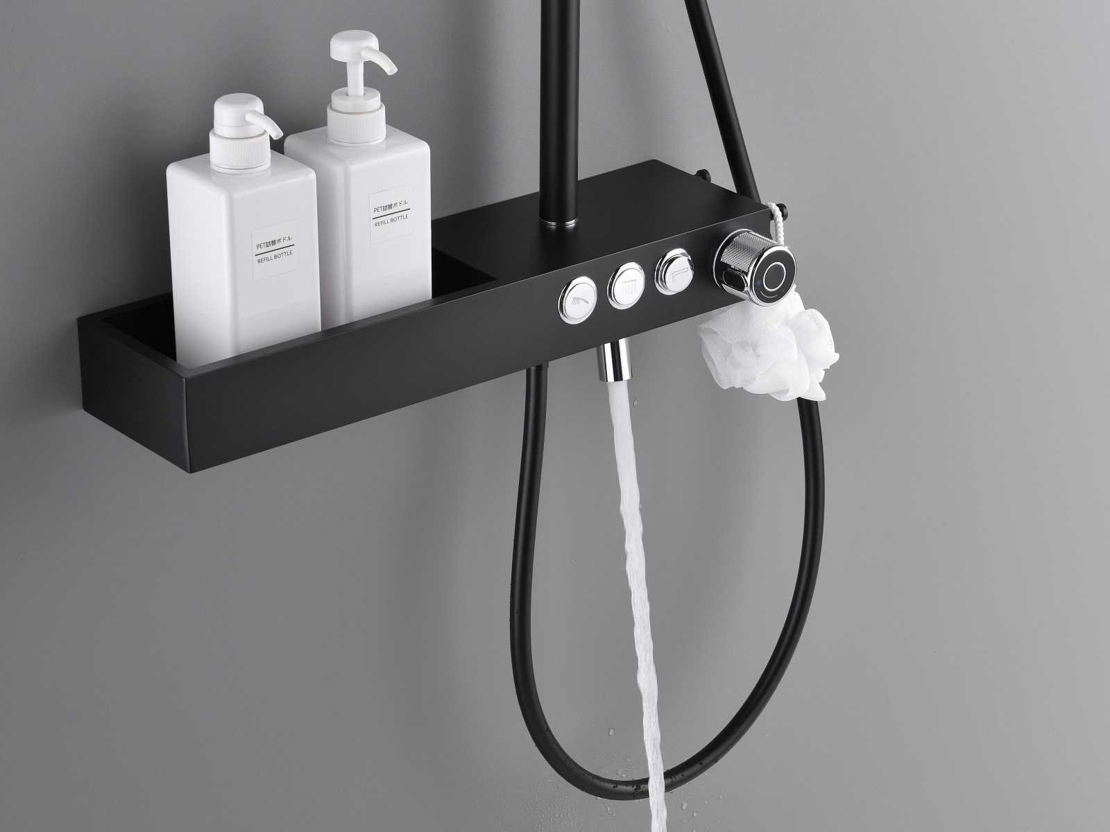 De doucheset is uitgerust met drie functies. De hoofddouche, handdouche (met twee standen) en een baduitloop. Deze functies worden afzonderlijk van elkaar gebruikt doormiddel van drukknoppen. Door de aanwezigheid van de baduitloop is deze doucheset ook geschikt voor douchebaden. De doucheset beschikt over keramische binnenwerken zodat je jarenlang plezier zult hebben van jouw regendoucheset. Doordat de doucheset in hoogte verstelbaar is past hij in vrijwel elke badkamer! De hartafstand van deze doucheset is 15cm. Materiaal: messing. Kleur: mat zwart (met chrome toetsen en baduitloop). Kraan: thermostaatkraan. Binnenwerk: keramisch. Douchekop: 26 x 20 cm. Handdouche: met 2 waterfuncties en doucheslang. In hoogte en draairichting verstelbare ophanging. Hoogte: verstelbaar. Voorzien van: 3 druktoetsen waarmee de 3 waterfuncties bediend kunnen worden. Douchekop met kunststof wateruitlopen om gemakkelijk kalkaanslag te verwijderen. Douchekop kantel en draaibaar. Keramisch binnenwerk. Bijzonderheden: h.o.h. afstand van 150mm. Merk: Mawialux Model: Anto Kleur: mat zwart/chroom