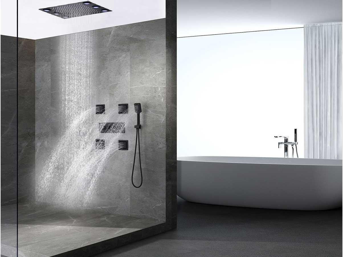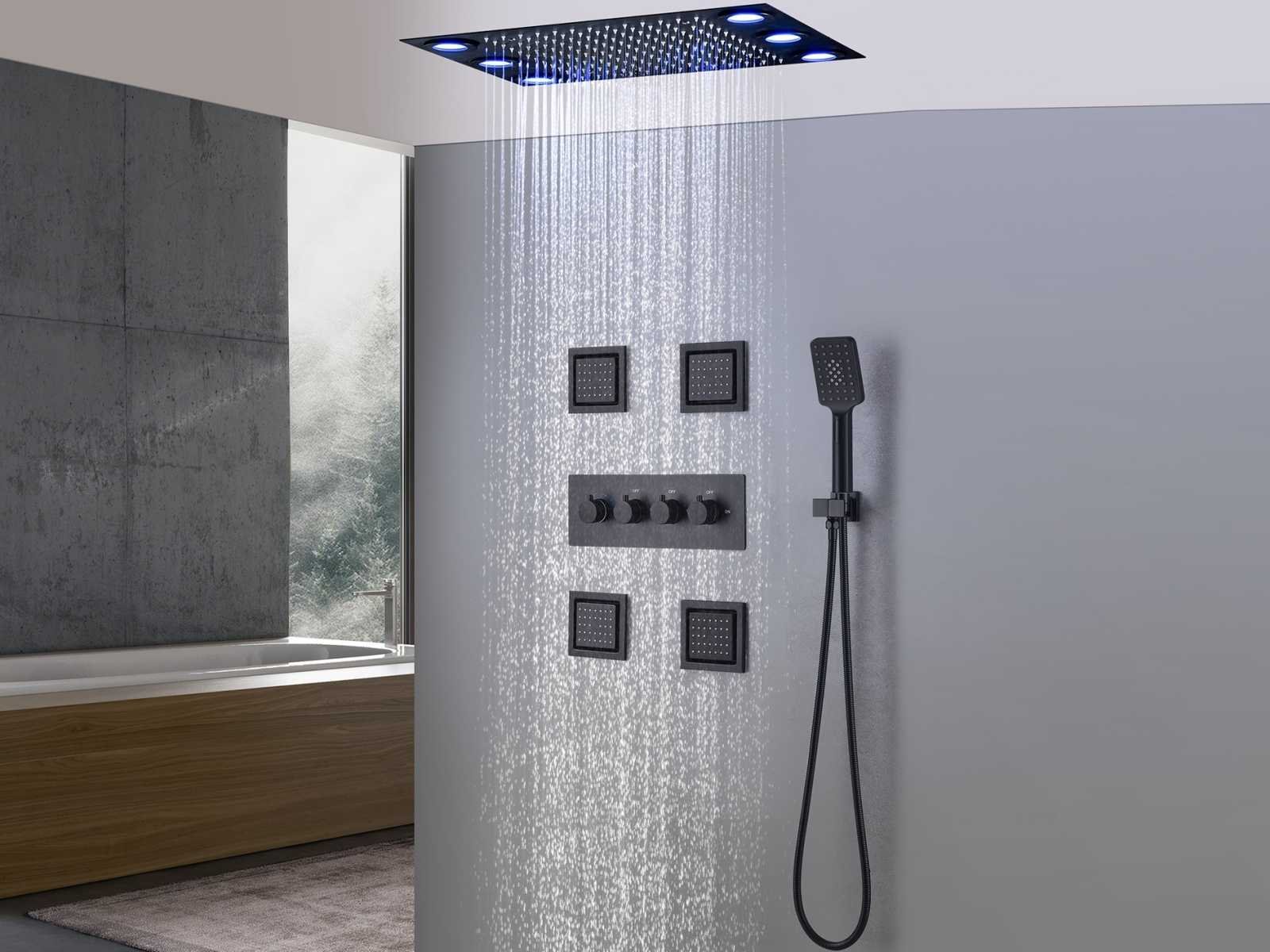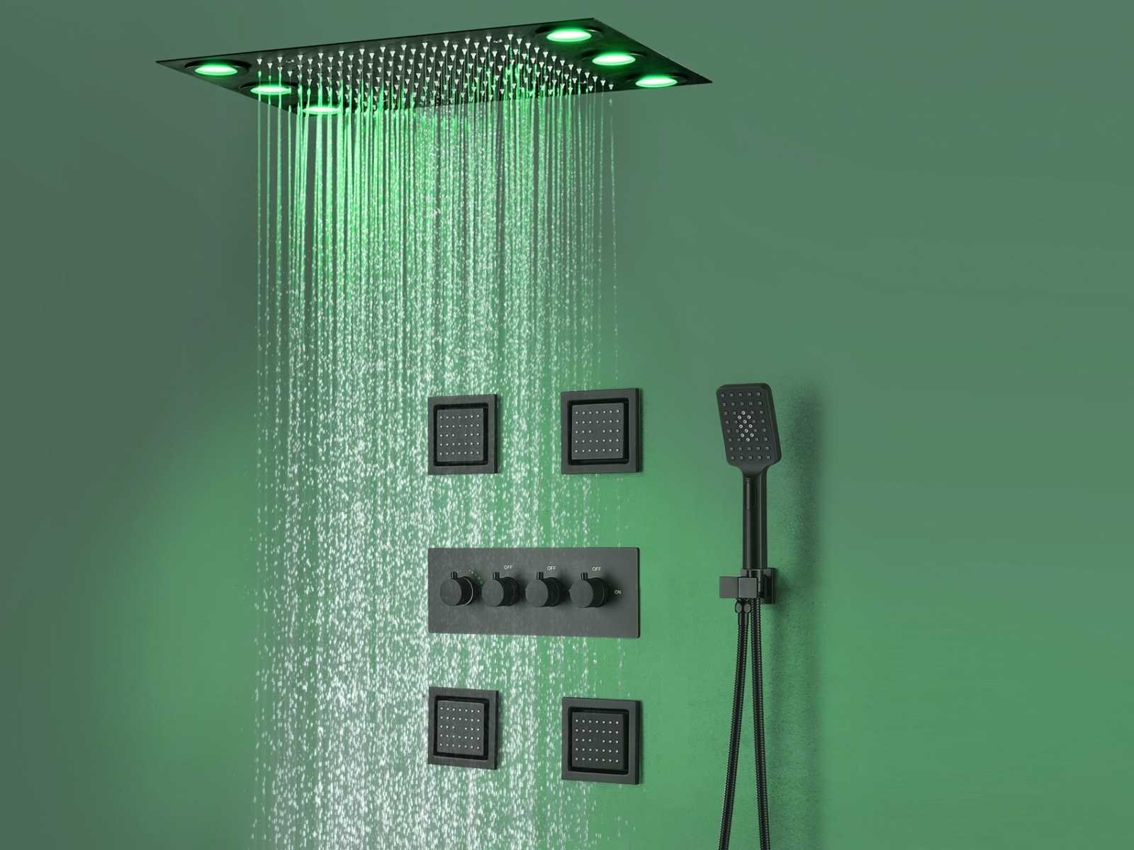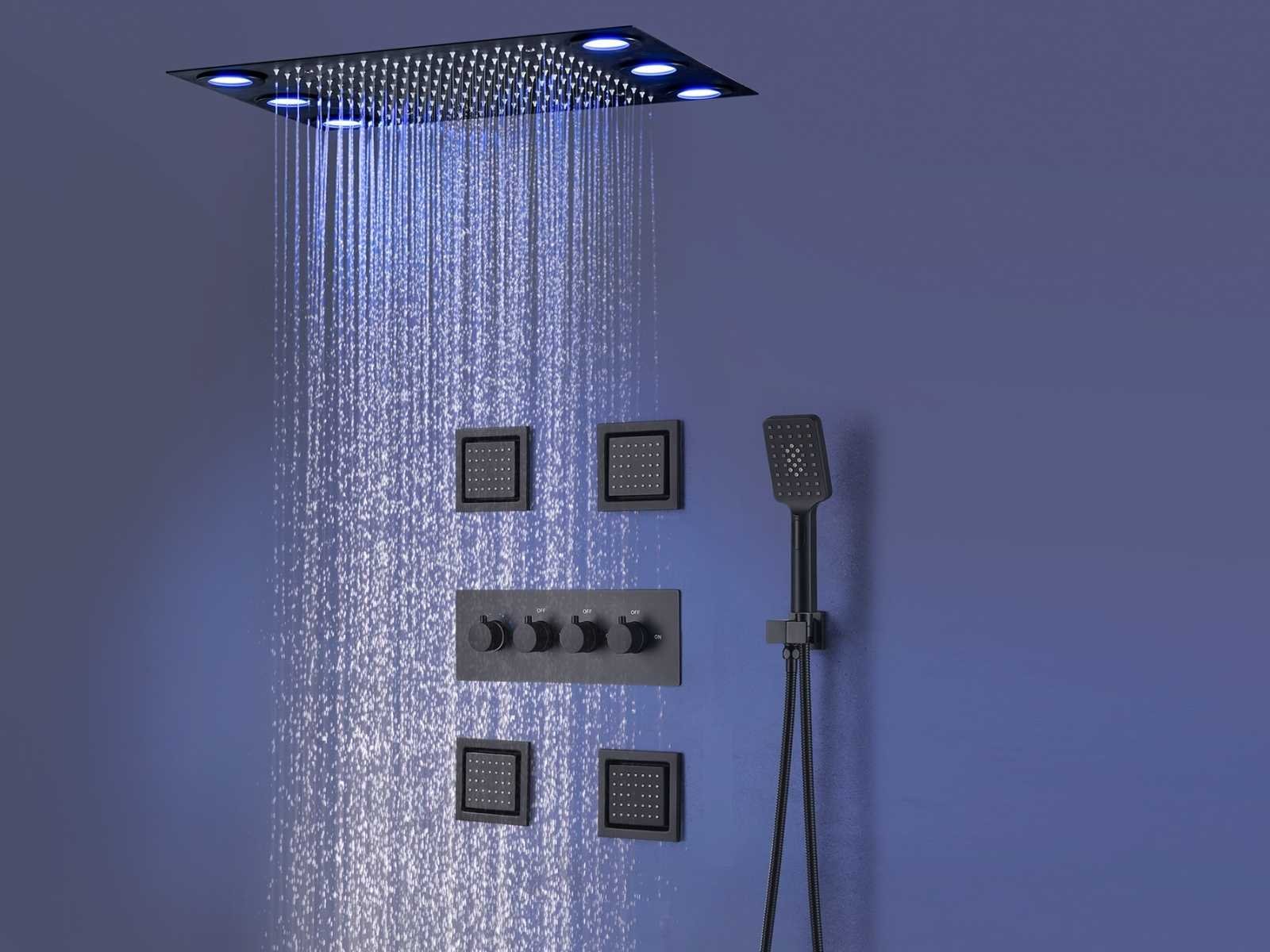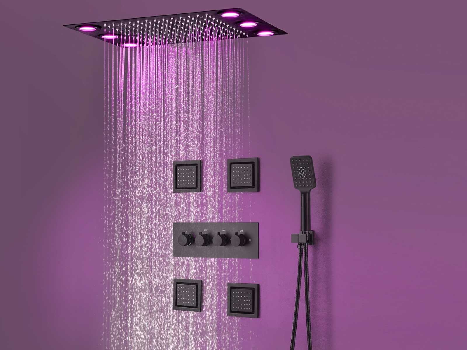 Materiaal messing en 304 rvs, kleur mat zwart, smart control thermostaatkraan met 3 regelknoppen, binnenwerk keramisch, douchekop 50x36 cm uit 304 rvs en 6 stuks ledverlichting, handdouche verstelbaar met 2 functies en doucheslang met draaibare messing ophanging, voorzien van 4 stuks messing massagejets van 10cm doorsnee (draaibaar), grote douchekop met kunststof wateruitlopen om gemakkelijk kalkaanslag te verwijderen, keramisch binnenwerk, werking temperatuur 0 tot 90 graden celsius, anti kalk behandelddouchekop en handdouche en massagejets kunnen allemaal tegelijk of onafzondelijk gebruikt/geregeld worden Merk: Mawialux Model: Boxer Kleur: mat zwart