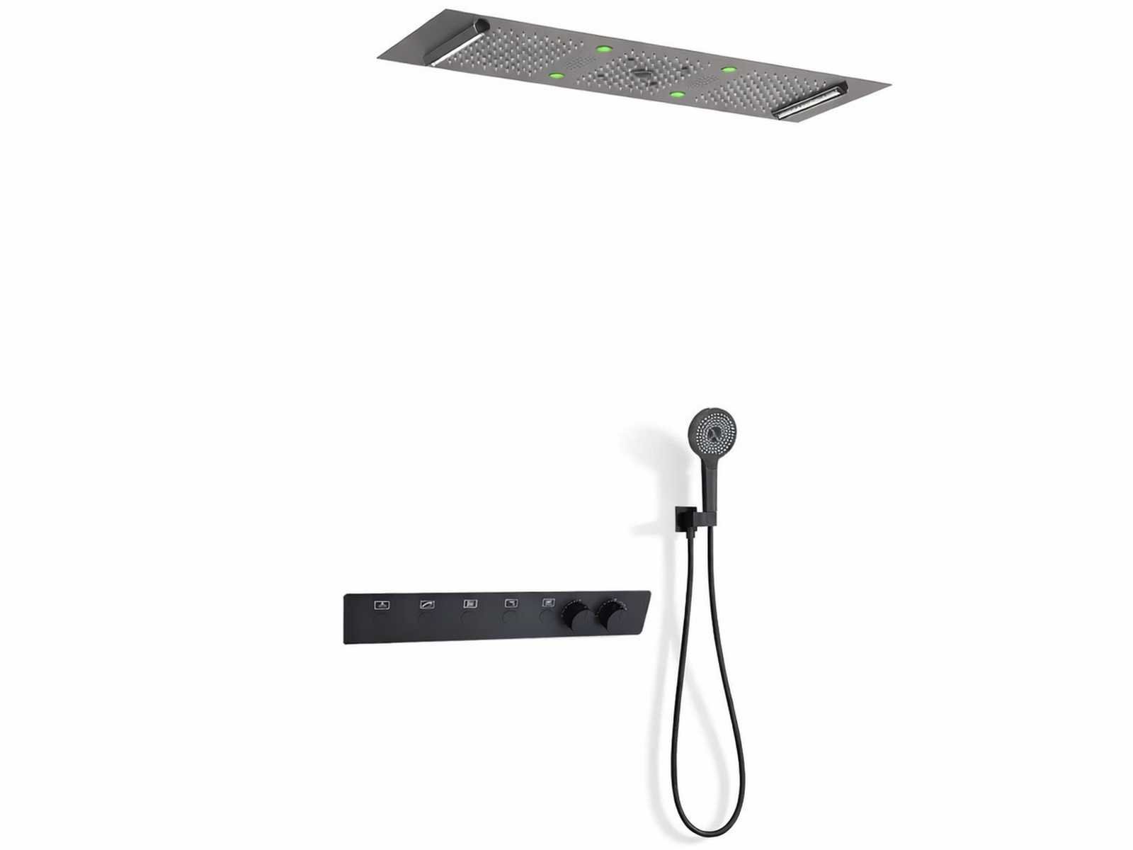 Bluetooth met speakers, materiaal messing en 304 rvs, smart control thermostaatkraan met 5 drukknoppen en 2 regelknoppen, binnenwerk keramisch, douchekop 90x30 cm met 5 functies uit 304 rvs en ingebouwde ledverlichting, handdouche verstelbaar met doucheslang en messing ophanging, douchekop met vernevelaars + waterval + sproeiers + 3 regendouche zones, afstandsbediening voor kleuren regeling, kunststof wateruitlopen om gemakkelijk kalkaanslag te verwijderen, alle water functies kunnen allemaal tegelijk of onafzonderlijk gebruikt/geregeld worden Merk: Mawialux Model: luxury line Kleur: mat zwart