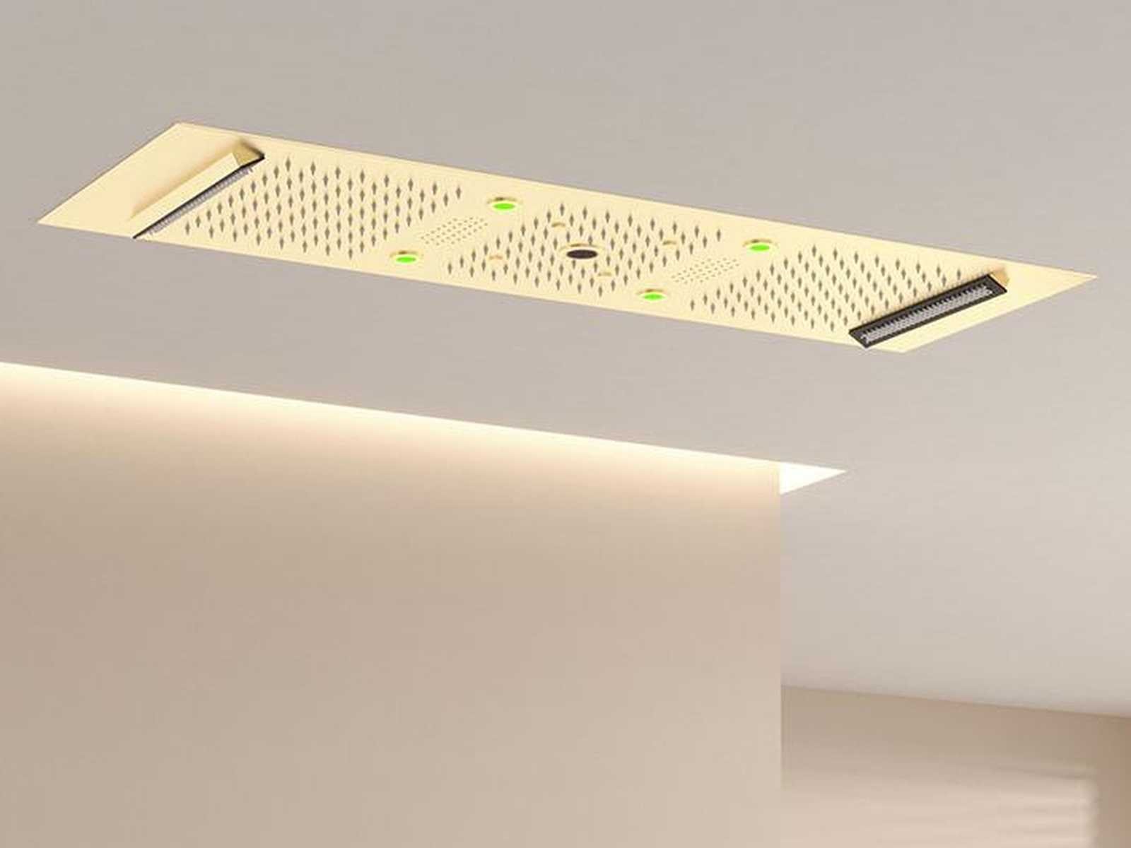 Bluetooth met speakers, materiaal messing en 304 rvs, smart control thermostaatkraan met 5 drukknoppen en 2 regelknoppen, binnenwerk keramisch, douchekop 90x30 cm met 5 functies uit 304 rvs en ingebouwde ledverlichting, handdouche verstelbaar met doucheslang en messing ophanging, douchekop met vernevelaars + waterval + sproeiers + 3 regendouche zones, afstandsbediening voor kleuren regeling, kunststof wateruitlopen om gemakkelijk kalkaanslag te verwijderen, alle water functies kunnen allemaal tegelijk of onafzonderlijk gebruikt/geregeld worden Merk: Mawialux Model: luxury line Kleur: geborsteld goud