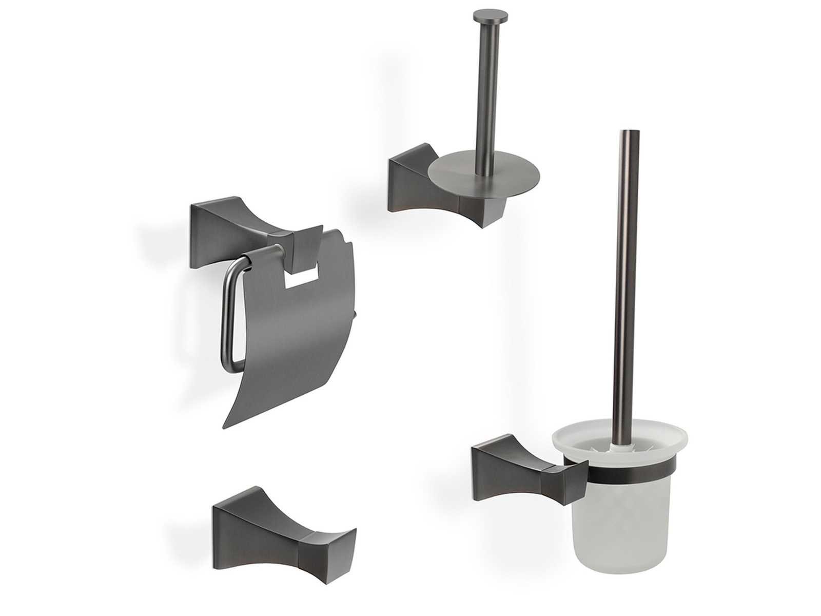 Set 4-delig, materiaal messing, kleur gunmetal grey, voorzien van toiletborstel met houder, toiletrolhouder met klep, reserverol houder, haak, bevestigingsmateriaal, LET OP: boven een bod van 60,- euro excl BTW en veilingkosten versturen we dit product gratis binnen de benelux naar u toe per post. Merk: Mawialux