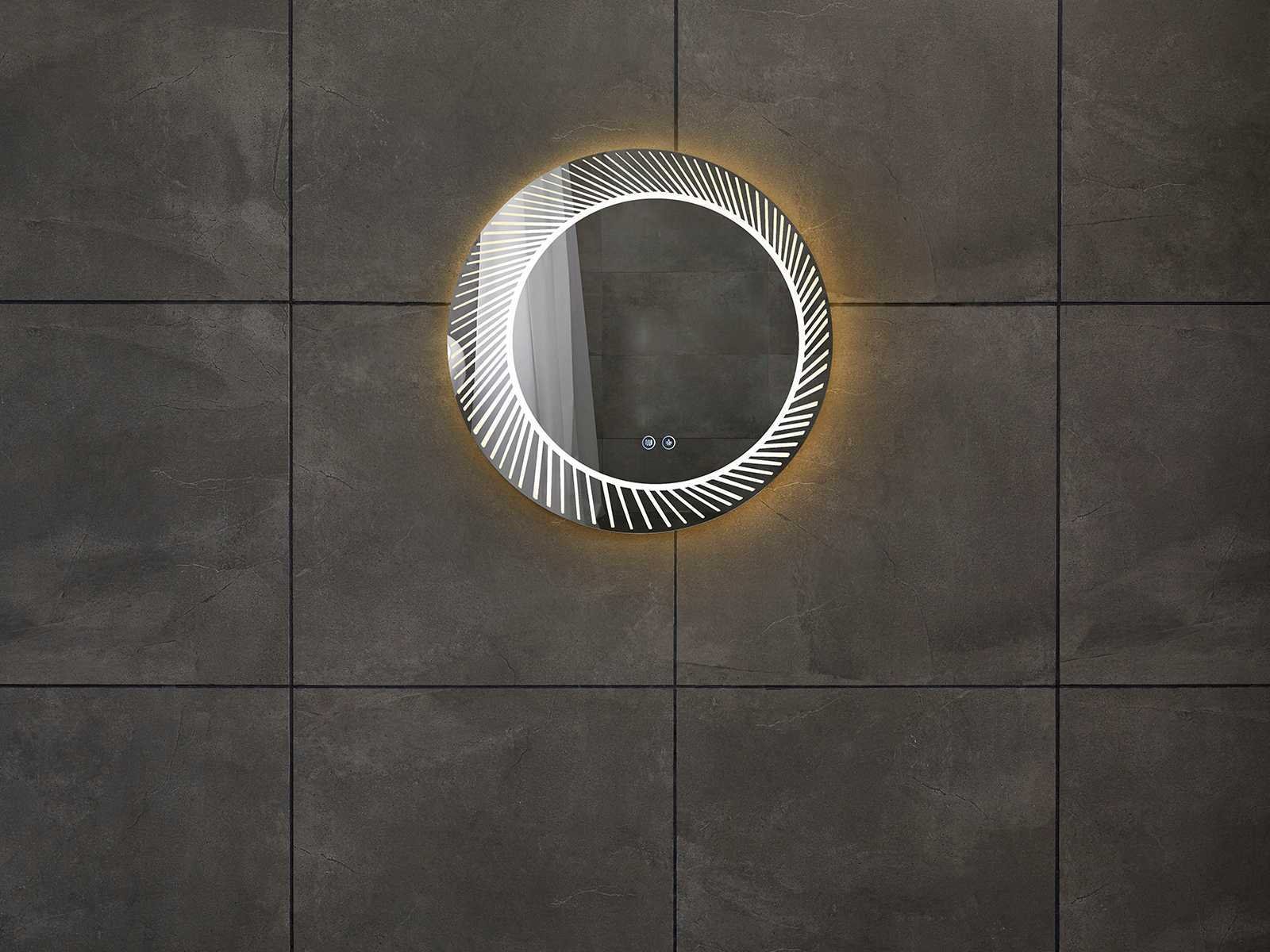 Keuze uit diverse diameters: 60,80,100cm (keuze graag doorgeven op de afhaaldag), verwarming, bediening one-touch, verlichting rondom aan de achterkant met 3 verstelbare kleuren led 3000/4500/6000k led-dioden(dimbaar) (geel/blauw/wit licht), 220volt stekker(plug and play), glas 1.5mm kopervrij met explosion-proof laag Merk: Mawialux Model: Imelda