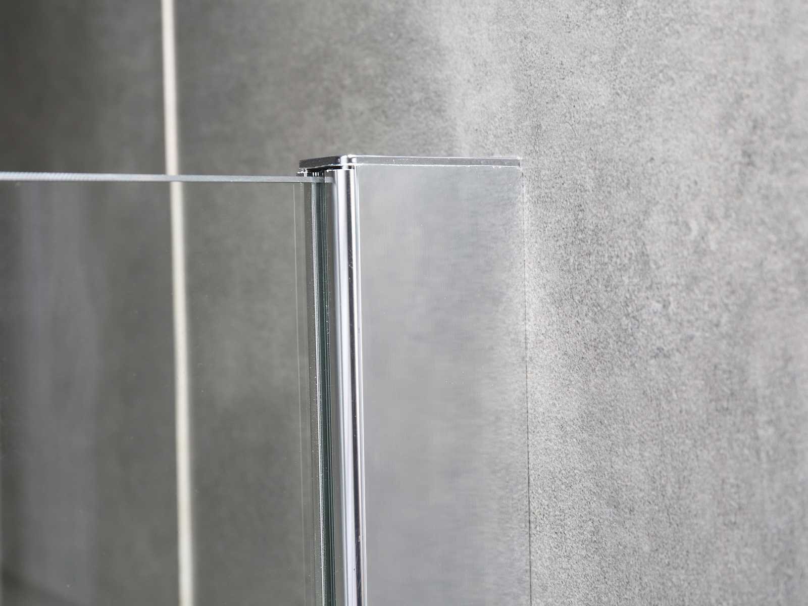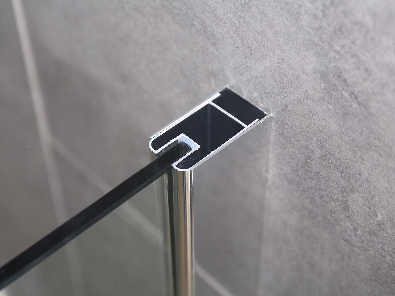 Kleur chroom, materiaal aluminium profiel met messing ophanging, glas 8mm dik helder nano gecoat veiligheidsglas (vermindert kalkaanslag), voorzien van onzichtbare schroefbevestiging - hoek verstevigingsblok voor vloer - bevestiging materiaal - vierkante bevestiging stang van messing 120cm (in te korten naar gewenste maat), wandprofiel 20 mm verstelbaar Merk: Mawialux Model: Mesa Breedte: 100cm Hoogte: 195cm