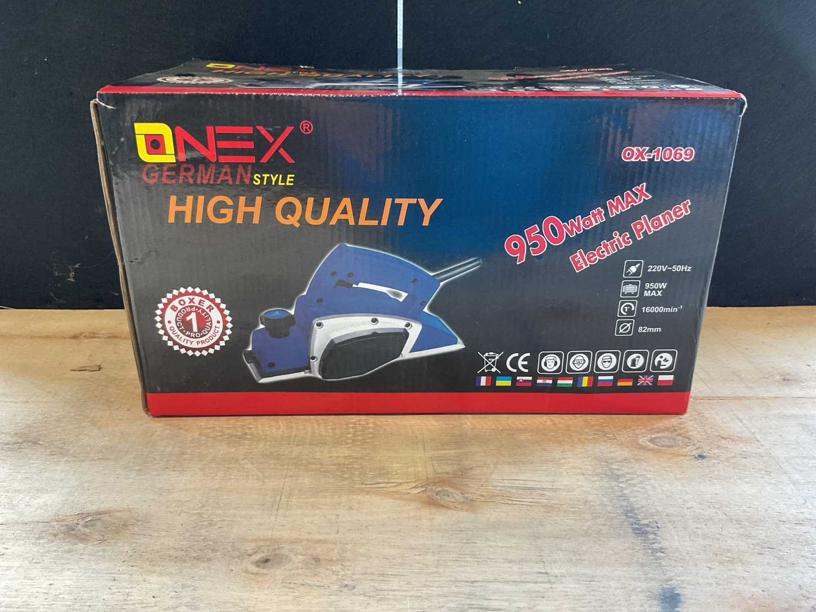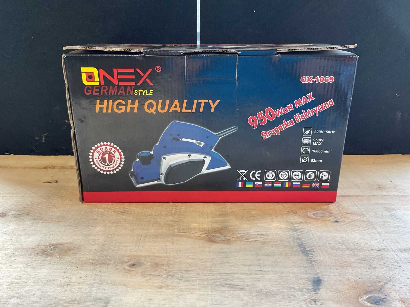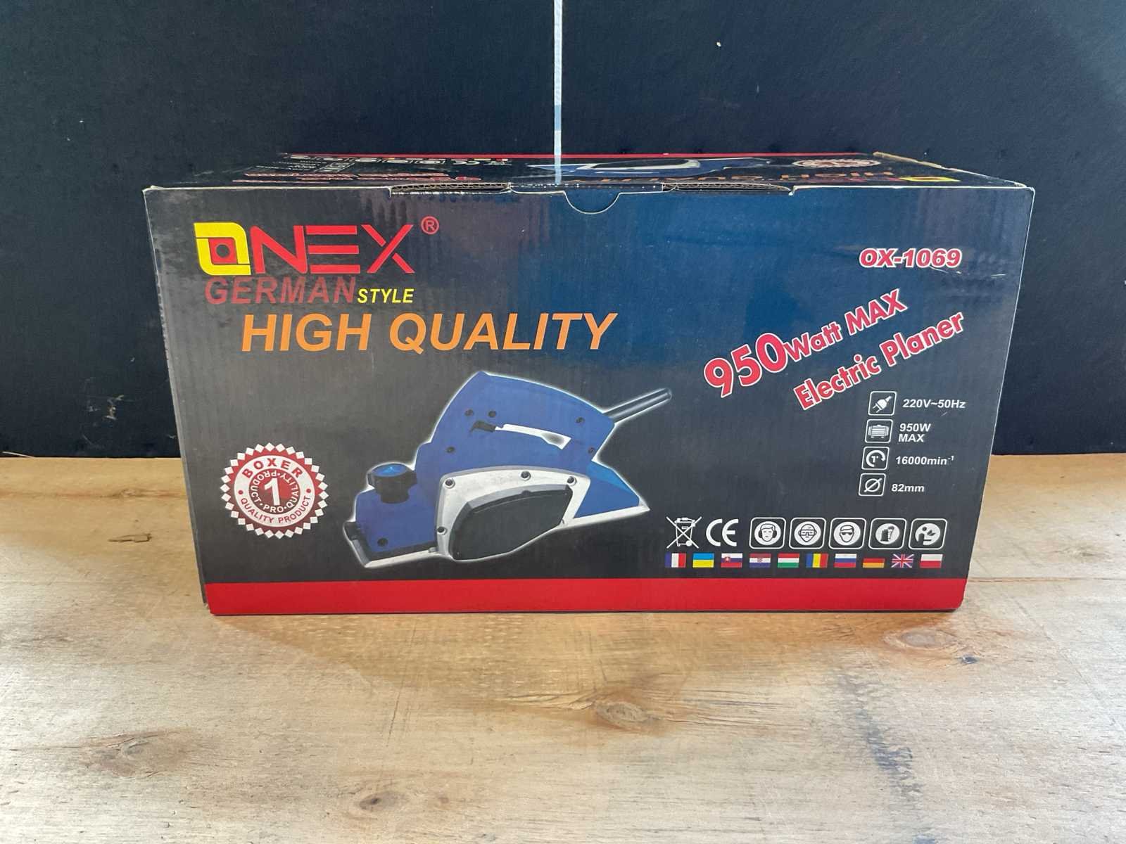 Afmeting verpakking 350x165x180mm Merk: Onex German Style Model: OX-1069 Vermogen: 950W Toerental: 16000rpm Schaafbreedte: 82mm Gewicht: 2.66kg Spanning: 220V
