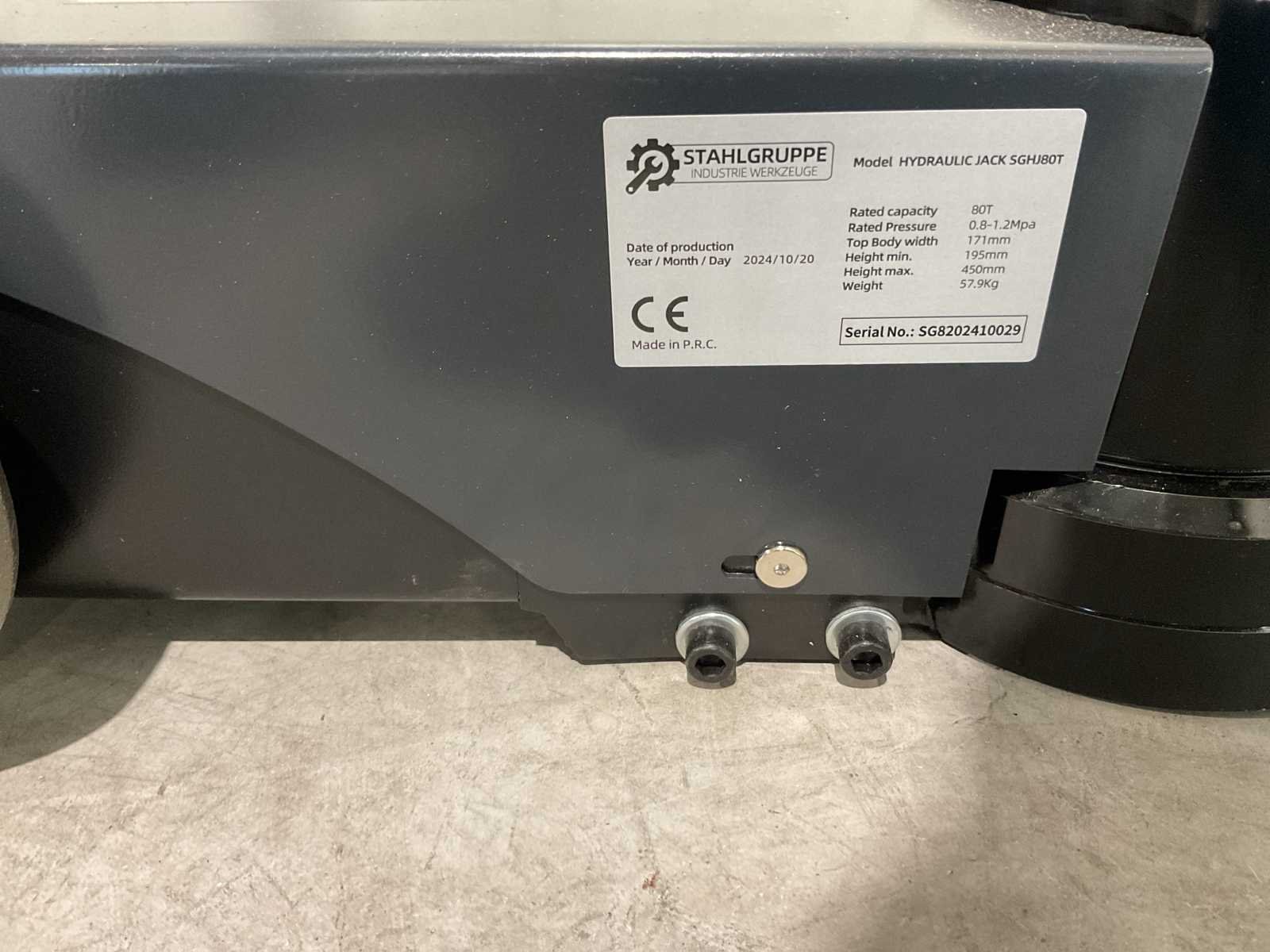 Voorzien van Hydraulische krik; 8 Bar werkdruk; 80 Ton tilkracht; 3 Traps cilinder; ongebruikt in 2 dozen Merk: Stahlgruppe Type: SGHJ80T Bouwjaar: 2025 Capaciteit.: 80t Eigen gewicht: 64.1kg Totale afmeting L: 64.5mm Totale afmeting Breedte: 32mm Totale afmeting Hoogte: 29.5mm