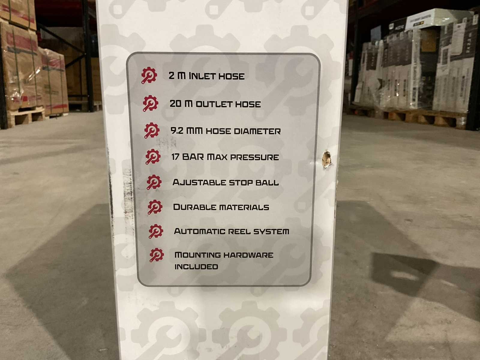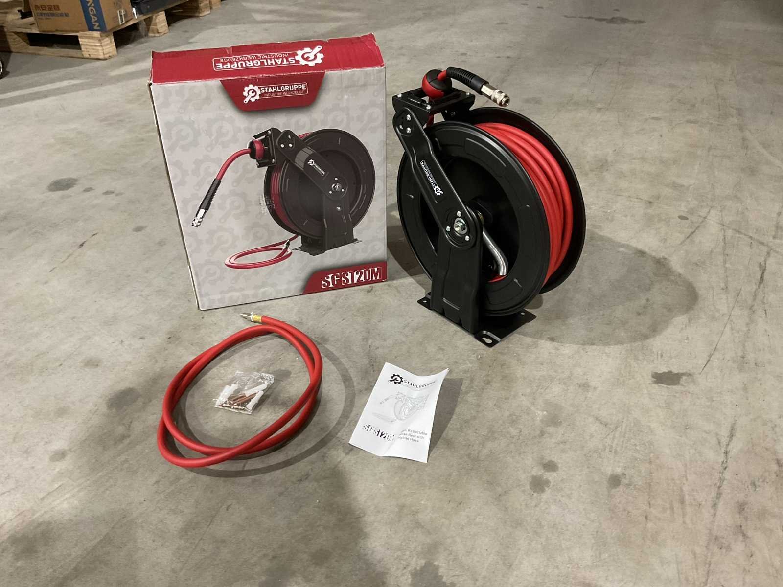 Voorzien van 20m slang; 2m aansluit slang; 9.2 mm diameter slang; 17 bar max werkdruk; verstelbare stop bal; automatische oprollend systeem; inclusief muur bevestiging; ongebruikt in doos Merk: Stahlgruppe Gewicht: 12kg Lengte: 45cm Breedte: 25cm Hoogte: 55cm Materiaal: Staal
