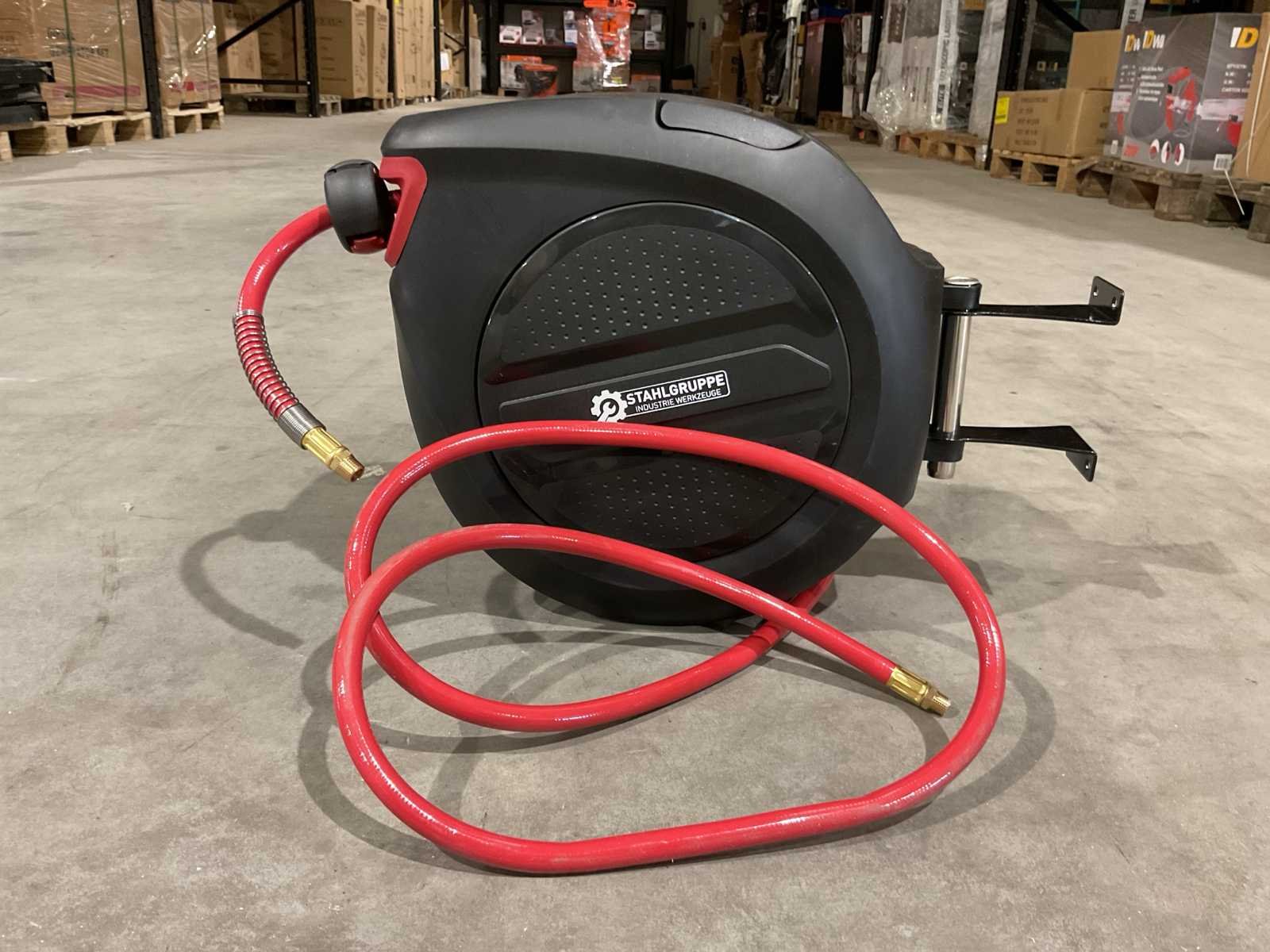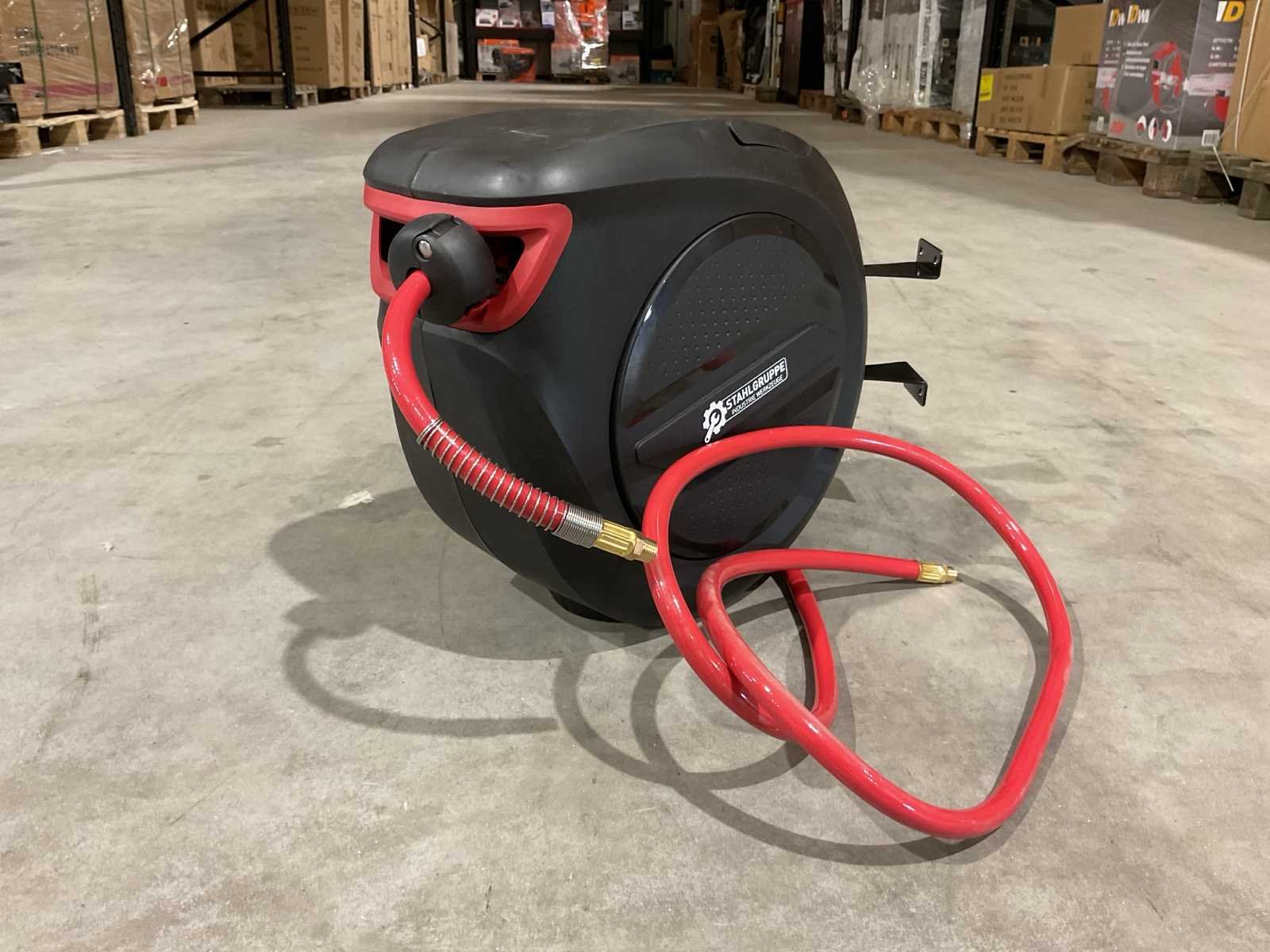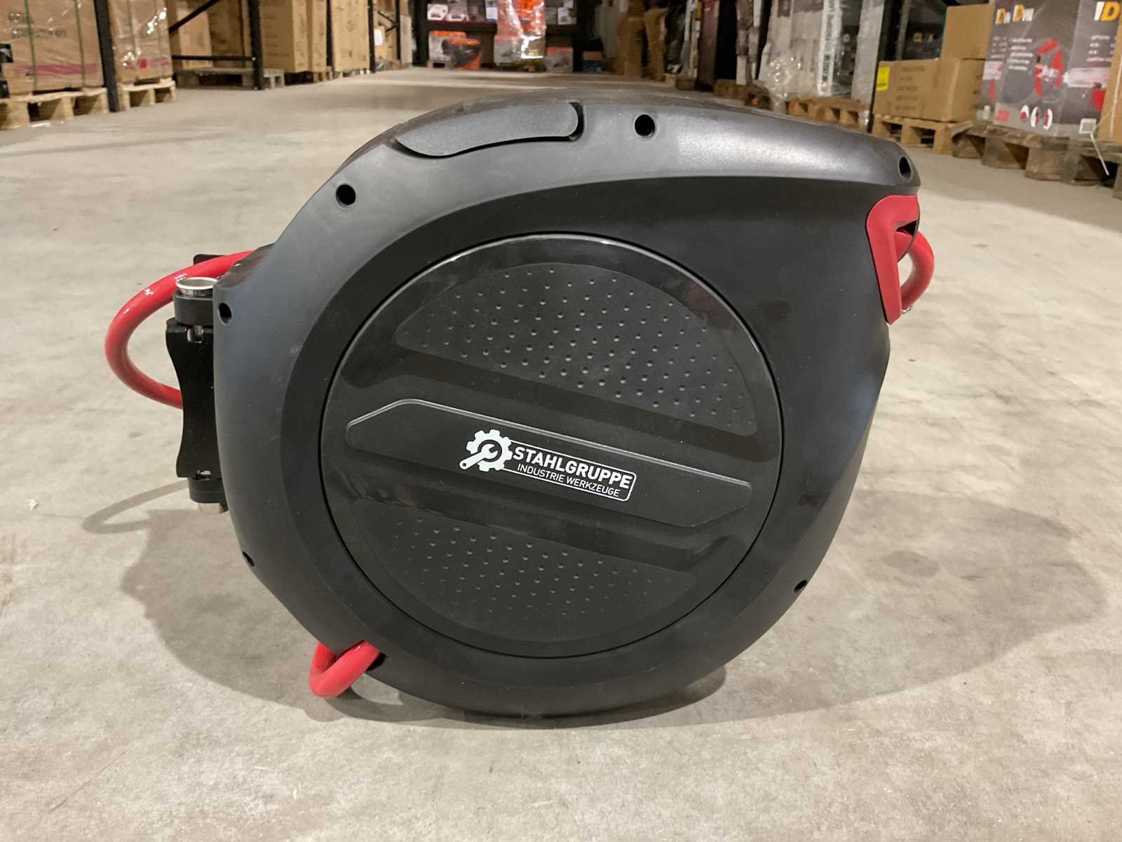 Voorzien van 20m slang; 2m aansluit slang; 9.5 mm diameter slang; 17 bar max werkdruk; verstelbare stop bal; automatische oprollend systeem; inclusief muur bevestiging; ongebruikt in doos Merk: Stahlgruppe Type: SGLT20M Bouwjaar: 2025 Gewicht: 7kg Lengte: 45cm Breedte: 25cm Hoogte: 40cm