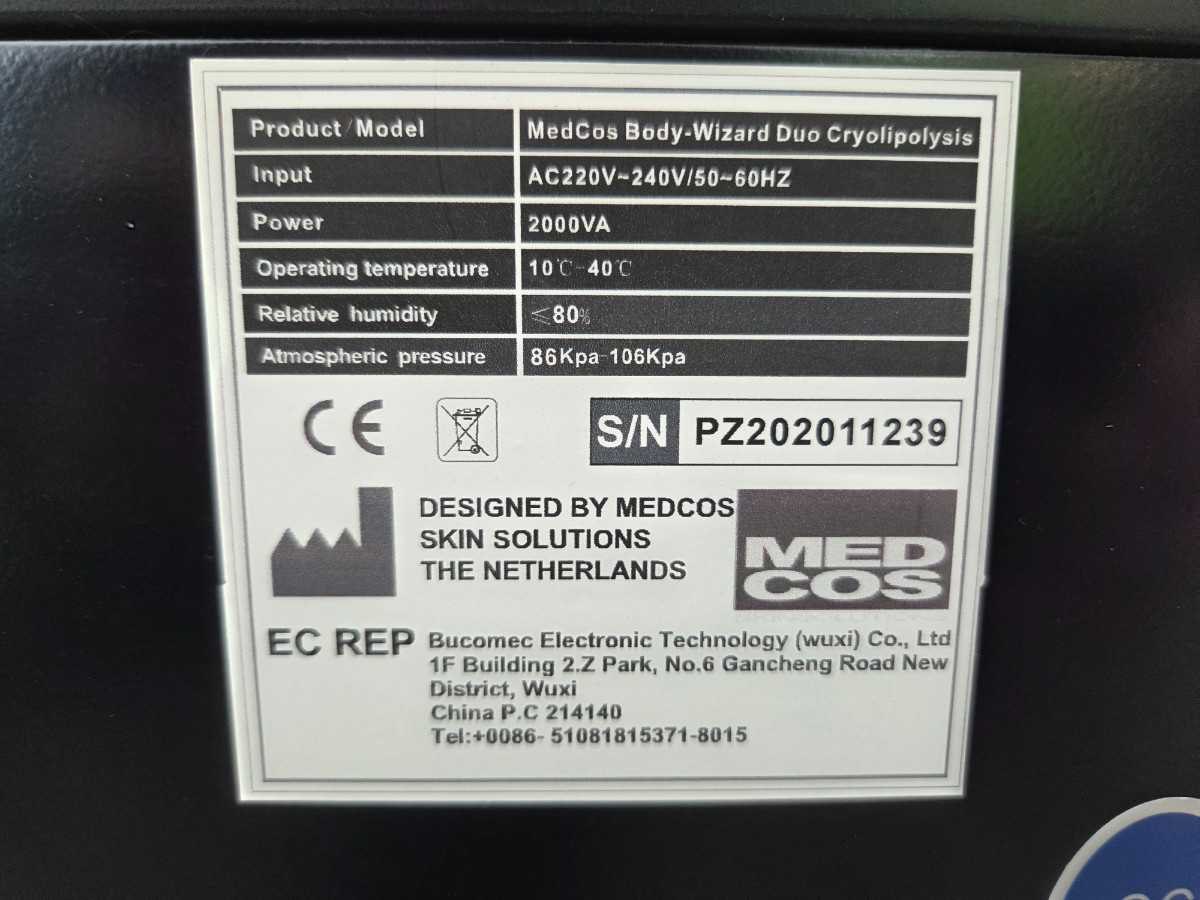 Verrijdbaar; Voorzien van 4 behandelkoppen/kanalen; 360-graden Peltier-koeling; koelbereik tot -10 graden; touchscreen interface Merk: MedCos Type: Body Wizard Duo Serienummer: PZ202011239 Aansluiting: 230V