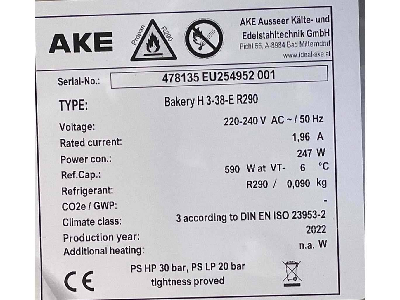Koelcapaciteit: 590 W bij VT -6°C, Koelmiddel: R290 (0,090 kg), Klimaatklasse: 3 Merk: AKE Type: Bakery H 3-38-E R290 Bouwjaar: 2022 Materiaal: RVS Ingebouwde koelcompressor: true Serienummer: 478135 EU254952 001 Temperatuurbereik max.: 8°c Aansluiting: 230V Temperatuurbereik min.: 2°c Digitale uitlezing: true Totale afmeting L: 1290mm Totale afmeting Breedte: 770mm Totale afmeting Hoogte: 660mm Rvs: true