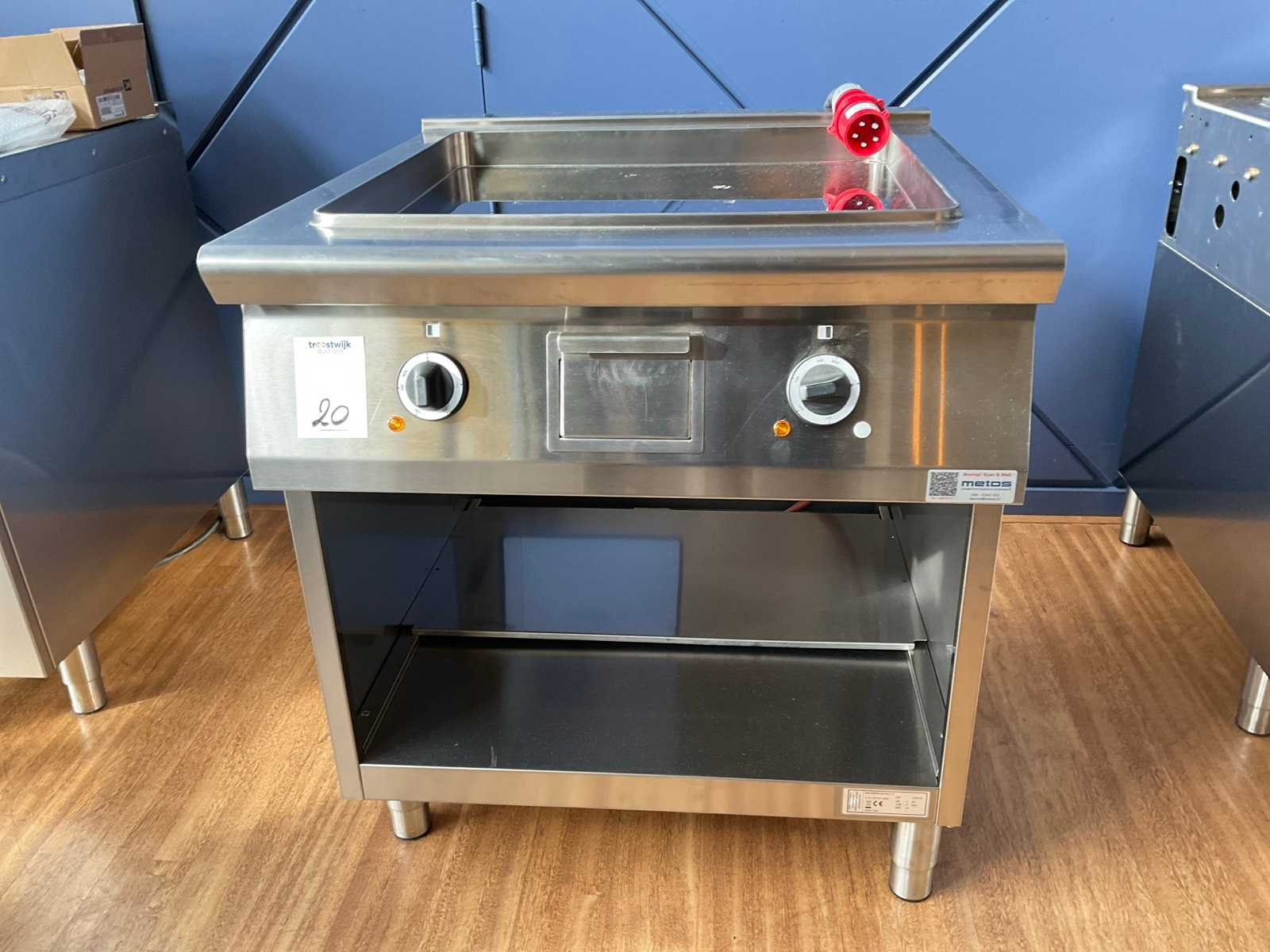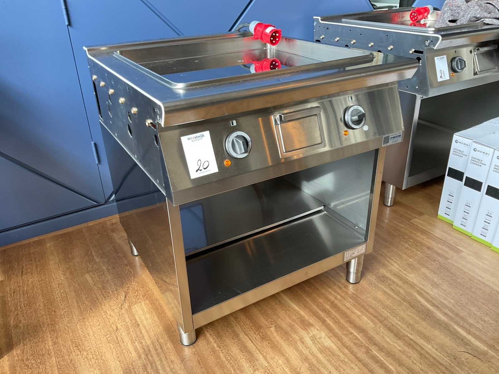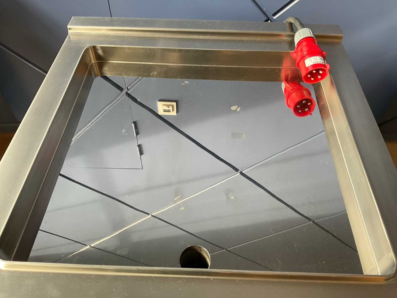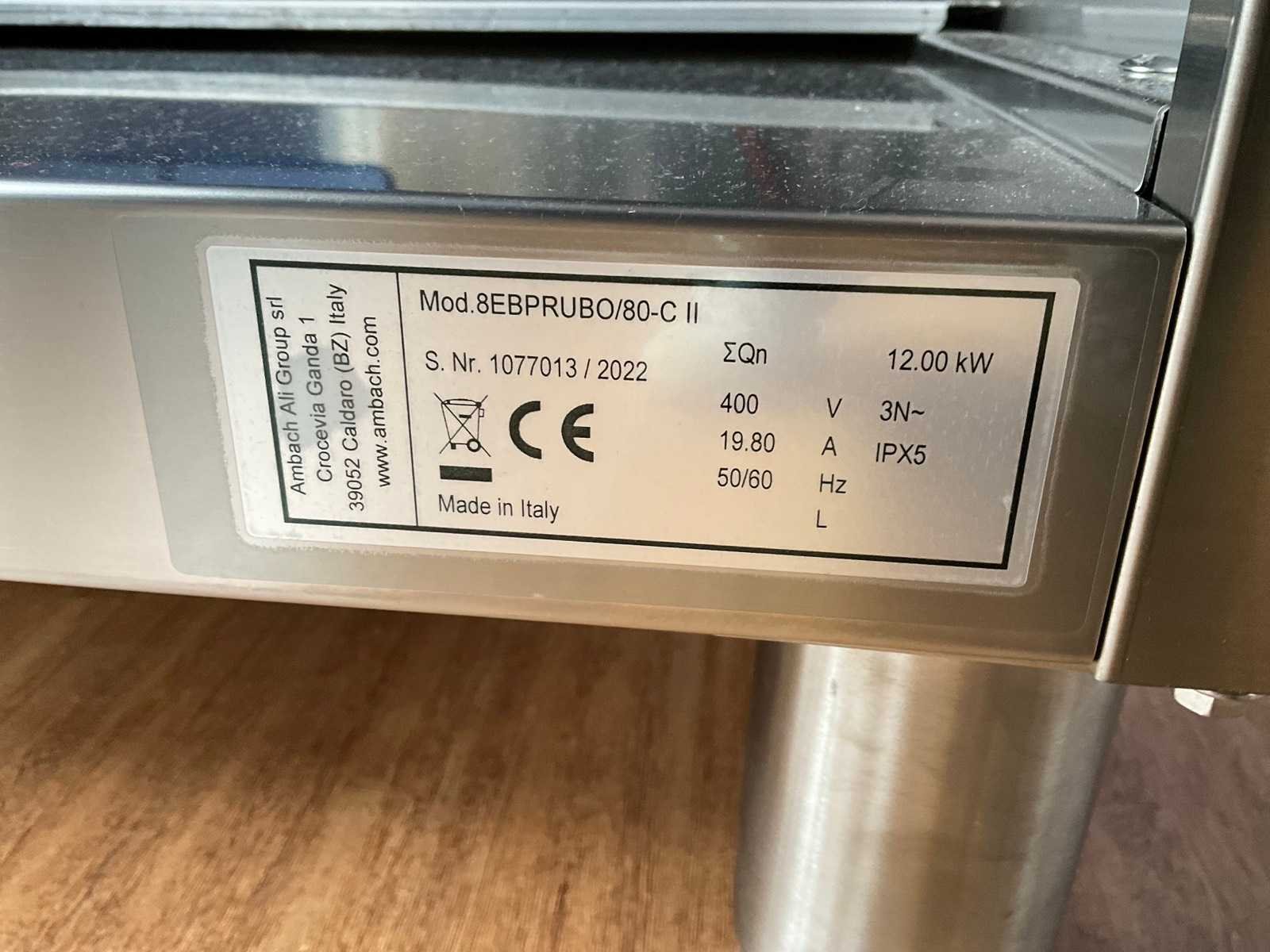 Bouwjaar: 2022, Serienummer: 1077013, Vermogen: 12,0 kW, Aansluiting: 400V, Beschermingsklasse: IPX5, Plaat oppervlak: 650x600mm, 2 regelzones, Onderkast uitvoering. Merk: Ambach Model: 8EBPRUBO/80-C II Materiaal: RVS Totale afmeting Breedte: 800mm Totale afmeting L: 850mm Totale afmeting Hoogte: 920mm