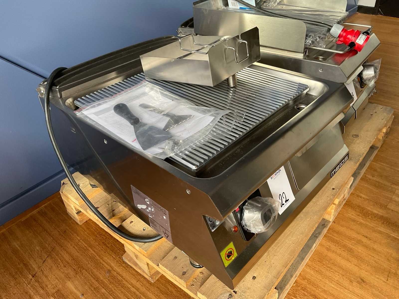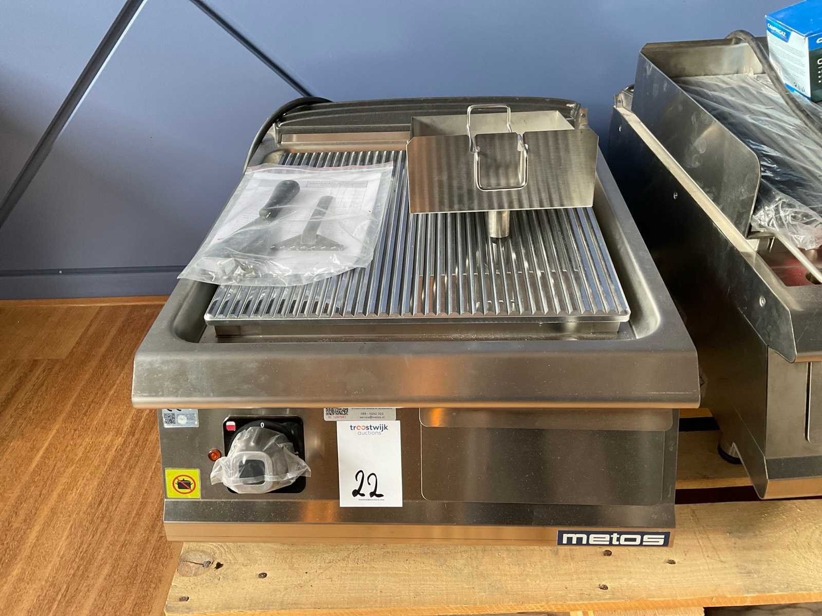 Bouwjaar: 2023, Serienummer: BN020345857, Voltage: 400v, Vermogen: 5,40 kW, Beschermingsklasse: IPX4, Grill oppervlak: 500x490mm, Temperatuur bereik: 110 - 280C°. Merk: Metos Model: D73/10TSFTECR Materiaal: RVS Totale afmeting Breedte: 600mm Totale afmeting L: 760mm Totale afmeting Hoogte: 350mm