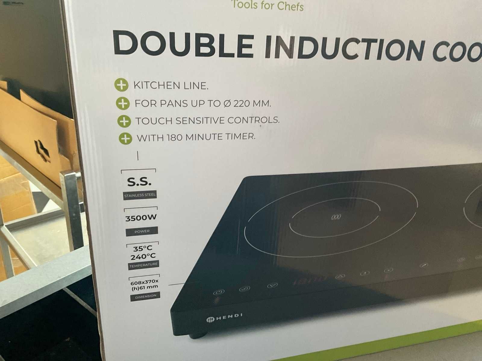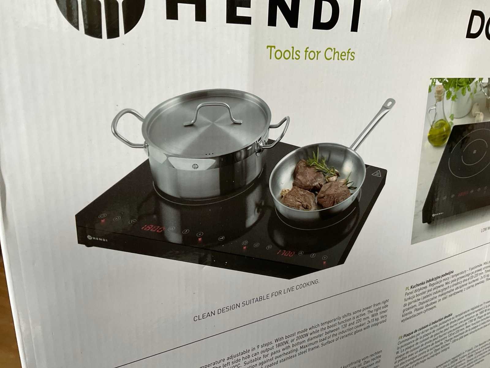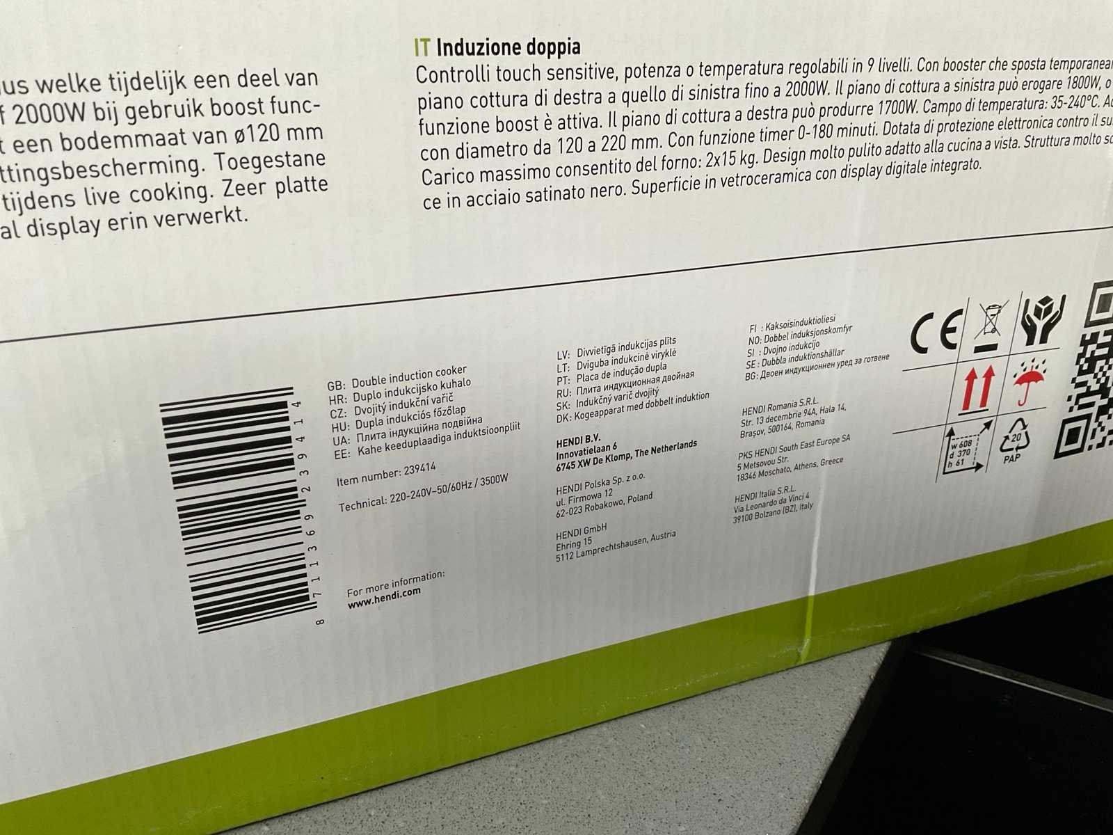 Voltage: 230v, Vermogen: 3500W, Temperatuur bereik: 35 - 240 C°, maximale pan diameter: 22cm. Merk: Hendi Model: 239414 Lengte: 61cm Breedte: 37cm Hoogte: 6cm Materiaal: RVS