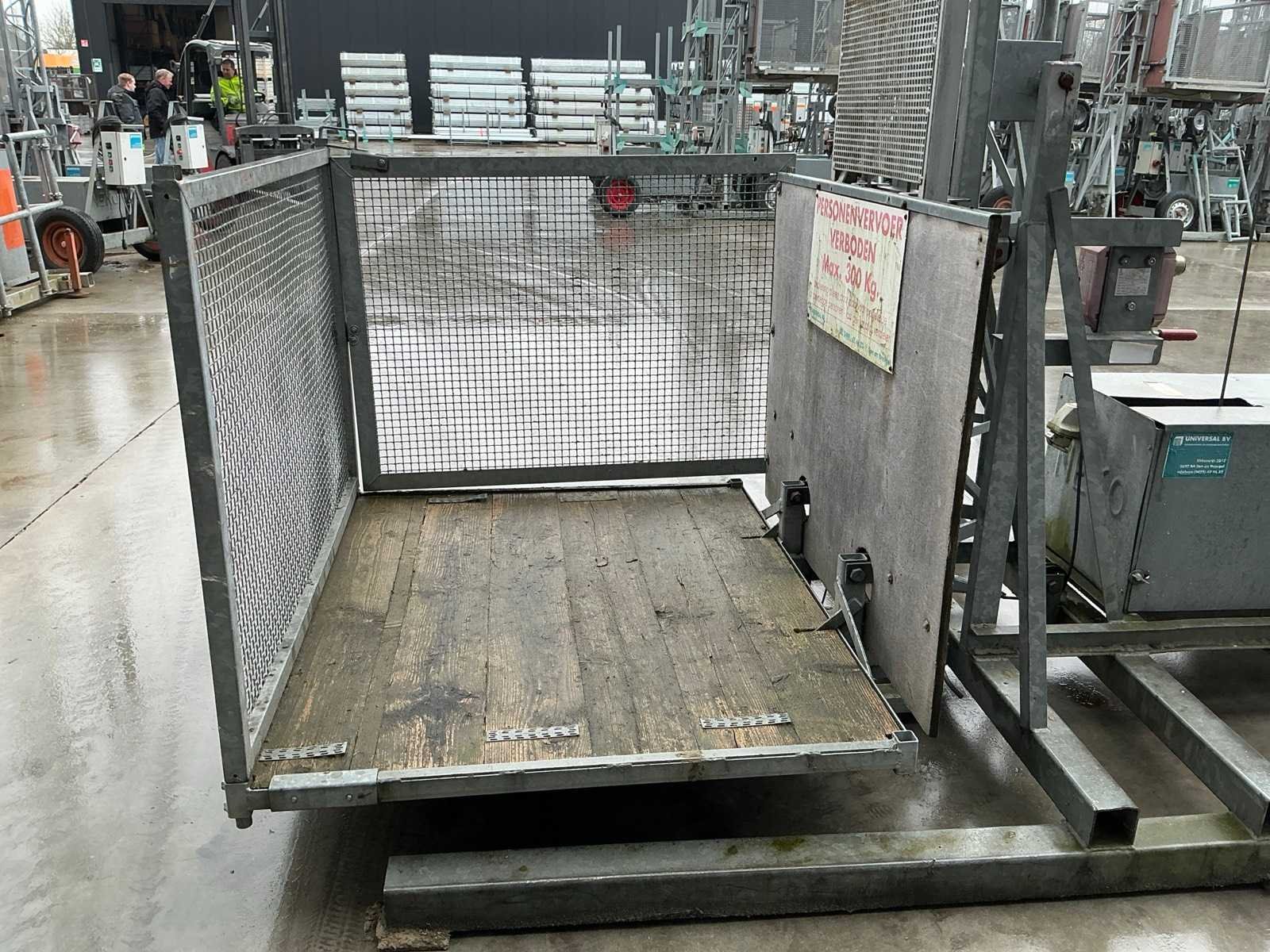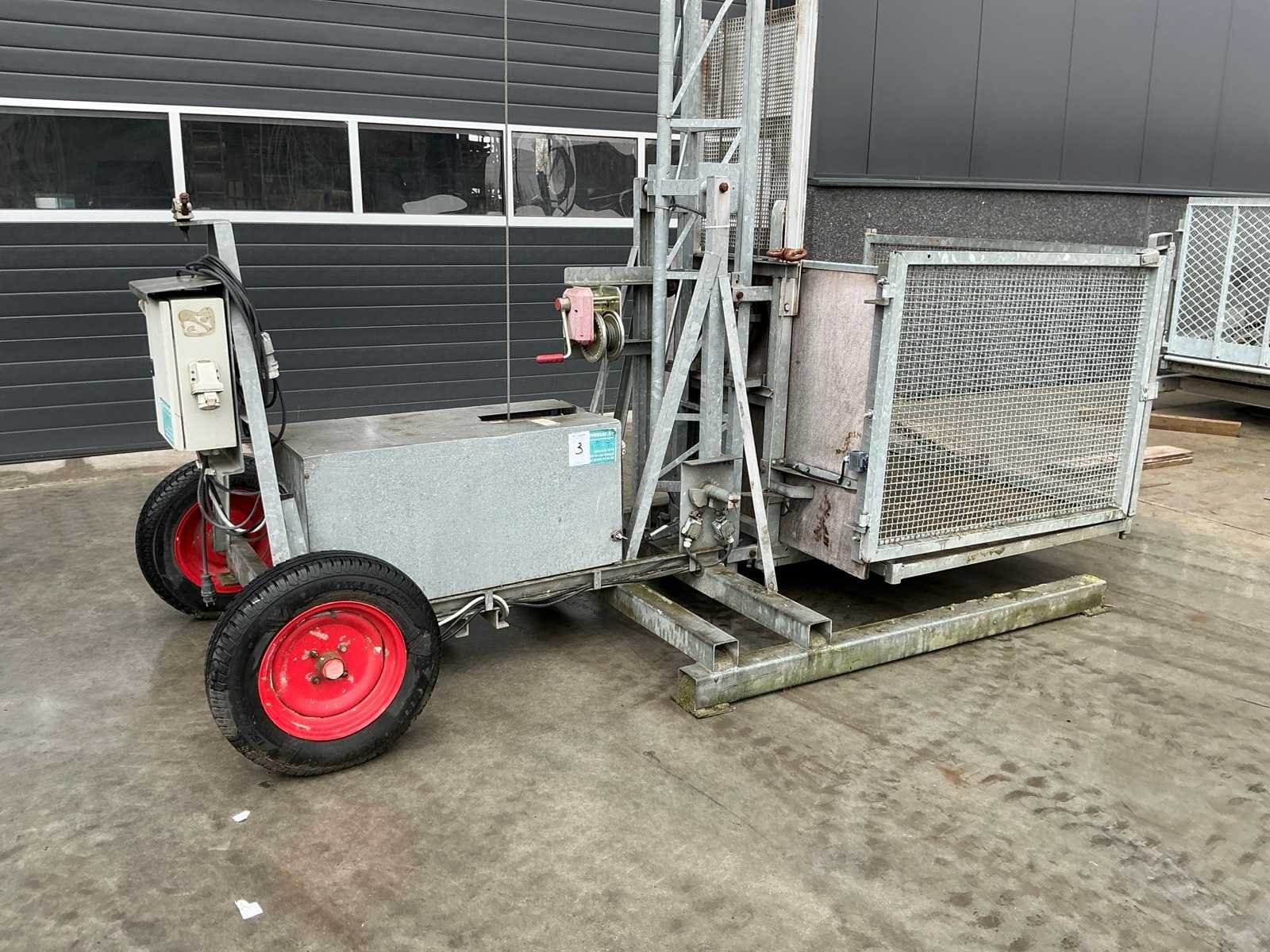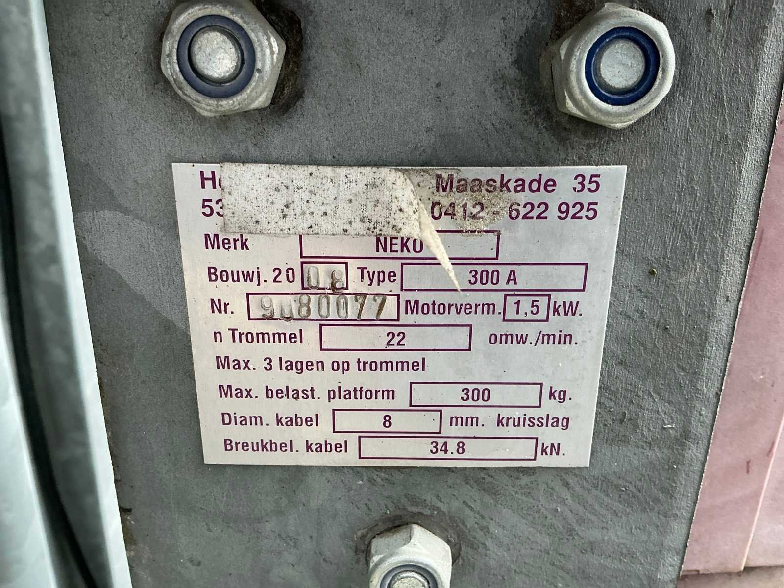 Basis mast 600 cm; met extra 1x 150 cm mastdeel; voorzien van kogelkoppeling voor trekhaak; elektrische aangedreven; alsook voorzien van handlier. Merk: Neko Type: 300A Bouwjaar: 2008 Serienummer: 9080077 Staalkabel: true Max. belasting: 300kg Hefhoogte: 6m Vrijstaande masthoogte: 7.5m Plateau afm. l: 1500mm Plateau afm. b: 1250mm Aantal mastdelen: 1 Aansluiting: 2V Motorvermogen (kW): 1.1kW