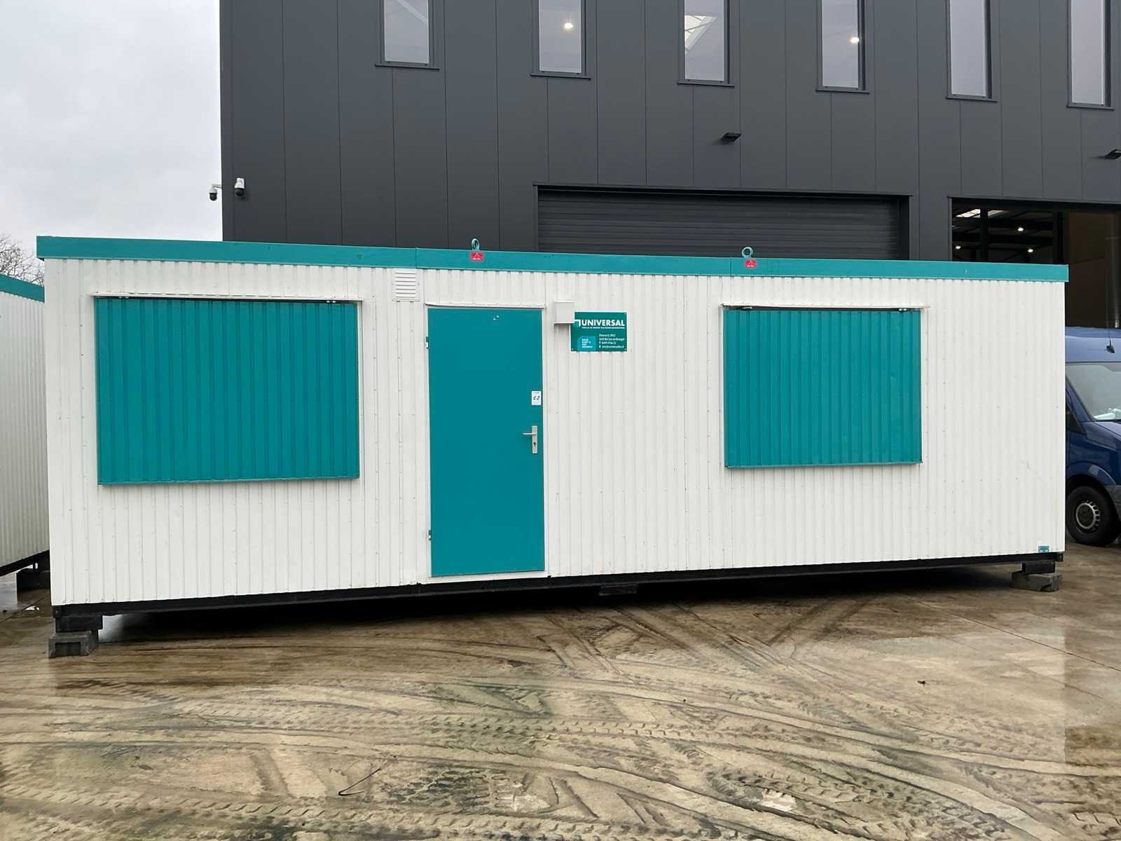 Opgedeeld in 3 ruimtes; 2x kantoor; 1x inkomtuimte met wastafel en toilet; elektrische kachel; verlichting; 2x stopcontact per ruimte; aansluiting 400 Volt 32 Ampère; ramen voorzien van luiken; tafels, stoelen; voorzien van 4x hijsoog Aantal ramen: 2 Toilet: true Totale afmeting L: 8080mm Totale afmeting Breedte: 3000mm Totale afmeting Hoogte: 2750mm