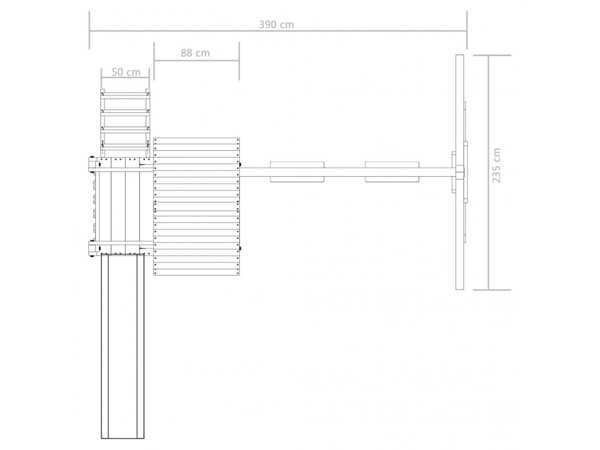Palen 9x9cm Glijbaan kunststof Met 2 schommel zitjes Geleverd in bouwpakket met bevestigingsmateriaal en handleiding. Lengte: 235cm Breedte: 385cm Hoogte: 268cm Materiaal: geïmpregneerd grenen