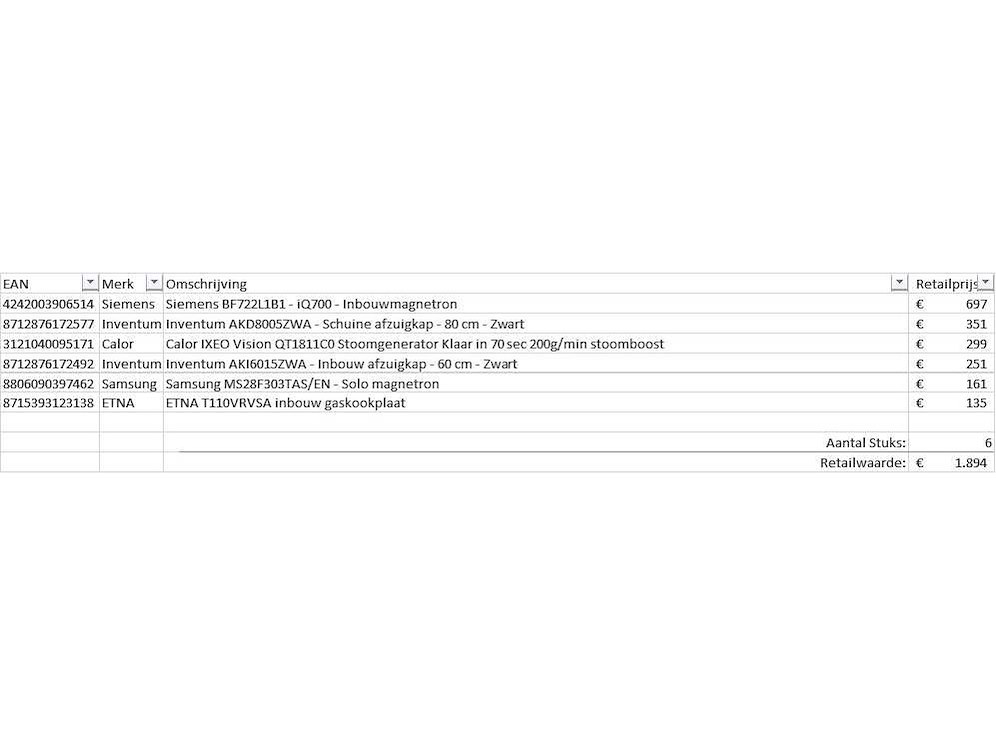 Dit betreft een partij A-merk retourgoederen van een grote online retailer. De partij bestaat uit diverse productcategorieën. Aantal stuks: 6. Retailwaarde: €1894,- Ongecontroleerd: werking onbekend (mix van werkend, incompleet, beschadigd, te gebruiken voor onderdelen). Kom op de kijkdag om te om zo een goed beeld te krijgen van de reden van retour. Zie foto's voor lijst met inhoud. Bezorgtermijn 14 dagen Merk: Pallet Retourgoederen