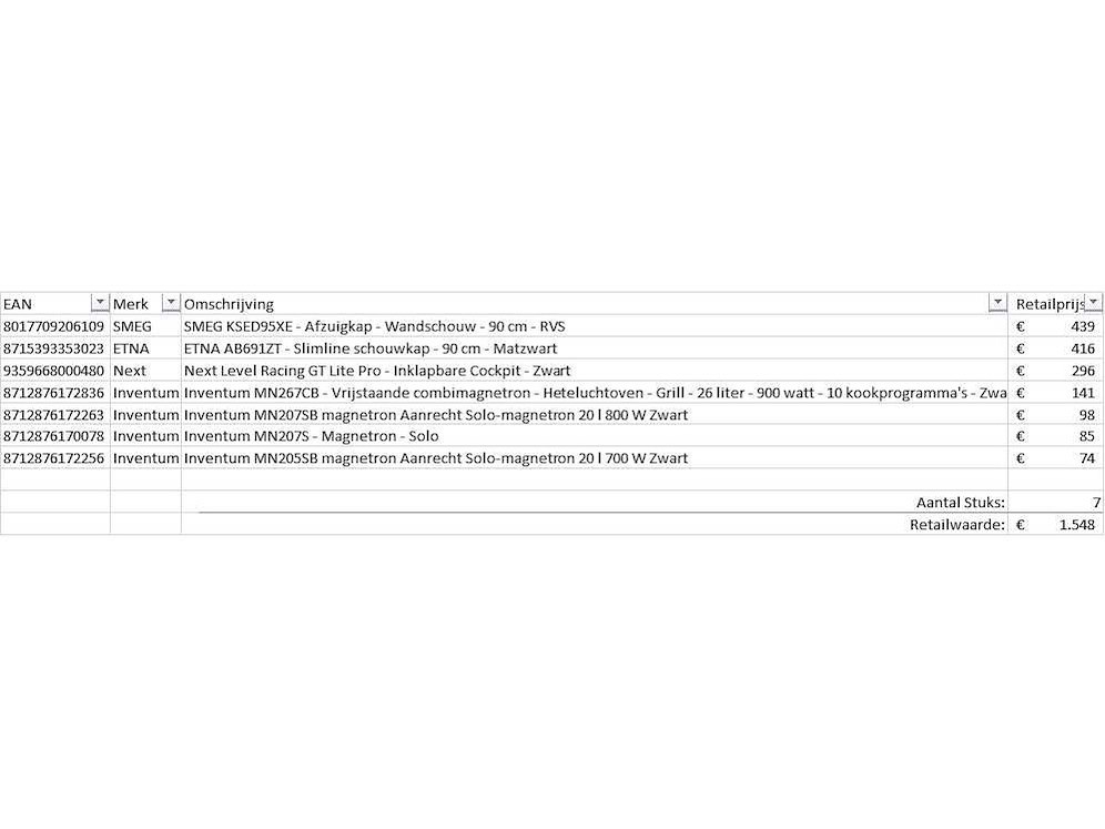 Dit betreft een partij A-merk retourgoederen van een grote online retailer. De partij bestaat uit diverse productcategorieën. Aantal stuks: 7. Retailwaarde: €1548,- Ongecontroleerd: werking onbekend (mix van werkend, incompleet, beschadigd, te gebruiken voor onderdelen). Kom op de kijkdag om te om zo een goed beeld te krijgen van de reden van retour. Zie foto's voor lijst met inhoud. Bezorgtermijn 14 dagen Merk: Pallet Retourgoederen