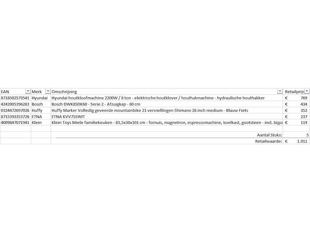 Dit betreft een partij A-merk retourgoederen van een grote online retailer. De partij bestaat uit diverse productcategorieën. Aantal stuks: 5. Retailwaarde: €1911,- Ongecontroleerd: werking onbekend (mix van werkend, incompleet, beschadigd, te gebruiken voor onderdelen). Kom op de kijkdag om te om zo een goed beeld te krijgen van de reden van retour. Zie foto's voor lijst met inhoud. Bezorgtermijn 14 dagen Merk: Pallet Retourgoederen