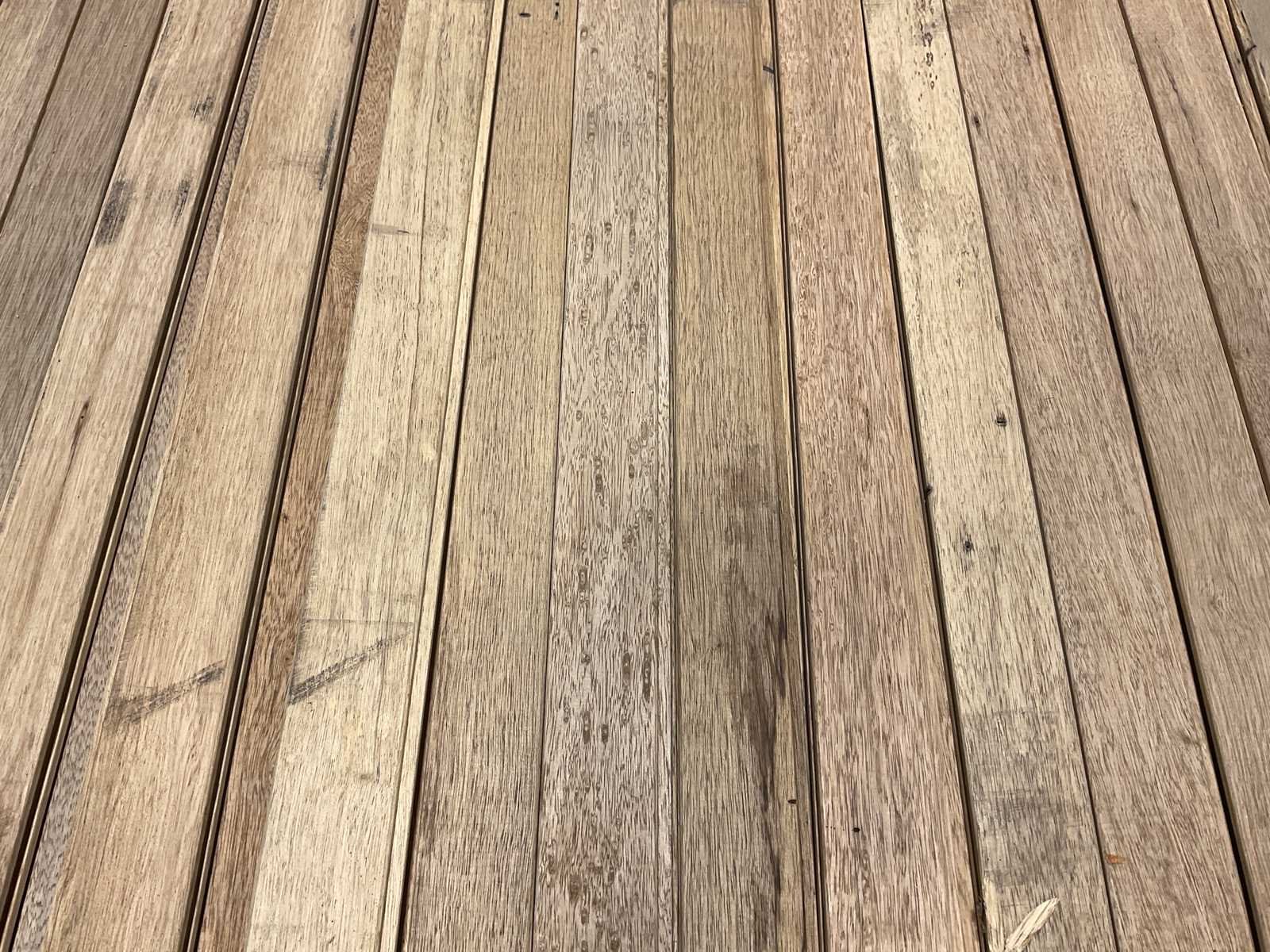 Mix partij diverse wit Afrikaans eikenhouten planken fraké mes & groef, diverse lengtes van 330 tot 520 cm x 6,5 breed x 2 cm dik. Zie foto's voor details. Model: Plank Materiaal: Fraké