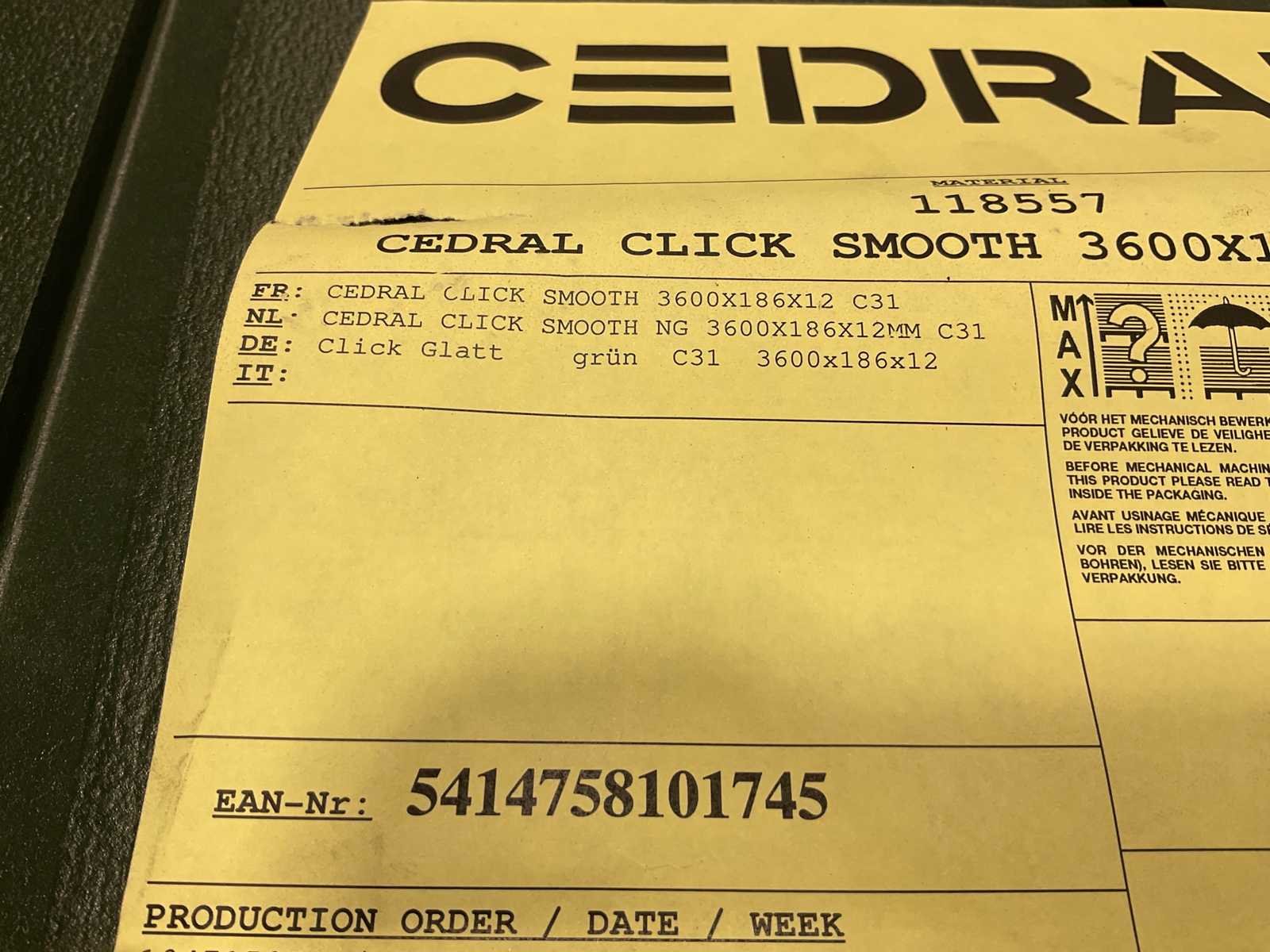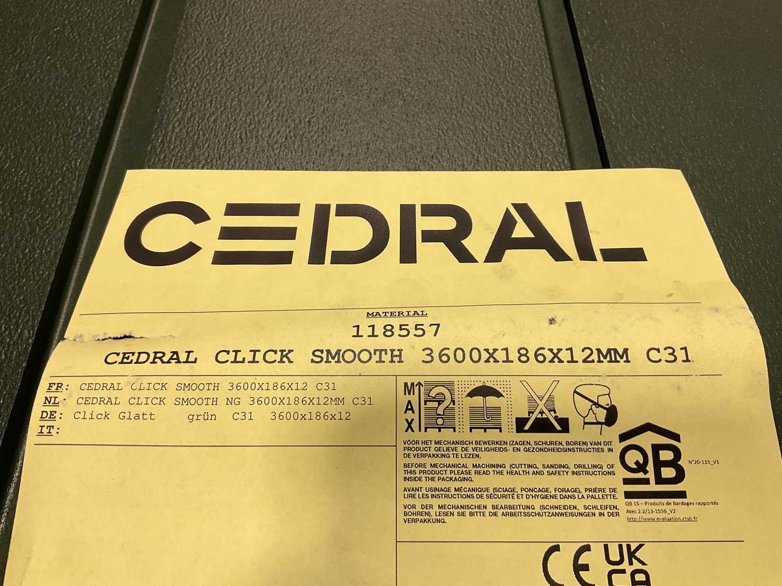 Cedral Click Smooth 3600x186x12 mm gevelplaten Brandklasse: A2-s1, d0 Gewicht per plank: 12,86 kg Merk: Cedral Model: Click Smooth Product type: Gevelstrook Kleur: Engelsgroen Lengte: 360cm Breedte: 18,6cm Hoogte: 1,2cm Materiaal: Cementvezel